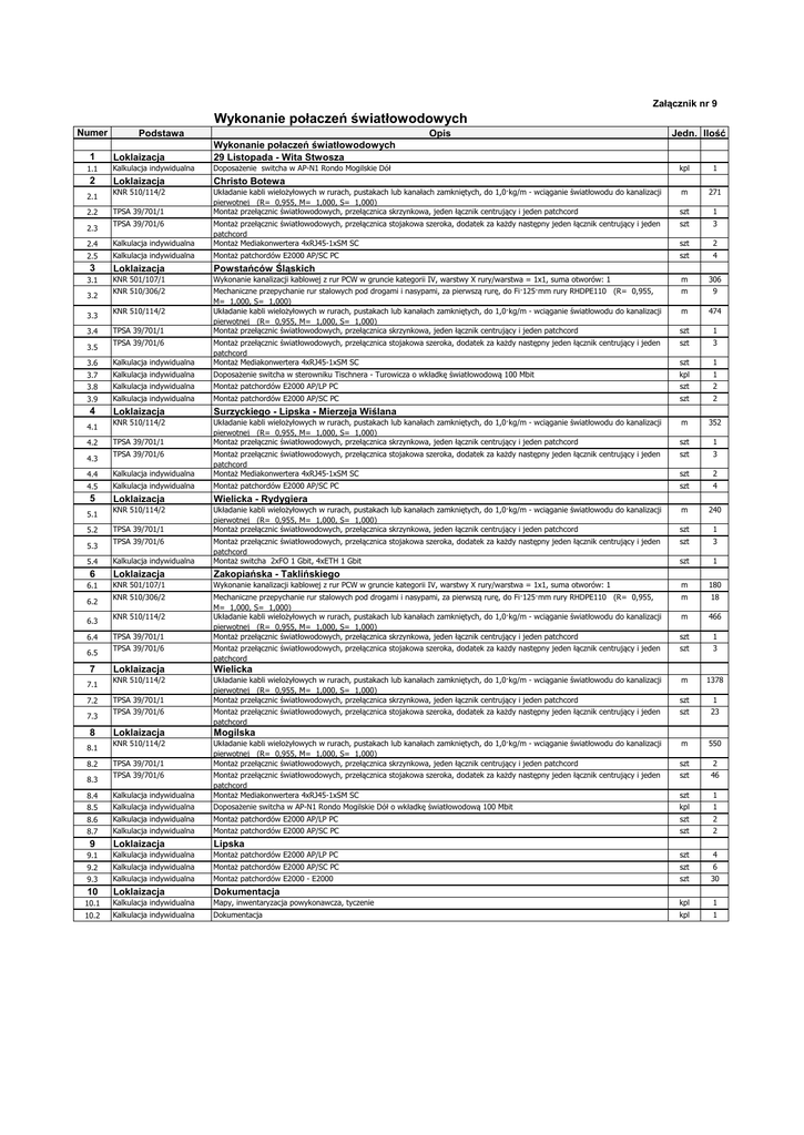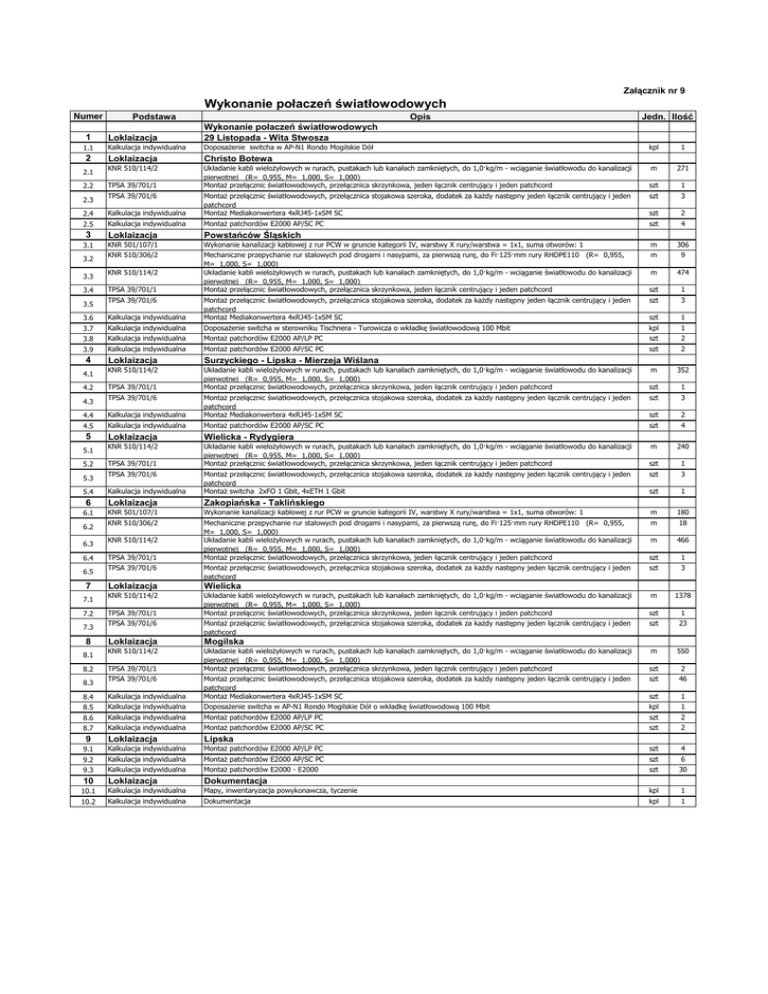 Załącznik nr 9 Wykonanie połaczeń światłowodowych Numer 1 1.1 2 2.1 2.2 Podstawa Opis Loklaizacja Wykonanie połaczeń światłowodowych 29 Listopada - Wita Stwosza Kalkulacja indywidualna Doposażenie switcha w AP-N1 Rondo Mogilskie Dół Loklaizacja Christo Botewa KNR 510/114/2 Układanie kabli wielożyłowych w rurach, pustakach lub kanałach zamkniętych, do 1,0·kg/m - wciąganie światłowodu do kanalizacji pierwotnej (R= 0,955, M= 1,000, S= 1,000) Montaż przełącznic światłowodowych, przełącznica skrzynkowa, jeden łącznik centrujący i jeden patchcord TPSA 39/701/1 kpl 1 m 271 szt 1 szt 3 szt 2 szt 4 2.4 Kalkulacja indywidualna Montaż przełącznic światłowodowych, przełącznica stojakowa szeroka, dodatek za każdy następny jeden łącznik centrujący i jeden patchcord Montaż Mediakonwertera 4xRJ45-1xSM SC 2.5 Kalkulacja indywidualna Montaż patchordów E2000 AP/SC PC 3 Loklaizacja Powstańców Śląskich 3.1 KNR 501/107/1 Wykonanie kanalizacji kablowej z rur PCW w gruncie kategorii IV, warstwy X rury/warstwa = 1x1, suma otworów: 1 m 306 KNR 510/306/2 Mechaniczne przepychanie rur stalowych pod drogami i nasypami, za pierwszą rurę, do Fi·125·mm rury RHDPE110 (R= 0,955, M= 1,000, S= 1,000) Układanie kabli wielożyłowych w rurach, pustakach lub kanałach zamkniętych, do 1,0·kg/m - wciąganie światłowodu do kanalizacji pierwotnej (R= 0,955, M= 1,000, S= 1,000) Montaż przełącznic światłowodowych, przełącznica skrzynkowa, jeden łącznik centrujący i jeden patchcord m 9 2.3 3.2 3.3 3.4 TPSA 39/701/6 Jedn. Ilość KNR 510/114/2 TPSA 39/701/1 474 1 szt 3 szt 1 3.6 Kalkulacja indywidualna Montaż przełącznic światłowodowych, przełącznica stojakowa szeroka, dodatek za każdy następny jeden łącznik centrujący i jeden patchcord Montaż Mediakonwertera 4xRJ45-1xSM SC 3.7 Kalkulacja indywidualna Doposażenie switcha w sterowniku Tischnera - Turowicza o wkładkę światłowodową 100 Mbit kpl 1 3.8 Kalkulacja indywidualna Montaż patchordów E2000 AP/LP PC szt 2 3.9 Kalkulacja indywidualna Montaż patchordów E2000 AP/SC PC szt 2 Loklaizacja Surzyckiego - Lipska - Mierzeja Wiślana KNR 510/114/2 Układanie kabli wielożyłowych w rurach, pustakach lub kanałach zamkniętych, do 1,0·kg/m - wciąganie światłowodu do kanalizacji pierwotnej (R= 0,955, M= 1,000, S= 1,000) Montaż przełącznic światłowodowych, przełącznica skrzynkowa, jeden łącznik centrujący i jeden patchcord m 352 3.5 4 4.1 4.2 TPSA 39/701/6 m szt TPSA 39/701/1 4.4 Kalkulacja indywidualna Montaż przełącznic światłowodowych, przełącznica stojakowa szeroka, dodatek za każdy następny jeden łącznik centrujący i jeden patchcord Montaż Mediakonwertera 4xRJ45-1xSM SC 4.5 Kalkulacja indywidualna Montaż patchordów E2000 AP/SC PC Loklaizacja Wielicka - Rydygiera KNR 510/114/2 Układanie kabli wielożyłowych w rurach, pustakach lub kanałach zamkniętych, do 1,0·kg/m - wciąganie światłowodu do kanalizacji pierwotnej (R= 0,955, M= 1,000, S= 1,000) Montaż przełącznic światłowodowych, przełącznica skrzynkowa, jeden łącznik centrujący i jeden patchcord 4.3 5 5.1 5.2 TPSA 39/701/6 TPSA 39/701/1 1 szt 3 szt 2 szt 4 m 240 szt 1 szt 3 szt 1 180 Kalkulacja indywidualna Montaż przełącznic światłowodowych, przełącznica stojakowa szeroka, dodatek za każdy następny jeden łącznik centrujący i jeden patchcord Montaż switcha 2xFO 1 Gbit, 4xETH 1 Gbit 6 Loklaizacja Zakopiańska - Taklińskiego 6.1 KNR 501/107/1 Wykonanie kanalizacji kablowej z rur PCW w gruncie kategorii IV, warstwy X rury/warstwa = 1x1, suma otworów: 1 m KNR 510/306/2 Mechaniczne przepychanie rur stalowych pod drogami i nasypami, za pierwszą rurę, do Fi·125·mm rury RHDPE110 (R= 0,955, M= 1,000, S= 1,000) Układanie kabli wielożyłowych w rurach, pustakach lub kanałach zamkniętych, do 1,0·kg/m - wciąganie światłowodu do kanalizacji pierwotnej (R= 0,955, M= 1,000, S= 1,000) Montaż przełącznic światłowodowych, przełącznica skrzynkowa, jeden łącznik centrujący i jeden patchcord m 18 m 466 szt 1 szt 3 m 1378 5.3 5.4 6.2 6.3 6.4 6.5 7 7.1 7.2 7.3 8 8.1 8.2 TPSA 39/701/6 szt KNR 510/114/2 TPSA 39/701/1 TPSA 39/701/6 Montaż przełącznic światłowodowych, przełącznica stojakowa szeroka, dodatek za każdy następny jeden łącznik centrujący i jeden patchcord Loklaizacja Wielicka KNR 510/114/2 Układanie kabli wielożyłowych w rurach, pustakach lub kanałach zamkniętych, do 1,0·kg/m - wciąganie światłowodu do kanalizacji pierwotnej (R= 0,955, M= 1,000, S= 1,000) Montaż przełącznic światłowodowych, przełącznica skrzynkowa, jeden łącznik centrujący i jeden patchcord TPSA 39/701/1 TPSA 39/701/6 Montaż przełącznic światłowodowych, przełącznica stojakowa szeroka, dodatek za każdy następny jeden łącznik centrujący i jeden patchcord Loklaizacja Mogilska KNR 510/114/2 Układanie kabli wielożyłowych w rurach, pustakach lub kanałach zamkniętych, do 1,0·kg/m - wciąganie światłowodu do kanalizacji pierwotnej (R= 0,955, M= 1,000, S= 1,000) Montaż przełącznic światłowodowych, przełącznica skrzynkowa, jeden łącznik centrujący i jeden patchcord TPSA 39/701/1 1 szt 23 m 550 szt 2 szt 46 8.4 Kalkulacja indywidualna Montaż przełącznic światłowodowych, przełącznica stojakowa szeroka, dodatek za każdy następny jeden łącznik centrujący i jeden patchcord Montaż Mediakonwertera 4xRJ45-1xSM SC szt 1 8.5 Kalkulacja indywidualna Doposażenie switcha w AP-N1 Rondo Mogilskie Dół o wkładkę światłowodową 100 Mbit kpl 1 8.6 Kalkulacja indywidualna Montaż patchordów E2000 AP/LP PC szt 2 8.7 Kalkulacja indywidualna Montaż patchordów E2000 AP/SC PC szt 2 Loklaizacja Lipska 9.1 Kalkulacja indywidualna Montaż patchordów E2000 AP/LP PC szt 4 9.2 Kalkulacja indywidualna Montaż patchordów E2000 AP/SC PC szt 6 9.3 Kalkulacja indywidualna Montaż patchordów E2000 - E2000 szt 30 8.3 9 TPSA 39/701/6 szt 10 Loklaizacja Dokumentacja 10.1 Kalkula
