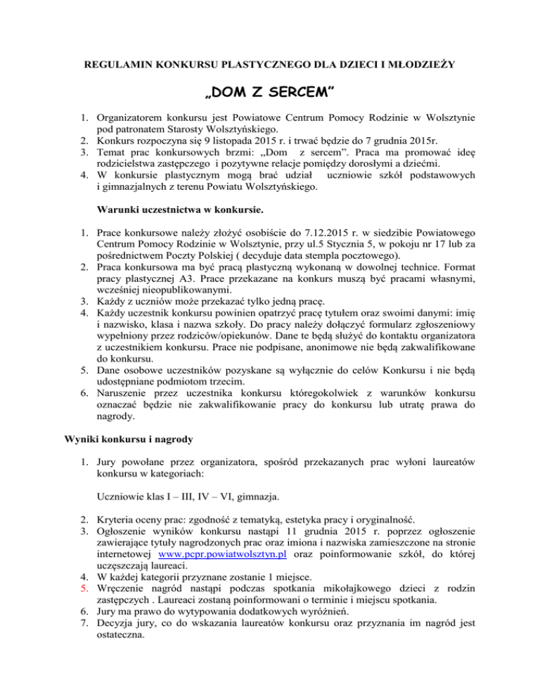 REGULAMIN KONKURSU PLASTYCZNEGO DLA DZIECI I MŁODZIEŻY „DOM Z SERCEM” 1. Organizatorem konkursu jest Powiatowe Centrum Pomocy Rodzinie w Wolsztynie pod patronatem Starosty Wolsztyńskiego. 2. Konkurs rozpoczyna się 9 listopada 2015 r. i trwać będzie do 7 grudnia 2015r. 3. Temat prac konkursowych brzmi: „Dom z sercem”. Praca ma promować ideę rodzicielstwa zastępczego i pozytywne relacje pomiędzy dorosłymi a dziećmi. 4. W konkursie plastycznym mogą brać udział uczniowie szkół podstawowych i gimnazjalnych z terenu Powiatu Wolsztyńskiego. Warunki uczestnictwa w konkursie. 1. Prace konkursowe należy złożyć osobiście do 7.12.2015 r. w siedzibie Powiatowego Centrum Pomocy Rodzinie w Wolsztynie, przy ul.5 Stycznia 5, w pokoju nr 17 lub za pośrednictwem Poczty Polskiej ( decyduje data stempla pocztowego). 2. Praca konkursowa ma być pracą plastyczną wykonaną w dowolnej technice. Format pracy plastycznej A3. Prace przekazane na konkurs muszą być pracami własnymi, wcześniej nieopublikowanymi. 3. Każdy z uczniów może przekazać tylko jedną pracę. 4. Każdy uczestnik konkursu powinien opatrzyć pracę tytułem oraz swoimi danymi: imię i nazwisko, klasa i nazwa szkoły. Do pracy należy dołączyć formularz zgłoszeniowy wypełniony przez rodziców/opiekunów. Dane te będą służyć do kontaktu organizatora z uczestnikiem konkursu. Prace nie podpisane, anonimowe nie będą zakwalifikowane do konkursu. 5. Dane osobowe uczestników pozyskane są wyłącznie do celów Konkursu i nie będą udostępniane podmiotom trzecim. 6. Naruszenie przez uczestnika konkursu któregokolwiek z warunków konkursu oznaczać będzie nie zakwalifikowanie pracy do konkursu lub utratę prawa do nagrody. Wyniki konkursu i nagrody 1. Jury powołane przez organizatora, spośród przekazanych prac wyłoni laureatów konkursu w kategoriach: Uczniowie klas I – III, IV – VI, gimnazja. 2. Kryteria oceny prac: zgodność z tematyką, estetyka pracy i oryginalność. 3. Ogłoszenie wyników konkursu nastąpi 11 grudnia 2015 r. poprzez ogłoszenie zawierające tytuły nagrodzonych prac oraz imiona i nazwiska zamieszczone na stronie internetowej www.pcpr.powiatwolsztyn.pl oraz poinformowanie szkół, do której uczęszczają laureaci. 4. W każdej kategorii przyznane zostanie 1 miejsce. 5. Wręczenie nagród nastąpi podczas spotkania mikołajkowego dzieci z rodzin zastępczych . Laureaci zostaną poinformowani o terminie i miejscu spotkania. 6. Jury ma prawo do wytypowania dodatkowych wyróżnień. 7. Decyzja jury, co do wskazania laureatów konkursu oraz przyznania im nagród jest ostateczna. 8. Nagrody rzeczowe nie podlegają zamianie na inne nagrody rzeczowe, ani na ich równowartość pieniężną. Postanowienia końcowe: 1. Biorąc udział w konkursie, uczestnik akceptuje jego regulamin. 2. Zwycięskie prace stają się własnością Organizatora. 3. Regulamin niniejszego konkursu będzie dostępny www.pcpr.powiatwolsztyn.pl. 4. Organizator zastrzega sobie prawo do: na stronie a) zmiany postanowień niniejszego regulaminu w przypadku zmian przepisów prawnych lub innych istotnych zdarzeń mających wpływ na organizowanie Konkursu. b) nierozstrzygnięcia konkursu w przypadku zbyt małej ilości przekazanych prac, d) rozstrzygania w kwestiach nieuregulowanych postanowieniami regulaminu. Dodatkowe informacje można uzyskać u p. Magdaleny Burzyńskiej pod nr tel. 605 411 971. Formularz zgłoszeniowy do konkursu plastycznego „Dom z Sercem” Proszę wypełnić drukowanymi literami Imię:…………………………………………………………….. Nazwisko:……………………………………………………… Data urodzenia:_____._____._______ r. Klasa:…………. …………………………………………………………………………………………….. Ulica, nr domu, mieszkania: Kod pocztowy:____ - ______ Miejscowość:………………………………………… Szkoła (nazwa)…………………………………………………………………………... Adres szkoły:……………………………………………………………………………... Klasa………………………………………………………………………………………. Telefon opiekuna (___) _____ - ____ - ____ Tel. kom.0 _____ - _____ - _____ Oświadczam, że zapoznałem się z REGULAMINEM i go akceptuję. Wyrażam zgodę na przetwarzanie i wykorzystanie moich danych osobowych zgodnie z zasadami określonymi w ustawie z dnia 29 sierpnia 1997 r. o ochronie danych osobowych (Dz. U. z 2002 r. Nr 101, poz. 926 z późn. zm.) do celów informacyjnych i marketingowych przez Powiatowe Centrum Pomocy Rodzinie w Wolsztynie, w tym na upublicznienie mojego nazwiska w celu przeprowadzenia KONKURSU oraz prezentację mojego wizerunku wraz z danymi określonymi w REGULAMINIE. ……………………………………… …………………………………… (Miejscowość, data) (Podpis uczestnika) ………………………………….. (Podpis rodzica/opiekuna) Dla rodziców lub opiekunów Wyrażam zgodę na udział …………………………………………………………………………………… w konkursie plastycznym „Dom z Sercem” …………….……………………… (Miejscowość, data) imię i nazwisko dziecka ……………………………………………………. (podpis rodzica lub opiekuna osoby nieletniej)