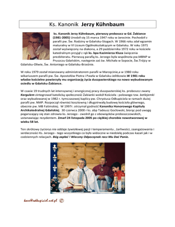 Ks. Kanonik Jerzy Kühnbaum ks. Kanonik Jerzy Kühnbaum, pierwszy proboszcz w Gd. Żabiance (1981-2005) Urodził się 15 marca 1947 roku w Jarocinie. Pochodził z parafii pw. Św. Rodziny w Gdańsku-Stogach. W 1966 roku zdał egzamin maturalny w VI Liceum Ogólnokształcącym w Gdańsku. W roku 1971 został wyświęcony na diakona, a 29 października 1972 roku w kościele katedralnym przyjął z rąk ks. bpa Kazimierza Kluza święcenia prezbiteratu. Pierwszą parafią ks. Jerzego była wspólnota pw.MBNP w Pruszczu Gdańskim, następnie zaś św. Michała w Sopocie, Św.Trójcy w Gdańsku-Oliwie, Św. Antoniego w Gdańsku-Brzeźnie. W roku 1979 został mianowany administratorem parafii w Marzęcinie,a w 1980 roku wikariuszem parafii pw. Św. Apostołów Piotra i Pawła w Gdańsku-Jelitkowie.W 1981 roku władze kościelne powierzyły mu organizację życia duszpasterskiego na nowo wybudowanym osiedlu w Gdańsku-Żabiance. W czasie 19 trudnych lat intensywnej i energicznej pracy duszpasterskiej ks. proboszcz zwany Kargulem zintegrował katolicką społeczność Żabianki wokół Kościoła : polowego tzw. betlejemki oraz wybudowanej w 1982 r. tymczasowej kaplicy pw. Chrystusa Odkupiciela w ramach dużej parafii pw. NMP. Rozpoczął również kosztowną i długotrwałą budowę kościoła głównego, obecnie pw. MB Fatimskiej. W 1997r. otrzymał godność Kanonika Honorowego Kapituły Archikatedralnej Gdańskiej. 30 czerwca 2000 r ks. abp Tadeusz Gocłowski, biorąc pod uwagę pogarszający się stan zdrowia ks. Jerzego - zwolnił go z obowiązków proboszczowskich, ustanawiając rezydentem. Zmarł 24 listopada 2005 po ciężkiej chorobie nowotworowej w wieku 58 lat. Ten skrótowy życiorys nie oddaje żywiołewej pasji i temperamentu , żarliwości, zaangażowania i serdeczności Ks. Jerzego - tego wszystkiego co było widoczne w niedzielę podczas kazań jak i w codziennych relacjach. Bóg zapłać ! Wieczny Odpoczynek racz Mu Dać Panie.