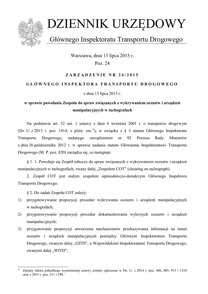 DZIENNIK URZĘDOWY Głównego Inspektoratu Transportu Drogowego Warszawa, dnia 13 lipca 2015 r. Poz. 24 ZARZĄDZENIE NR 24/2015 GŁÓWNEGO INSPEKTORA TRANSPORTU DROGOWEGO z dnia 13 lipca 2015 r. w sprawie powołania Zespołu do spraw związanych z wykrywaniem oszustw i urządzeń manipulacyjnych w tachografach Na podstawie art. 52 ust. 1 ustawy z dnia 6 września 2001 r. o transporcie drogowym (Dz. U. z 2013 r. poz. 1414, z późn. zm.1)), w związku z § 3 statutu Głównego Inspektoratu Transportu Drogowego, nadanego zarządzeniem nr 92 Prezesa Rady Ministrów z dnia 26 października 2012 r. w sprawie nadania statutu Głównemu Inspektoratowi Transportu Drogowego (M. P. poz. 820) zarządza się, co następuje: § 1. 1. Powołuje się Zespół roboczy do spraw związanych z wykrywaniem oszustw i urządzeń manipulacyjnych w tachografach, zwany dalej „Zespołem COT” (cheating on tachograph). 2. Zespół COT jest stałym zespołem opiniodawczo-doradczym Głównego Inspektora Transportu Drogowego. § 2. Do zadań Zespołu COT należy: 1) przygotowywanie propozycji procedur wykrywania oszustw i urządzeń manipulacyjnych w tachografach; 2) przygotowywanie propozycji procedur dokumentowania wykrytych oszustw i urządzeń manipulacyjnych; 3) przygotowanie propozycji utworzenia mechanizmów przekazywania informacji na temat oszustw i urządzeń manipulacyjnych pomiędzy Głównym Inspektoratem Transportu Drogowego, zwanym dalej „GITD”, a Wojewódzkimi Inspektoratami Transportu Drogowego, zwanymi dalej „WITD”; 1) Zmiany tekstu jednolitego wymienionej ustawy zostały ogłoszone w Dz. U. z 2014 r. poz. 486, 805, 915 i 1310 oraz z 2015 r. poz. 211 i 390. Dziennik Urzędowy Głównego Inspektoratu Transportu Drogowego 4) –2– Poz. 24 przygotowywanie informacji na temat oszustw i urządzeń manipulacyjnych i przedstawianie ich właściwym komórkom organizacyjnym GITD, w szczególności na potrzeby szkoleń inspektorów; 5) informowanie Głównego Inspektora Transportu Drogowego o stanie prac. § 3. 1. W skład Zespołu COT wchodzą: 1) Krzysztof Szczech, GITD – Przewodniczący; 2) Dariusz Filipow, Dolnośląski WITD – Zastępca Przewodniczącego; 3) Janusz Grzesica, Śląski WITD – Członek; 4) Dariusz Ciereszko, Podlaski WITD – Członek; 5) Bartosz Jabłonka, GITD – Członek; 6) Artur Kalisiak, GITD – Członek; 7) Aleksander Giegużyński, GITD – Członek. 2. W pracach Zespołu COT mogą uczestniczyć osoby niewchodzące w skład Zespołu COT, zaproszone przez Przewodniczącego. Osoby zaproszone nie mają prawa głosu. § 4. 1. Pracami Zespołu COT kieruje Przewodniczący, a w razie jego nieobecności Zastępca Przewodniczącego. Do zadań Przewodniczącego w szczególności należy: 1) zwoływanie i prowadzenie posiedzeń Zespołu COT; 2) zapraszanie na posiedzenia Zespołu COT osób niewchodzących w jego skład; 3) wnioskowanie do Głównego Inspektora Transportu Drogowego o powołanie nowych członków Zespołu COT; 4) przedstawianie Głównemu Inspektorowi Transportu Drogowego do akceptacji sprawozdania z każdego posiedzenia Zespołu COT. 2. Decyzje Zespołu COT podejmowane są zwykłą większością głosów. Każdy członek Zespołu COT dysponuje jednym głosem. W przypadku równej liczby głosów za i przeciw decyduje głos Przewodniczącego. 3. Przewodniczący Zespołu COT przygotowuje posiedzenia Zespołu COT, w tym zawiadamia osoby wchodzące w skład Zespołu COT oraz osoby, o których mowa w § 3 ust. 2, o terminach posiedzeń, opracowuje materiały na posiedzenia Zespołu COT oraz sporządza sprawozdania z jego posiedzeń wraz z listą obecności, a także prowadzi dokumentację prac, w szczególności w zakresie, o którym mowa w ust. 4. 4. Zespół COT może pracować, w tym podejmować uchwały, w trybie korespondencyjnym z wykorzystaniem elektronicznych środków transmisji dokumentów. § 5. Obsługę biurowo-administracyjną Zespołu COT zapewnia Biuro Spraw Wewnętrznych. Dziennik Urzędowy Głównego Inspektoratu Transportu Drogowego –3– Poz. 24 § 6. Zarządzenie wchodzi w życie z dniem ogłoszenia. Główny Inspektor Transportu Drogowego: T. Połeć
