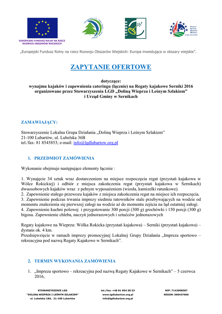 EUROPEJSKI FUNDUSZ ROLNY NA RZECZ ROZWOJU OBSZARÓW WIEJSKICH „Europejski Fundusz Rolny na rzecz Rozwoju Obszarów Wiejskich: Europa inwestująca w obszary wiejskie”. ZAPYTANIE OFERTOWE dotyczące: wynajmu kajaków i zapewnienia cateringu (łącznie) na Regaty kajakowe Serniki 2016 organizowane przez Stowarzyszenia LGD „Doliną Wieprza i Leśnym Szlakiem” i Urząd Gminy w Sernikach ZAMAWIAJĄCY: Stowarzyszenie Lokalna Grupa Działania „Doliną Wieprza i Leśnym Szlakiem” 21-100 Lubartów, ul. Lubelska 36B tel./fax: 81 8545853; e-mail: [email protected] 1. PRZEDMIOT ZAMÓWIENIA Wykonanie obejmuje następujące elementy łącznie : 1. Wynajęcie 34 sztuk wraz dostarczeniem na miejsce rozpoczęcia regat (przystań kajakowa w Wólce Rokickiej) i odbiór z miejsca zakończenia regat (przystań kajakowa w Sernikach) dwuosobowych kajaków wraz z pełnym wyposażeniem (wiosła, kamizelki ratunkowe). 2. Zapewnienie stałego przewozu kajaków z miejsca zakończenia regat na miejsce ich rozpoczęcia. 3. Zapewnienie podczas trwania imprezy siedmiu ratowników stale przebywających na wodzie od momentu znalezienia się pierwszej załogi na wodzie aż do momentu zejścia na ląd ostatniej załogi. 4. Zapewnienie kuchni polowej i przygotowanie 300 porcji (300 g) grochówki i 150 porcji (300 g) bigosu. Zapewnienie chleba, naczyń jednorazowych i sztućców jednorazowych Regaty kajakowe na Wieprzu: Wólka Rokicka (przystań kajakowa) – Serniki (przystań kajakowa) – dystans ok. 4 km. Przedsięwzięcie w ramach imprezy promocyjnej Lokalnej Grupy Działania „Impreza sportowo – rekreacyjna pod nazwą Regaty Kajakowe w Sernikach”. 2. TERMIN WYKONANIA ZAMÓWIENIA 1. „Impreza sportowo – rekreacyjna pod nazwą Regaty Kajakowe w Sernikach” – 5 czerwca 2016, STOWARZYSZENIE LGD tel./fax: +48 81 854 58 53 NIP: 7142008587 "DOLINĄ WIEPRZA I LEŚNYM SZLAKIEM" www.lgdlubartow.org.pl REGON: 060437606 ul. Lubelska 18A, 21-100 Lubartów [email protected] EUROPEJSKI FUNDUSZ ROLNY NA RZECZ ROZWOJU OBSZARÓW WIEJSKICH „Europejski Fundusz Rolny na rzecz Rozwoju Obszarów Wiejskich: Europa inwestująca w obszary wiejskie”. 3. INFORMACJE O WYMAGANYCH DOKUMENTACH Ofertę należy złożyć na: druku zapytania ofertowego do wypełnienia. 4. OSOBA UPRAWNIONA DO POROZUMIEWANIA SIĘ Z OFERENTAMI Osoba do kontaktu: Leszek Zieliński – tel. / fax.: 81 8545853; e-mail: [email protected] 5. MIEJSCE ORAZ TERMIN SKŁADANIA OFERT Ofertę należy złożyć pocztą elektroniczną w formie skanu prawidłowo wypełnionego i opieczętowanego druku zapytania ofertowego na dres: [email protected] do dnia 02.06.2016 do godz. 13.00. 6. KRYTERIA, KTÓRYMI BĘDZIE SIĘ KIEROWAŁ ZAMAWIAJĄCY PRZY WYBORZE OFERTY, WRAZ Z PODANIEM ZNACZENIA TYCH KRYTERIÓW Zamawiający zleci wykonanie przedmiotu zamówienia wykonawcy, co do którego ustalono, że zaoferował najkorzystniejszą – najniższą cenę ofertową brutto za wykonanie całości zamówienia. STOWARZYSZENIE LGD tel./fax: +48 81 854 58 53 NIP: 7142008587 "DOLINĄ WIEPRZA I LEŚNYM SZLAKIEM" www.lgdlubartow.org.pl REGON: 060437606 ul. Lubelska 18A, 21-100 Lubartów [email protected]
