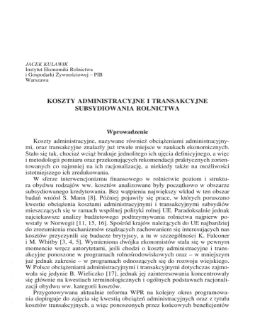 JACEK KULAWIK Instytut Ekonomiki Rolnictwa i Gospodarki Żywnościowej – PIB Warszawa KOSZTY ADMINISTRACYJNE I TRANSAKCYJNE SUBSYDIOWANIA ROLNICTWA - - - - - Wprowadzenie Koszty administracyjne, nazywane również obciążeniami administracyjnymi, oraz transakcyjne znalazły już trwałe miejsce w naukach ekonomicznych. Stało się tak, chociaż wciąż brakuje jednolitego ich ujęcia definicyjnego, a więc i metodologii pomiaru oraz przekonujących rekomendacji praktycznych zorientowanych co najmniej na ich racjonalizację, a niekiedy także na możliwości istotniejszego ich zredukowania. W sferze interwencjonizmu finansowego w rolnictwie poziom i struktura obydwu rodzajów ww. kosztów analizowane były początkowo w obszarze subsydiowanego kredytowania. Bez wątpienia największy wkład w ten obszar badań wniósł S. Mann [8]. Później pojawiły się prace, w których poruszano kwestie obciążenia kosztami administracyjnymi i transakcyjnymi subsydiów mieszczących się w ramach wspólnej polityki rolnej UE. Paradoksalnie jednak najciekawsze analizy budżetowego podtrzymywania rolnictwa najpierw powstały w Norwegii [11, 15, 16]. Spośród krajów należących do UE najbardziej do zrozumienia mechanizmów rządzących zachowaniem się interesujących nas kosztów przyczynili się badacze brytyjscy, a tu w szczególności K. Falconer i M. Whitby [3, 4, 5]. Wymieniona dwójka ekonomistów stała się w pewnym momencie wręcz autorytetami, jeśli chodzi o koszty administracyjne i transakcyjne ponoszone w programach rolnośrodowiskowych oraz – w mniejszym już jednak zakresie – w programach odnoszących się do rozwoju wiejskiego. W Polsce obciążeniami administracyjnymi i transakcyjnymi dotychczas zajmowała się jedynie B. Wieliczko [17], jednak jej zainteresowania koncentrowały się głównie na kwestiach terminologicznych i ogólnych podstawach racjonalizacji obydwu ww. kategorii kosztów. Przygotowywana aktualnie reforma WPR na kolejny okres programowania dopinguje do zajęcia się kwestią obciążeń administracyjnych oraz z tytułu kosztów transakcyjnych, a więc ponoszonych przez końcowych beneficjentów Koszty administracyjne i transakcyjne subsydiowania rolnictwa 31 oferowanego w ramach tej polityki wsparcia budżetowego. Problem zasługuje niewątpliwie na uwagę również i z tego powodu, że często formułowane są sprzeczne oczekiwania wobec przyszłej WPR, które ująć można następująco: WPR powinna być ambitna, lepiej adresowana, oparta o zobiektywizowane kryteria – najlepiej o charakterze prospektywnym, ale z drugiej strony także mało zbiurokratyzowana i przyjazna rolnikom oraz pozostałym jej adresatom. Artykuł składa się z krótkiego wprowadzenia, przeglądu ujęć definicyjnych i metod pomiaru obydwu rodzajów kosztów oraz ich determinant, analizy zależności między tymi kosztami a efektywnością subsydiowania oraz prezentacji oszacowania kosztów transakcyjnych trzech instrumentów wsparcia budżetowego rolnictwa w Polsce. Całość kończy się podsumowaniem. - - - - - Definiowanie i pomiar Jak już sygnalizowano, dotychczas nie wypracowano ogólnie przyjętej definicji kosztów transakcyjnych/administracyjnych, która implikowałaby jednoznacznie procedurę ich pomiaru. Większość propozycji odwołuje się do poglądów K.J. Arrowa, C.O. Northa i E.O. Williamsona, a więc trójki wybitnych amerykańskich noblistów, u których także trudno znaleźć ujęcie nadające się do późniejszego wykorzystania w postaci odpowiedniej formuły obliczeniowej. Nie rozwijając szerzej ewolucji omawianych kosztów, poprzestać można na stwierdzeniu, iż kosztami transakcyjnymi są te, które powstają, gdy jednostki wymieniają prawa własności do aktywów ekonomicznych i egzekwują swe wyłączne do nich roszczenia (T. Eggertsson, przytoczony za [1]). Kiedy informacja ma swój koszt, różne rodzaje aktywności związane z wymianą praw własności między jednostkami powodują powstawanie kosztów transakcyjnych. Aktywności te obejmują: 1. Poszukiwanie informacji o rozkładach cen i jakości towarów oraz nakładów pracy, potencjalnych nabywcach i odbiorcach, ich zachowaniach i innych charakterystykach. 2. Negocjowanie, a więc określanie prawdziwej pozycji stron transakcji, gdy ceny ustalane są w sposób endogeniczny (w ramach kontraktu). 3. Zawarcie kontraktu. 4. Monitorowanie przestrzegania przez strony kontraktów przyjętych warunków i zobowiązań. 5. Egzekwowanie kontraktu i wykrywanie zagrożeń dla jego wykonania. 6. Ochrona praw własności przed ich naruszeniem przez osoby trzecie, do których zalicza się również władze publiczne. Korzystając z powyższej specyfikacji, dalej przyjmuje się, iż koszty transakcyjne powstawać będą w gospodarstwach rolniczych, zaś obciążenia ponoszone przez pozostałych uczestników systemu interwencjonizmu finansowego w rolnictwie określać się będzie jako koszty administracyjne. Zazwyczaj pomiar kosztów transakcyjnych/administracyjnych ma charakter ex-post. Polega on na opisaniu całego procesu zawierania transakcji/kontraktu i oszacowaniu kosztów osobowych oraz pozostałych, a następnie ich zsumo- 32 Jacek Kulawik waniu. To proste podejście ma jednak poważną wadę: dużą dowolność odwzorowania procesu i przyporządkowania jego fazom odpowiednich składników kosztów. Z tych to właśnie powodów od kilku już lat w niektórych ośrodkach badawczych próbuje się sięgać po dorobek rachunkowości zarządczej, a w szczególności do rozwijanej w niej koncepcji kosztów działań (ABC – activity based costing). Wprost nawiązuje do niej standardowy model kosztów (SCM, the Standard Cost Model) jako propozycja precyzyjnego i ujednoliconego sposobu mierzenia obydwu analizowanych kosztów w projektowaniu i realizacji polityki rolnej oraz wiejskiej. Regulacja Obowiązek informacyjny nr 1 Obowiązek informacyjny nr 2 Obowiązek informacyjny nr n Zapotrzebowanie na informa