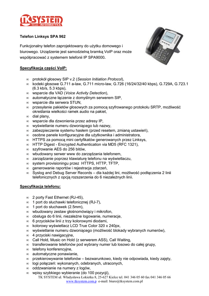 Telefon Linksys SPA 962 Funkcjonalny telefon zaprojektowany do uŜytku domowego i biurowego. Urządzenie jest samodzielną bramką VoIP oraz moŜe współpracować z systemem telefonii IP SPA9000. Specyfikacja części VoIP: • • • • • • • • • • • • • • • • • • • protokół głosowy SIP v.2 (Session Initiation Protocol), kodeki głosowe G.711 a-law, G.711 micro-law, G.726 (16/24/32/40 kbps), G.729A, G.723.1 (6.3 kb/s, 5.3 kbps), wsparcie dla VAD (Voice Activity Detection), automatyczne łączenie z domyślnym serwerem SIP, wsparcie dla serwera STUN, przesyłanie pakietów głosowych za pomocą szyfrowanego protokołu SRTP, moŜliwość określania wielkości ramek audio na pakiet, dial plany, wsparcie dla dzwonienia przez adresy IP, wyświetlanie numeru dzwoniącego lub nazwy, zabezpieczenie systemu hasłem (przed resetem, zmianą ustawień), osobne panele konfiguracyjne dla uŜytkownika i administratora, HTTPS za pomocą mini certyfikatów generowanych przez Linksys, HTTP Digest - Encrypted Authentication via MD5 (RFC 1321), szyfrowanie AES do 256 bitów, wbudowany serwer www do zarządzania telefonem, zarządzanie poprzez klawiaturę telefonu na wyświetlaczu, system provisioningu przez HTTPS, HTTP, TFTP, generowanie raportów i rejestracja zdarzeń, Syslog and Debug Server Records – dla kaŜdej lini, moŜliwość podłączenia 2 linii telefonicznych z opcją rozszerzenia do 6 niezaleŜnych linii. Specyfikacja telefonu: • • • • • • • • • • • • • • • • • 2 porty Fast Ethernet (RJ-45), 1 port do słuchawki telefonicznej (RJ-7), 1 port do słuchawek (2.5mm), wbudowany zestaw głośnomówiący i mikrofon, obsługa do 6 linii, niezaleŜne logowanie, numeracje, 6 przycisków linii z trzy kolorowymi diodami, kolorowy wyświetlacz LCD True Color 320 x 240px, wyświetlanie numeru dzwoniącego (moŜliwość blokady wybranych numerów), 4 przyciski nawigacyjne, Call Hold, Music on Hold (z serwerem ASS), Call Waiting, transferowanie telefonów pod wybrany numer lub losowo do całej grupy, telefony konferencyjne, automatyczne ponawianie, przekierowywanie telefonów – bezwarunkowo, kiedy nie odpowiada, kiedy zajęty, logi połączeń: wykonanych, odebranych, utraconych, oddzwanianie na numery z logów, wpisy szybkiego wybieranie (do 100 pozycji), TK SYSTEM ul. Władysława Łokietka 8, 25-627 Kielce tel. 041 346 05 60 fax 041 346 05 66 www.tksystem.com.p e-mail: [email protected] • • • • • • • • • • • • • DND, moŜliwość dobrania rodzaju dzwonka do konkrentej linii, licznik czasu rozmów, szybkie wybieranie, wbudowany serwer administracyjny do zarządzania dla administratora i uŜytkownika, system provisioningu (HTTP, HTTPS, TFTP), moŜliwość zablokowania “twardego” resetu telefonu poprzez ustawienie hasła administratora, diody LED wskazujące stan linii – aktywna, nie zarejestrowana, podswietlane przyciski: Audio Mute On/Off, Headset On/Off, Speakerphone On/Off, przycisk HOLD, menu, sterowanie głośnością, zasilanie zewnętrzne 5V (brak w zestawie), opcjonalnie moŜliwość dokupienia zasilacza wsparcie zasilania PoE (Power over Ethernet), wymiary: 203 x 194 x 191mm. Zapotrzebowanie na pasmo dla kodeków głosowych: • • • • • • • • Best - G.711u wymaga 64k pasma, Best - G.711a wymaga 64k pasma, Good - G.726-40 wymaga 40k pasma, Good - G.726-32 wymaga 32k pasma, Good - G.729 wymaga 8k pasma, Normal - G.726-24 wymaga 24k pasma, Normal - G.726-16 wymaga 16k pasma, Normal - G.723 wymaga 7k pasma. Gwarancja 2 lata. W opakowaniu znajdują się: telefon IP SPA962, słuchawka, przewód słuchawki, kabel Ethernet RJ-45, instrukcja szybkiej instalacji. TK SYSTEM ul. Władysława Łokietka 8, 25-627 Kielce tel. 041 346 05 60 fax 041 346 05 66 www.tksystem.com.p e-mail: [email protected]