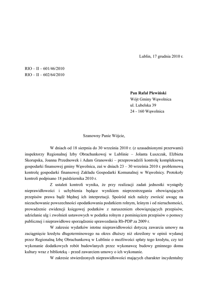 Lublin, 17 grudnia 2010 r. RIO – II – 601/46/2010 RIO – II – 602/64/2010 Pan Rafał Plewiński Wójt Gminy Wąwolnica ul. Lubelska 39 24 - 160 Wąwolnica Szanowny Panie Wójcie, W dniach od 18 sierpnia do 30 września 2010 r. (z uzasadnionymi przerwami) inspektorzy Regionalnej Izby Obrachunkowej w Lublinie – Jolanta Łuszczak, Elżbieta Skorupska, Joanna Przednowek i Adam Granowski – przeprowadzili kontrolę kompleksową gospodarki finansowej gminy Wąwolnica, zaś w dniach 23 – 30 września 2010 r. problemową kontrolę gospodarki finansowej Zakładu Gospodarki Komunalnej w Wąwolnicy. Protokoły kontroli podpisano 18 października 2010 r. Z ustaleń kontroli wynika, że przy realizacji zadań jednostki wystąpiły nieprawidłowości i uchybienia będące wynikiem nieprzestrzegania obowiązujących przepisów prawa bądź błędnej ich interpretacji. Spośród nich należy zwrócić uwagę na niezachowanie powszechności opodatkowania podatkiem rolnym, leśnym i od nieruchomości, prowadzenie ewidencji księgowej podatków z naruszeniem obowiązujących przepisów, udzielanie ulg i zwolnień ustawowych w podatku rolnym z pominięciem przepisów o pomocy publicznej i nieprawidłowe sporządzenie sprawozdania Rb-PDP za 2009 r. W zakresie wydatków istotne nieprawidłowości dotyczą zawarcia umowy na zaciągnięcie kredytu długoterminowego na okres dłuższy niż określony w opinii wydanej przez Regionalną Izbę Obrachunkową w Lublinie o możliwości spłaty tego kredytu, czy też wykonanie dodatkowych robót budowlanych przez wykonawcę budowy gminnego domu kultury wraz z biblioteką – przed zawarciem umowy o ich wykonanie. W zakresie stwierdzonych nieprawidłowości mających charakter incydentalny 2 lub tych, które – po udzieleniu przez kontrolujących instruktażu – zostały wyeliminowane w trakcie kontroli, nie formułowano wniosków pokontrolnych. W związku z tym, że nie zatrudniono kierownika Zakładu Komunalnego w Wąwolnicy, nie powierzono także nikomu pełnienia tych obowiązków – nieprawidłowości stwierdzone w toku kontroli Zakładu – ujęte zostały w tym wystąpieniu. Należy zwrócić uwagę, że funkcjonowanie jednostki sektora finansów publicznych bez kierownika stwarza zagrożenie co do prawidłowości prowadzenia gospodarki finansowej tej jednostki. Poniżej podaję stwierdzone nieprawidłowości i uchybienia oraz wnioski, co do sposobu ich wyeliminowania, stosownie do przepisów art. 9 ust. 2 ustawy z dnia 7 października 1992 r. o regionalnych izbach obrachunkowych (Dz. U. z 2001 r. Nr 55, poz. 577 z późn. zm.). W załączniku do wystąpienia pokontrolnego wskazuję osoby odpowiedzialne za stwierdzone nieprawidłowości. 1. W zakresie księgowości i sprawozdawczości budżetowej: 1.1. Ustalenie w dokumentacji opisującej przyjęte zasady (politykę) rachunkowości zasady kwartalnego rozliczania i ujmowania na koncie 902 „Wydatki budżetu” wydatków budżetowych zrealizowanych przez jednostki budżetowe oraz niewprowadzenie konta 991 „Rozrachunki z inkasentami z tytułu pobieranych przez nich podatków podlegających przypisaniu na kontach podatników”. W dokumentacji opisującej przyjęte zasady (politykę) rachunkowości ustalić obowiązek bieżącego ujmowania na koncie 902 „Wydatki budżetu” zrealizowanych przez jednostki budżetowe wydatków na podstawie ich sprawozdań budżetowych, w związku z przepisami art. 10 ust. 1 pkt 3 lit. a i art. 20 ust. 1 ustawy z dnia 29 września 1994 r. o rachunkowości (Dz. U. z 2009 r. Nr 152, poz. 1223 z późn. zm.) i zgodnie z zasadami funkcjonowania tego konta określonymi w załączniku Nr 1 do rozporządzenia Ministra Finansów z dnia 28 lipca 2006 r. w sprawie szczególnych zasad rachunkowości oraz planów kont dla budżetu państwa, budżetów jednostek samorządu terytorialnego oraz niektórych jednostek sektora finansów publicznych (Dz. U. Nr 142, poz. 1020 z późn. zm.), zwanego w dalszej części tego wystąpienia „rozporządzeniem Ministra Finansów z dnia 28 lipca 2006 r.”, w związku z przepisami § 27 rozporządzenia Ministra Finansów z dnia 5 lipca 2010 r. w sprawie szczególnych zasad rachunkowości oraz planów kont dla budżetu państwa, budżetów jednostek samorządu terytorialnego, jednostek budżetowych, samorządowych zakładów budżetowych, państwowych funduszy celowych oraz państwowych jednostek budżetowych mających siedzibę poza granicami Rzeczypospolitej Polskiej (Dz. U. Nr 128, poz. 861), zwanego w dalszej części tego wystąpienia „rozporządzeniem 3 Ministra Finansów z dnia 5 lipca 2010 r.”, mając na uwadze przepisy § 14 a ust. 2 rozporządzenia Ministra Finansów z dnia 28 lipca 2006 r. Wprowadzić do zakładowego planu kont Urzędu Gminy konto pozabilansowe 991 „Rozrachunki z inkasentami z tytułu pobieranych przez nich podatków podlegających przypisaniu na kontach podatników” i określić przyjęte zasady klasyfikacji na nim zdarzeń, zgodnie z przepisami § 3 pkt 1, § 9 ust. 1, § 10 pkt 2, § 12 ust. 1 pkt 1 i § 28 rozporządzenia Ministra Finansów dnia 21 czerwca 2006 r. w sprawie zasad rachunkowości i planu kont w zakresie ewidencji podatków, opłat i niepodatkowych należności budżetowych dla organów podatkowych jednostek samorządu terytorialnego (Dz. U. Nr 112, poz. 761) – str. 6, 7, protokołu. 1.2. Nieujęcie w zestawieniu sald kont pomocniczych, sporządzonym na koniec 2009 r., sald kont 011 „Środki trwałe”, 013 „Pozostałe środki trwałe” i 020 „Wartości niematerialne i prawne” – prowadzonych ręcznie. Co najmniej na dzień zamknięcia ksiąg rachunkowych sporządzać zestawienie sald wszystkich kont ksiąg pomocniczych, stosownie art. 18 ust. 2 ustawy o rachunkowości – str. 8 protokołu. 1.3. Niepowiązanie dowodów źródłowych z dokonanymi na ich podstawie zapisami księgowymi. Zapisy księgowe dokumentować w sposób pozwalający na identyfikację dowodów i sposobu ich 