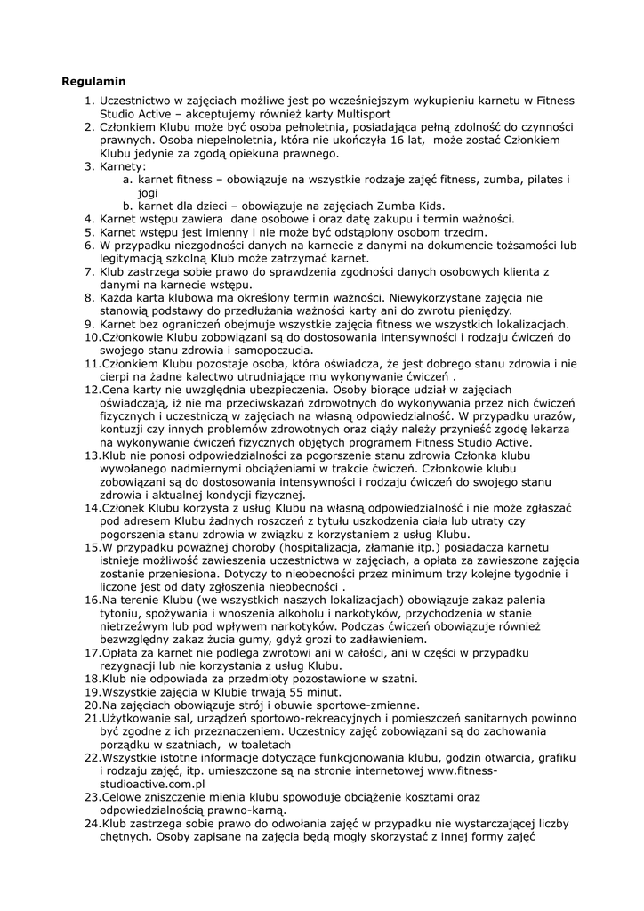 Regulamin 1. Uczestnictwo w zajęciach możliwe jest po wcześniejszym wykupieniu karnetu w Fitness Studio Active – akceptujemy również karty Multisport 2. Członkiem Klubu może być osoba pełnoletnia, posiadająca pełną zdolność do czynności prawnych. Osoba niepełnoletnia, która nie ukończyła 16 lat, może zostać Członkiem Klubu jedynie za zgodą opiekuna prawnego. 3. Karnety: a. karnet fitness – obowiązuje na wszystkie rodzaje zajęć fitness, zumba, pilates i jogi b. karnet dla dzieci – obowiązuje na zajęciach Zumba Kids. 4. Karnet wstępu zawiera dane osobowe i oraz datę zakupu i termin ważności. 5. Karnet wstępu jest imienny i nie może być odstąpiony osobom trzecim. 6. W przypadku niezgodności danych na karnecie z danymi na dokumencie tożsamości lub legitymacją szkolną Klub może zatrzymać karnet. 7. Klub zastrzega sobie prawo do sprawdzenia zgodności danych osobowych klienta z danymi na karnecie wstępu. 8. Każda karta klubowa ma określony termin ważności. Niewykorzystane zajęcia nie stanowią podstawy do przedłużania ważności karty ani do zwrotu pieniędzy. 9. Karnet bez ograniczeń obejmuje wszystkie zajęcia fitness we wszystkich lokalizacjach. 10.Członkowie Klubu zobowiązani są do dostosowania intensywności i rodzaju ćwiczeń do swojego stanu zdrowia i samopoczucia. 11.Członkiem Klubu pozostaje osoba, która oświadcza, że jest dobrego stanu zdrowia i nie cierpi na żadne kalectwo utrudniające mu wykonywanie ćwiczeń . 12.Cena karty nie uwzględnia ubezpieczenia. Osoby biorące udział w zajęciach oświadczają, iż nie ma przeciwskazań zdrowotnych do wykonywania przez nich ćwiczeń fizycznych i uczestniczą w zajęciach na własną odpowiedzialność. W przypadku urazów, kontuzji czy innych problemów zdrowotnych oraz ciąży należy przynieść zgodę lekarza na wykonywanie ćwiczeń fizycznych objętych programem Fitness Studio Active. 13.Klub nie ponosi odpowiedzialności za pogorszenie stanu zdrowia Członka klubu wywołanego nadmiernymi obciążeniami w trakcie ćwiczeń. Członkowie klubu zobowiązani są do dostosowania intensywności i rodzaju ćwiczeń do swojego stanu zdrowia i aktualnej kondycji fizycznej. 14.Członek Klubu korzysta z usług Klubu na własną odpowiedzialność i nie może zgłaszać pod adresem Klubu żadnych roszczeń z tytułu uszkodzenia ciała lub utraty czy pogorszenia stanu zdrowia w związku z korzystaniem z usług Klubu. 15.W przypadku poważnej choroby (hospitalizacja, złamanie itp.) posiadacza karnetu istnieje możliwość zawieszenia uczestnictwa w zajęciach, a opłata za zawieszone zajęcia zostanie przeniesiona. Dotyczy to nieobecności przez minimum trzy kolejne tygodnie i liczone jest od daty zgłoszenia nieobecności . 16.Na terenie Klubu (we wszystkich naszych lokalizacjach) obowiązuje zakaz palenia tytoniu, spożywania i wnoszenia alkoholu i narkotyków, przychodzenia w stanie nietrzeźwym lub pod wpływem narkotyków. Podczas ćwiczeń obowiązuje również bezwzględny zakaz żucia gumy, gdyż grozi to zadławieniem. 17.Opłata za karnet nie podlega zwrotowi ani w całości, ani w części w przypadku rezygnacji lub nie korzystania z usług Klubu. 18.Klub nie odpowiada za przedmioty pozostawione w szatni. 19.Wszystkie zajęcia w Klubie trwają 55 minut. 20.Na zajęciach obowiązuje strój i obuwie sportowe-zmienne. 21.Użytkowanie sal, urządzeń sportowo-rekreacyjnych i pomieszczeń sanitarnych powinno być zgodne z ich przeznaczeniem. Uczestnicy zajęć zobowiązani są do zachowania porządku w szatniach, w toaletach 22.Wszystkie istotne informacje dotyczące funkcjonowania klubu, godzin otwarcia, grafiku i rodzaju zajęć, itp. umieszczone są na stronie internetowej www.fitnessstudioactive.com.pl 23.Celowe zniszczenie mienia klubu spowoduje obciążenie kosztami oraz odpowiedzialnością prawno-karną. 24.Klub zastrzega sobie prawo do odwołania zajęć w przypadku nie wystarczającej liczby chętnych. Osoby zapisane na zajęcia będą mogły skorzystać z innej formy zajęć proponowanych przez Klub. 25.Fitness Studio Active zastrzega sobie prawo do zmiany cen, godzin otwarcia, planu zajęć oraz instruktora, jak również do odwołania zajęć, jeśli przyjdą na nie mniej niż 3 osoby, redukcji godzin w okresie wakacyjnym, świątecznym czy też całkowitego zamknięcia obiektu w okresie wakacji, po uprzednim poinformowaniu o tym klientów. 26.Uczestnik zajęć wnosząc opłatę wyraża jednocześnie zgodę na nieodpłatną publikację wizerunku (zdjęć, filmów) osób dorosłych i dzieci biorących udział w zajęciach fitness, zajęciach tanecznych, imprezach organizowanych lub współorganizowanych przez Fitness Studio Active. Zdjęcia i filmy będą wykorzystywane wyłącznie do celów promocyjnych firmy oraz propagowania zdrowego i aktywnego stylu życia. Jeżeli uczestnik zajęć lub opiekun prawny (w przypadku dziecka) nie wyraża zgody na publikację wizerunku, proszę o informację mailową. 27.Wnosząc opłatę za zajęcia w klubie uczestnik deklaruje się, iż zapoznał się z treścią powyższego regulaminu i akceptuje warunki w nim zawarte.