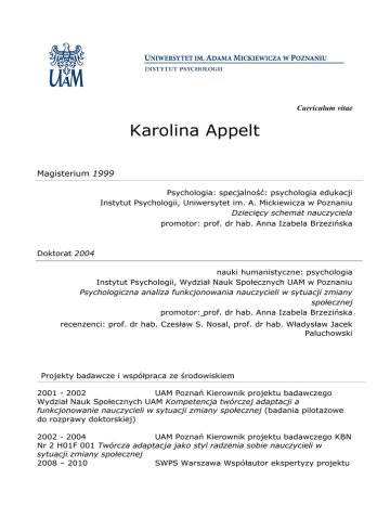 Curriculum vitae Karolina Appelt Magisterium 1999 Psychologia: specjalność: psychologia edukacji Instytut Psychologii, Uniwersytet im. A. Mickiewicza w Poznaniu Dziecięcy schemat nauczyciela promotor: prof. dr hab. Anna Izabela Brzezińska Doktorat 2004 nauki humanistyczne: psychologia Instytut Psychologii, Wydział Nauk Społecznych UAM w Poznaniu Psychologiczna analiza funkcjonowania nauczycieli w sytuacji zmiany społecznej promotor: prof. dr hab. Anna Izabela Brzezińska recenzenci: prof. dr hab. Czesław S. Nosal, prof. dr hab. Władysław Jacek Paluchowski Projekty badawcze i współpraca ze środowiskiem 2001 - 2002 UAM Poznań Kierownik projektu badawczego Wydział Nauk Społecznych UAM Kompetencja twórczej adaptacji a funkcjonowanie nauczycieli w sytuacji zmiany społecznej (badania pilotażowe do rozprawy doktorskiej) 2002 - 2004 UAM Poznań Kierownik projektu badawczego KBN Nr 2 H01F 001 Twórcza adaptacja jako styl radzenia sobie nauczycieli w sytuacji zmiany społecznej 2008 – 2010 SWPS Warszawa Współautor ekspertyzy projektu systemowego EFS/PFRON/SWPS nr WND-POKL-01.03.06-00-041/08 Ogólnopolskie badania sytuacji, potrzeb i możliwości osób niepełnosprawnych Kierownik: prof. dr hab. Anna I. Brzezińska 2010 – 2014 UAM Poznań Sędzia kompetentny; projekt MNiSzW nr N N106 047839 Konstrukcja narzędzi do psychologicznej diagnozy gotowości do uczenia się dzieci w wieku od 3 do 11 roku życia Kierownik: dr Sławomir Jabłoński 2010 – 2014 UAM Poznań Konsultacja merytoryczna, szkolenie badaczy, projekt NCN nr UMO-2012/07/N/HS6/00415 Związki pomiędzy procesowaniem fonologicznym, a akwizycją leksykalną w języku obcym. Badanie długoterminowe na polskich uczniach szkoły podstawowej uczących się języka angielskiego Kierownik: mgr Marta Marecka 2009 – 2014 UAM Poznań Wykonawca; projekt MNiSzW nr 0588/B/H03/2009/37 Adaptacja narzędzi do diagnozy jakości otoczenia fizycznego i społecznego dzieci w wieku od 6 do 36 miesiąca życia Kierownik: prof. dr hab. Elżbieta Hornowska Kursy i szkolenia 01.10.1997 – 30.06.1998 Kurs kwalifikacyjny w zakresie nauczania psychologii i edukacji zdrowotnej. Szkoła Wyższa Psychologii Społecznej w Warszawie 03.01.2000 – 06.01.2000 zawodowego i osobistego Trening interpersonalny rozwoju 01.09.1999 – 06.06.2000 Zajęcia doskonalące umiejętności wychowawcze oraz umiejętności pomagania w ramach programu ”Szczęśliwy nauczyciel, uczeń ...” 2001 Certyfikat in Advanced English nr 6074131 2001 Zajęcia doskonalenia zawodowego dla psychologów i pedagogów szkolnych 2011 Szkolenie w ramach projektu B+R = nauki społeczne dla gospodarki Historia zatrudnienia 1999-2005 Zespół Szkół z Oddziałami Integracyjnymi nr 2 w Poznaniustanowisko: psycholog szkolny , nauczyciel kontraktowy 2004 – do chwili obecnej Instytut Psychologii UAM, Zakład Psychologii Socjalizacji i Wspomagania Rozwoju stanowisko: adiunkt Funkcje uniwersyteckie 1999 - 2004 Opiekun i założyciel sekcji Koła Naukowego Psychologów Profilaktyka Trudności Szkolnych, Instytut Psychologii UAM 2005 - 2008 członek Rady Instytutu Psychologii 2005 - do chwili obecnej Kierownik Kursu w Zakresie Przygotowania Pedagogicznego przy Instytucie Psychologii UAM w Poznaniu a od 2014 roku Studiów Podyplomowych Przygotowania Pedagogicznego dla Psychologów nadającego kwalifikacje pedagogiczne absolwentom psychologii Ważniejsze publikacje i monografie Appelt, K., Jabłoński, S., Smykowski, B., Wojciechowska, J., Ziółkowska, B. (2010). Konstruowanie i ewaluacja projektów. Poprawa jakości życia osób z ograniczeniem sprawności i ich środowisk. Warszawa: Wydawnictwo Naukowe Scholar. Hornowska, E., Brzezińska, A. I., Appelt, K., Kaliszewska-Czeremska, K. (2014). Rola środowiska w rozwoju małego dziecka – metody badania. Warszawa: Wydawnictwo Scholar obj. 12 ark. wyd.; recenzent: prof. dr hab. Barbara Bokus, Wydział Psychologii UW; ISBN – 978-83-7383-722-5). Hornowska, E., Brzezińska, A. I., Appelt, K., Kaliszewska-Czeremska, K. (2014). The affordances of children's environments. The result of Polish studies. Warszawa: Wydawnictwo Scholar (6 ark. wyd.; recenzent: prof. dr hab. Barbara Bokus, Wydział Psychologii UW; ISBN – 978-83-7383-733-1). Brzezińska, A. I., Appelt, K., Jabłoński, S., Wojciechowska, J., Ziółkowska, B. (red.). (2014). 6-latki w szkole: edukacja i pomoc. Poznań: Wydawnictwo Humaniora (obj. 15 ark. wyd.; recenzent: prof. dr hab. Maria Ledzińska, Wydział Psychologii UW; ISBN – 978-83-7589-033-5). Appelt, K. (2005). Style funkcjonowania nauczycieli w sytuacji zmiany społecznej. Forum Oświatowe, 2 (33), 5 - 23. Appelt, K. (2005). Zmiana kontekstu społecznego a geneza trudności szkolnych. Edukacja, 4 (92), 5 - 18. Appelt, K. (2006). Osobowościowe uwarunkowania funkcjonowania nauczycieli w sytuacji zmiany społecznej. Forum Oświatowe, 1 (34), 5 - 25. Appelt, K. (2007). Podmiotowe i kontekstowe uwarunkowania funkcjonowania nauczycieli w sytuacji zmiany społecznej. Forum Oświatowe, 1 (36), 71 - 90. Hornowska, E., Brzezińska, A. I., Kaliszewska-Czeremska, K., Appelt, K., Rawecka, J., Bujacz, A. (2012). Paradoksalny efekt triangulacji? Edukacja, 4 (120), 72 – 83. Czub, M., Brzezińska, A. I., Czub, T., Appelt, K. (2012). Wczesna opieka nad dzieckiem i edukacja jako wyzwanie dla polityki społecznej i oświatowej. Polityka Społeczna, numer tematyczny 1, 19 - 23. Brzezińska, A. I., Appelt, K. (2013). Tutoring nauczycielski – tutoring rówieśniczy: aspekty etyczne. Forum Oświatowe, 2 (49), 13 – 29. Czub, M., Appelt, K., (2013). Wczesna edukacja i opieka nad małym dzieckiem jako wyzwanie dla systemu edukacji. Studia Edukacyjne, 27, 113-128. Appelt, K., Jabłoński, S. (2004, 2007 – II wyd.). Osiągnięcia i zagrożenia dla rozwoju dziecka w wieku szkolnym. W: A. Brzezińska, E. Hornowska (red.), Dzieci i młodzież wobec agresji i przemocy (s. 75 – 90). Warszawa: Wydawnictwo Naukowe Scholar. Appelt, K. (20