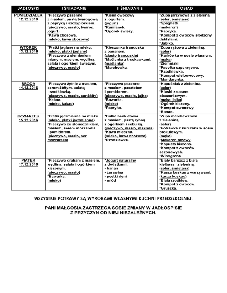 JADŁOSPIS I ŚNIADANIE II ŚNIADANIE PONIEDZIAŁEK 12.12.2016 *Pieczywo pszenne z masłem, pastą twarogową z papryką i szczypiorkiem. (pieczywo, masło, twaróg, jogurt) *Kawa zbożowa. (mleko, kawa zbożowa) *Kisiel owocowy z jogurtem. (jogurt) *Rumianek. *Ogórek świeży. WTOREK 13.12.2016 *Płatki jaglane na mleku. (mleko, płatki jaglane) *Pieczywo z siemieniem lnianym, masłem, wędliną, sałatą i ogórkiem świeżym. (pieczywo, masło) *Kieszonka francuska z bananem. (ciasto francuskie) *Maślanka z truskawkami. (maślanka) *Marchewka. ŚRODA 14.12.2016 *Pieczywo żytnie z masłem, serem żółtym, sałatą i rzodkiewką. (pieczywo, masło, ser żółty) *Kakao. (mleko, kakao) *Pieczywo pszenne z masłem, pasztetem i pomidorem. (pieczywo, masło, jajko) *Bawarka. (mleko) *Papryka. CZWARTEK 15.12.2016 *Płatki jęczmienne na mleku. (mleko, płatki jęczmienne) *Pieczywo ze słonecznikiem, masłem, serem mozzarella i pomidorem. (pieczywo, masło, ser mozzarella) *Bułka bankietowa z masłem, pastą rybną z ogórkiem i cebulką. (pieczywo, masło, makrela) *Kawa mleczna. (mleko, kawa zbożowa) *Rzodkiewka. PIĄTEK 17.12.2016 *Pieczywo graham z masłem, wędliną, sałatą i ogórkiem kiszonym. (pieczywo, masło) *Bawarka. (mleko) *Jogurt naturalny z dodatkami: - banan - żurawina - pestki dyni - miód OBIAD *Zupa jarzynowa z zieleniną. (seler, śmietana) *Spaghetti. (makaron) *Papryka. *Kompot z owoców słodzony daktylami. *Jabłko. *Zupa ryżowa z zieleniną. (seler) *Karkówka w sosie własnym. (mąka) *Ziemniaki. *Fasolka szparagowa. *Rzodkiewka. *Kompot wieloowocowy. *Mandarynka. *Kapuśniak z zieleniną. (seler) *Kluski z sosem pieczarkowym. (mąka, jajka) *Ogórek kiszony. *Kompot owocowy. *Banan. *Zupa marchewkowa z zieleniną. (seler) *Potrawka z kurczaka w sosie brokułowym. (mąka) *Makaron razowy. *Kapusta kiszona. *Kompot z owoców sezonowych. *Winogrona. *Biały barszcz z białą kiełbasą i zieleniną. (seler, śmietana) *Kasza kuskus z warzywami. (kasza kuskus) *Biała rzodkiew. *Kompot z owoców. *Gruszka. WSZYSTKIE POTRAWY SĄ WYROBAMI WŁASNYMI KUCHNI PRZEDSZKOLNEJ. PANI MAŁGOSIA ZASTRZEGA SOBIE ZMIANY W JADŁOSPISIE Z PRZYCZYN OD NIEJ NIEZALEŻNYCH.