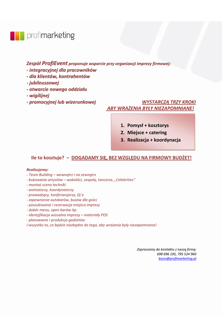 Zespół ProfiEvent proponuje wsparcie przy organizacji imprezy firmowej: - integracyjnej dla pracowników - dla klientów, kontrahentów - jubileuszowej - otwarcie nowego oddziału - wigilijnej - promocyjnej lub wizerunkowej WYSTARCZĄ TRZY KROKI ABY WRAŻENIA BYŁY NIEZAPOMNIANE! 1. Pomysł + kosztorys 2. Miejsce + catering 3. Realizacja + koordynacja Ile to kosztuje? – DOGADAMY SIĘ, BEZ WZGLĘDU NA FIRMOWY BUDŻET! Realizujemy: - Team Building – wewnątrz i na zewnątrz - bukowanie artystów – wokaliści, zespoły, tancerze, „Celebrities” - montaż sceno techniki - animatorzy, koordynatorzy - prowadzący, konferansjerzy, Dj`e - zapewnienie autokarów, busów dla gości - poszukiwanie i rezerwacja miejsca imprezy - dobór menu, open barów itp. - identyfikacja wizualna imprezy – materiały POS - planowanie i produkcja gadżetów I wszystko to, co będzie niezbędne do tego, aby wrażenia były niezapomniena! Zapraszamy do kontaktu z naszą firmą: 698 696 195, 795 524 960 [email protected]
