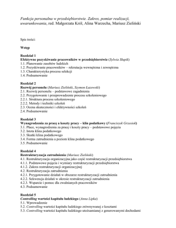 Funkcja personalna w przedsiębiorstwie. Zakres, pomiar realizacji, uwarunkowania, red. Małgorzata Król, Alina Warzecha, Mariusz Zieliński Spis treści: Wstęp Rozdział 1 Efektywne pozyskiwanie pracowników w przedsiębiorstwie (Sylwia Słupik) 1.1. Planowanie zasobów ludzkich 1.2. Pozyskiwanie pracowników – rekrutacja wewnętrzna i zewnętrzna 1.3. Charakterystyka procesu selekcji 1.4. Podsumowanie Rozdział 2 Rozwój personelu (Mariusz Zieliński, Szymon Łazowski) 2.1. Rozwój personelu – podstawowe zagadnienia 2.2. Przygotowanie i przeprowadzenie procesu szkoleniowego 2.2.1. Struktura procesu szkoleniowego 2.2.2. Metody i techniki szkoleń 2.3. Ocena skuteczności i efektywności szkoleń 2.4. Podsumowanie Rozdział 3 Wynagrodzenia za pracę a koszty pracy – klin podatkowy (Franciszek Grzesiok) 3.1. Płace, wynagrodzenia za pracę i koszty pracy – podstawowe pojęcia 3.2. Istota klina podatkowego 3.3. Skutki klina podatkowego 3.4. Forma zatrudnienia a poziom klina podatkowego 3.5. Podsumowanie Rozdział 4 Restrukturyzacja zatrudnienia (Mariusz Zieliński) 4.1. Restrukturyzacja organizacyjna jako część restrukturyzacji przedsiębiorstwa 4.1.1. Podstawowe pojęcia i wymiary restrukturyzacji przedsiębiorstwa 4.1.2. Zakres restrukturyzacji organizacyjnej 4.2. Restrukturyzacja zatrudnienia 4.2.1. Przygotowanie działań w obszarze restrukturyzacji zatrudnienia 4.2.2. Sekwencja działań w okresie restrukturyzacji zatrudnienia 4.2.3. Wsparcie i pomoc dla zwalnianych pracowników 4.3. Podsumowanie Rozdział 5 Controlling wartości kapitału ludzkiego (Anna Lipka) 5.1. Wprowadzenie 5.2. Controlling wartości kapitału ludzkiego zrównywanej z kosztami 5.3. Controlling wartości kapitału ludzkiego utożsamianej z generowanymi dochodami 5.4. Controlling wartości kapitału ludzkiego bazujący na wartości dodanej, wskaźnikach i mnożnikach 5.5. Controlling wartości kapitału ludzkiego nawiązujący do mieszanych i alternatywnych metod wyceny 5.6. Podsumowanie Rozdział 6 Zmiany funkcjonowania rynku pracy a freelancing pokolenia Y (Małgorzata Król) 6.1. Charakterystyka pokolenia Y na tle pozostałych generacji 6.2. Przemiany pracy a pokolenie Y 6.3. Freelancing pokolenia Y – wybór czy konieczność? 6.4. Podsumowanie Rozdział 7 Zarządzanie różnorodnością – płeć na rynku pracy (Alina Warzecha) 7.1. Koncepcja zarządzania różnorodnością 7.2. Strategia gender mainstreamingu we współczesnej organizacji 7.3. Płeć biologiczna a płeć kulturowa – definicja pojęć 7.4. „Męskie” i „kobiece” charaktery: odmienne czy jednakowe? 7.5. Nierówność płci na rynku pracy 7.6. Stereotypy związane z dyskryminacją płci na rynku pracy 7.6.1. Stereotypy dotyczące ról społecznych mężczyzn i kobiet 7.6.2. Stereotypy związane z zawodami „męskimi” i „żeńskimi” oraz feminizacja branżowa 7.6.3. Stereotypy związane z rolami kierowniczymi – niewidzialne bariery rynku pracy 7.7. Podsumowanie 135 Rozdział 8 Polskie prawo pracy a rodzicielstwo (Izabela Rudnik) 8.1. Ochrona stosunku pracy w okresie ciąży i urlopu macierzyńskiego 8.1.1. Ochrona pracy kobiet 8.1.2. Urlop macierzyński i zasiłek macierzyński 8.1.2.1. Świadczenia związane z urodzeniem dziecka 8.1.2.2. Dodatkowy urlop macierzyński 8.1.2.3. Urlop ojcowski 8.1.2.4. Urlop z tytułu przysposobienia 8.1.2.5. Zatrudnianie po urlopie macierzyńskim 8.1.2.6. Zasiłek macierzyński 8.2. Urlop wychowawczy 8.2.1. Istota urlopu wychowawczego 8.2.2. Zakaz wypowiedzenia lub rozwiązania umowy o pracę w czasie urlopu wychowawczego 8.2.3. Podjęcie pracy zarobkowej w czasie urlopu wychowawczego 8.2.4. Zatrudnienie po urlopie wychowawczym 8.3. Ochrona zatrudnienia a obniżenie wymiaru etatu 8.4. Uprawnienia związane ze sprawowaniem opieki nad dzieckiem 8.5. Podsumowanie Zakończenie Bibliografia