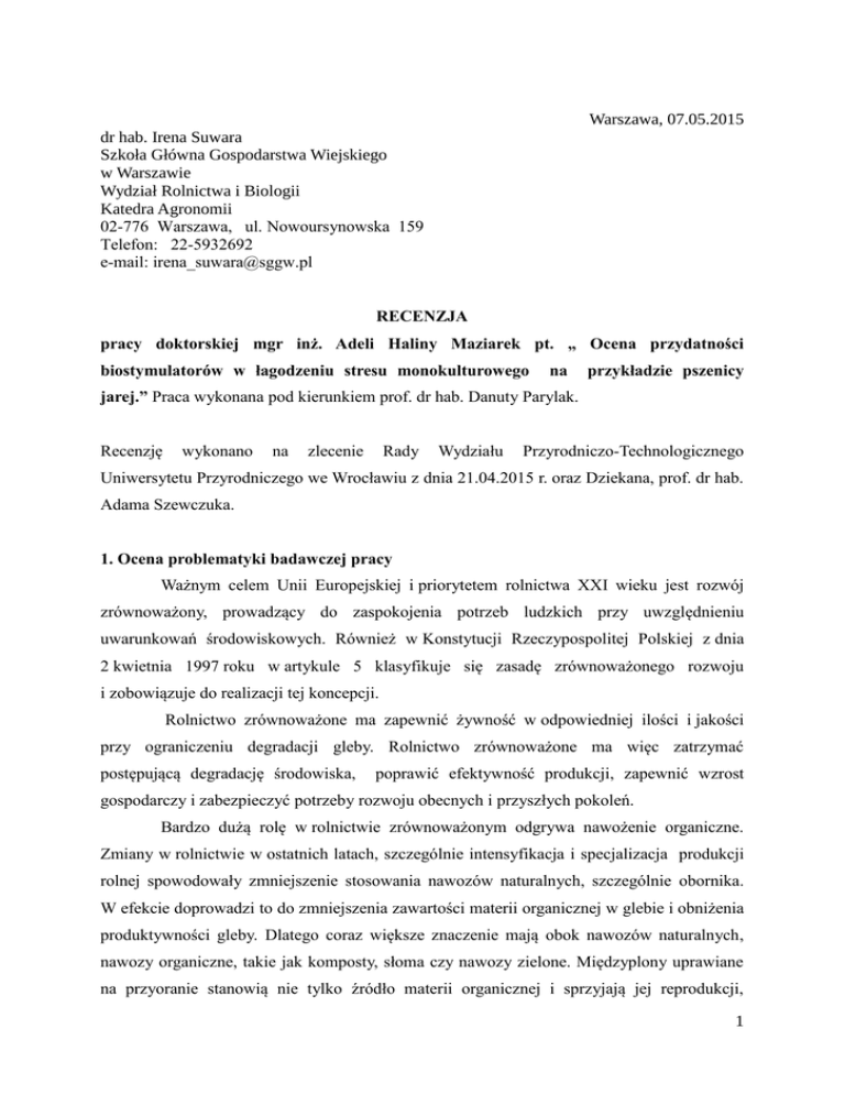 Warszawa, 07.05.2015 dr hab. Irena Suwara Szkoła Główna Gospodarstwa Wiejskiego w Warszawie Wydział Rolnictwa i Biologii Katedra Agronomii 02-776 Warszawa, ul. Nowoursynowska 159 Telefon: 22-5932692 e-mail: [email protected] RECENZJA pracy doktorskiej mgr inż. Adeli Haliny Maziarek pt. „ Ocena przydatności biostymulatorów w łagodzeniu stresu monokulturowego na przykładzie pszenicy jarej.” Praca wykonana pod kierunkiem prof. dr hab. Danuty Parylak. Recenzję wykonano na zlecenie Rady Wydziału Przyrodniczo-Technologicznego Uniwersytetu Przyrodniczego we Wrocławiu z dnia 21.04.2015 r. oraz Dziekana, prof. dr hab. Adama Szewczuka. 1. Ocena problematyki badawczej pracy Ważnym celem Unii Europejskiej i priorytetem rolnictwa XXI wieku jest rozwój zrównoważony, prowadzący do zaspokojenia potrzeb ludzkich przy uwzględnieniu uwarunkowań środowiskowych. Również w Konstytucji Rzeczypospolitej Polskiej z dnia 2 kwietnia 1997 roku w artykule 5 klasyfikuje się zasadę zrównoważonego rozwoju i zobowiązuje do realizacji tej koncepcji. Rolnictwo zrównoważone ma zapewnić żywność w odpowiedniej ilości i jakości przy ograniczeniu degradacji gleby. Rolnictwo zrównoważone ma więc zatrzymać postępującą degradację środowiska, poprawić efektywność produkcji, zapewnić wzrost gospodarczy i zabezpieczyć potrzeby rozwoju obecnych i przyszłych pokoleń. Bardzo dużą rolę w rolnictwie zrównoważonym odgrywa nawożenie organiczne. Zmiany w rolnictwie w ostatnich latach, szczególnie intensyfikacja i specjalizacja produkcji rolnej spowodowały zmniejszenie stosowania nawozów naturalnych, szczególnie obornika. W efekcie doprowadzi to do zmniejszenia zawartości materii organicznej w glebie i obniżenia produktywności gleby. Dlatego coraz większe znaczenie mają obok nawozów naturalnych, nawozy organiczne, takie jak komposty, słoma czy nawozy zielone. Międzyplony uprawiane na przyoranie stanowią nie tylko źródło materii organicznej i sprzyjają jej reprodukcji, 1 ale mają również duże znaczenie fitosanitarne w płodozmianie. Stosowanie międzyplonów jest bardzo ważne w uproszczonych zmianowaniach i obecnie zalecane. Współcześnie coraz powszechniej stosuje się w rolnictwie biostymulatory roślin, które mają ścisły związek z procesami życiowymi, a ich zadaniem jest usprawnianie intensywności procesów zachodzących w roślinach oraz zwiększanie odporności na niekorzystne warunki ( podwyższanie tolerancji na czynniki stresowe ), takie jak susza, przymrozki, zanieczyszczenia środowiska toksycznymi substancjami, czy też stres po stosowaniu herbicydów. W efekcie końcowym stosowanie biostymulatorów ma prowadzić do wzmocnienia roślin i zwiększenia plonu, przy jednoczesnym wzroście jego jakości. Znaczenie biostymulatorów w rolnictwie obecnie rośnie, gdyż technologie produkcji roślinnej polegające na doskonaleniu tylko uprawy roli, zmianowania czy nawożenia zaczynają napotykać na ograniczenia, które wynikają z braku możliwości wykorzystania potencjału biologicznego danej odmiany hodowlanej. Dlatego też poszukiwane są nowe rozwiązania mające na celu zapewnienie roślinom jak najlepszych warunków do wzrostu i rozwoju. Uważa się, że bardzo dobrym sposobem jest stosowanie biostymulatorów. Biostymulatory definiowane są jako preparaty wspomagające naturalne procesy życiowe roślin oraz zwiększające ich odporność na warunki stresowe. Wykorzystanie naturalnych stymulatorów wzrostu roślin jest bardzo aktualnym kierunkiem w rolnictwie. Użycie substancji przyjaznych środowisku daje możliwość uzyskania wysokich i dobrej jakości plonów przy jednoczesnym ograniczeniu wprowadzania do gleby dużej ilości związków chemicznych. W literaturze najwięcej badań dotyczących stosowania biostymulatorów związane jest z roślinami warzywnymi, sadowniczymi, szkółkami, plantacjami rzepaku i buraków cukrowych. Z tego względu uzasadnionym celem było sprawdzenie działania biostymulatorów jako czynnika łagodzącego stres pszenicy jarej uprawianej w monokulturze. Intensyfikacja produkcji rolniczej wpłynęła niekorzystnie na żyzność gleby. Ponadto niekorzystne warunki biotyczne i abiotyczne występujące w uprawie mogą powodować u roślin silne reakcje stresowe. W związku z tym rolnicy coraz częściej poszukują bezpiecznych i naturalnych sposobów i preparatów, aby poprawić produkcyjność gleby i zabezpieczyć ją przed degradacją. Racjonalne wykorzystanie międzyplonów oraz biostymulatorów stanowi obecnie jeden z podstawowych czynników ochrony środowiska i produktywności gleb. Podjęcie przez Panią mgr inż. Adelę Halinę Maziarek badań dotyczących oceny przydatności biostymulatorów oraz przyorywania międzyplonu ścierniskowego w łagodzeniu 2 stresu monokulturowego dla pszenicy jarej i w poprawie wartości stanowiska oraz produktywności gleby jest w pełni uzasadnione, interesujące i bardzo aktualne. Praca jest próbą kompleksowego podejścia do oceny wpływu stosowania wybranych preparatów oraz wprowadzania do gleby biomasy facelii błękitnej - międzyplonu ścierniskowego na kształtowanie zachwaszczenie, właściwości zdrowotność biologicznych, łanu i fizycznych plonowanie i chemicznych pszenicy jarej gleby, uprawianej w monokulturze oraz cechy jakościowe ziarna. Opracowanie wyników w formie publikacji znacząco poszerzy dorobek naukowy w zakresie stosowania badanych preparatów i wykorzystania międzyplonów. Należy podkreślić, że badania obejmują ważne zagadnienia dla praktyki rolniczej. 2. Formalna ocena rozprawy Rozprawa doktorska Pani mgr inż. Adeli Haliny Maziarek została przedstawiona na 114 stronach tekstu zawierającego 41 tabel i 14 rysunków łącznie z literaturą. Wykaz literatury zawiera aż 376 pozycji piśmiennictwa, w tym około 23% stanowią opracowania obcojęzyczne, a prawie 50% pozycje literatury opublikowane w ostatnim dziesięcioleciu (2005-2014). 