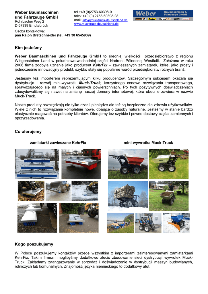 Weber Baumaschinen und Fahrzeuge GmbH Rohrbacher Weg 2 D-57339 Erndtebrück tel.+49 (0)2753-60398-0 faks: +49 (0) 2753-60398-28 mail: [email protected] www.mucktruck-deutschland.de Osoba kontaktowa: pan Ralph Bretschneider (tel. +49 30 6545939) Kim jesteśmy Weber Baumaschinen und Fahrzeuge GmbH to średniej wielkości przedsiębiorstwo z regionu Wittgensteiner Land w południowo-wschodniej części Nadrenii-Północnej Westfalii. Założona w roku 2006 firma zdobyła uznanie jako producent KehrFix – zawieszanych zamiatarek, które, jako prosty i jednocześnie innowacyjny produkt, szybko stały się popularne wśród przedsiębiorstw różnych branż. Jesteśmy też importerem reprezentującym kilku producentów. Szczególnym sukcesem okazała się dystrybucja i rozwój mini-wywrotki Muck-Truck, korzystnego cenowo rozwiązania transportowego, sprawdzającego się na małych i ciasnych powierzchniach. Po tych pozytywnych doświadczeniach zdecydowaliśmy się nawet na zmianę naszej domeny internetowej, która obecnie zawiera w nazwie Muck-Truck. Nasze produkty oszczędzają nie tylko czas i pieniądze ale też są bezpieczne dla zdrowia użytkowników. Wiele z nich to rozwiązanie kompletnie nowe, dbające o zasoby naturalne. Jesteśmy w stanie bardzo elastycznie reagować na potrzeby klientów. Oferujemy też szybkie i pewne dostawy części zamiennych i oprzyrządowania. Co oferujemy zamiatarki zawieszane KehrFix mini-wywrotka Muck-Truck Kogo poszukujemy W Polsce poszukujemy kontaktów przede wszystkim z importerami zainteresowanymi zamiatarkami KehrFix. Takim firmom moglibyśmy dodatkowo zlecić zbudowanie sieci dystrybucji wywrotek MuckTruck. Zakładamy zaangażowanie w sprzedaż i doświadczenie w dystrybucji maszyn budowlanych, rolniczych lub komunalnych. Znajomość języka niemieckiego to dodatkowy atut.
