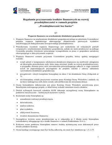 Regulamin przyznawania środków finansowych na rozwój przedsiębiorczości w ramach projektu ,,Przedsiębiorczość bez barier” §1 Wsparcie finansowe na uruchomienie działalności gospodarczej 1. Wsparcie finansowe na uruchomienie działalności gospodarczej polega na udzieleniu Uczestnikowi projektu wsparcia kapitałowego ułatwiającego sfinansowanie pierwszych wydatków umożliwiających funkcjonowanie nowopowstałego przedsiębiorstwa. 2. Wnioskowana wysokość wsparcia finansowego jest uzależniona od wskazanych potrzeb związanych z uruchomieniem działalności gospodarczej, jednak nie może przekroczyć na jednego Uczestnika projektu 6-krotności przeciętnego wynagrodzenia za pracę w gospodarce narodowej obowiązującego w dniu przyznania wsparcia. 3. Wsparcie finansowe zostanie przyznane Uczestnikom projektu, którzy spełnią następujące warunki: • wzięli udział w komponencie szkoleniowo-doradczym (dopuszcza się możliwość odstąpienia od obowiązku przeszkolenia osób, które mają otrzymać środki na rozwój przedsiębiorczości, w przypadku złożenia przez nich zaświadczenia potwierdzającego odbycie w ciągu ostatnich trzech lat poprzedzających przystąpienie do projektu szkoleń z zakresu zakładania i prowadzenia działalności gospodarczej), • przygotowali i złożyli kompletne biznesplany na okres 2 lat działalności firmy (Załącznik nr 1), • ich biznesplany zostały pozytywnie ocenione przez Komisję Oceny Wniosków i znalazły się na liście rankingowej osób, które zostały zakwalifikowane do otrzymania dotacji. 4. Ocena biznesplanów dokonywana jest przez Komisję Oceny Wniosków powoływaną przez Beneficjenta realizującego projekt, w skład której wchodzi minimum trzech członków. 5. Dwóch wybranych losowych członków KOW dokonuje szczegółowej oceny biznesplanów na podstawie merytoryczno – technicznych kryteriów wyboru. 6. Kryteriami oceny biznesplanu są: • uzasadnienie realizacji przedsięwzięcia, • doświadczenie, • analiza rynkowa, • plan wydatków, • efektywność kosztowa, • trwałość ekonomiczno-finansowa. 7. Szczegółowe kryteria oceny przedstawione są w załączniku nr 2 (Karta oceny biznesplanu wnioskodawcy ubiegającego się o środki finansowe w ramach Poddziałania 10.4.1). 8. Końcowa ocena punktowa biznesplanu stanowi średnią arytmetyczną ocen dokonanych przez dwóch członków Komisji. 9. Ocena każdego oceniającego musi być liczbą całkowitą, nie może być ułamkiem np. 1,5; 2,75. 1 10. Minimalna liczba punktów kwalifikująca biznesplan do dofinansowania wynosi 60. 11. W przypadku, gdy biznesplan uzyskał od przynajmniej jednego z oceniających co najmniej 60 punktów oraz różnica w liczbie punktów przyznanych przez dwóch oceniających za spełnianie kryteriów merytoryczno - technicznych wynosi co najmniej 30 punktów, projekt poddawany jest dodatkowej ocenie, którą przeprowadza trzeci oceniający, wybrany w drodze losowania. Ocena dokonana przez trzeciego oceniającego jest oceną wiążącą. 12. Wsparcie finansowe na uruchomienie działalności gospodarczej zostanie przyznane 75 Uczestnikom projektu, których biznesplany zostaną najwyżej ocenione przez Komisję Oceny Wniosków. 13. W przypadku gdy łączna wartość wniosków rekomendowana do przyznania wsparcia finansowego będzie mniejsza niż posiadane środki, dopuszcza się możliwość przyznania dofinansowania większej liczbie Uczestników. 14. O wynikach oceny biznesplanów (wraz z podaniem liczby uzyskanych punktów) dokonanych przez KOW Uczestnik projektu zostanie poinformowany w formie pisemnej. 15. Uczestnik projektu, może wnioskować o wydanie kserokopii kart oceny biznesplanów. 16. Kopie dokumentów nie będą posiadały danych osób oceniających z uwagi na fakt, iż są one wyłączone z jawności zgodnie z ograniczeniami, o których mowa w art. 5 Ustawy o dostępie do informacji publicznej. 17. Uczestnik, którego biznesplan został odrzucony ma możliwość złożenia do Ośrodka Promowania Przedsiębiorczości wniosku o ponowne rozpatrzenie biznesplanu, wraz z przedstawieniem dodatkowych wyjaśnień. 18. Wniosek o ponowne rozpatrzenie biznesplanu powinien zostać złożony przez Uczestnika projektu w formie pisemnej w terminie 3 dni od daty uzyskania informacji o odrzuceniu wniosku. 19. Beneficjent ma obowiązek dokonania powtórnej oceny biznesplanu w terminie 5 dni roboczych od dnia wpłynięcia wniosku w tej sprawie. Ocena powtórnie złożonego biznesplanu nie może być dokonywana przez tę samą osobę, która uczestniczyła w ocenie pierwotnej wersji dokumentu. 20. O wynikach powtórnej oceny biznesplanu Uczestnik projektu zostanie poinformowany pisemnie. Powtórna ocena biznesplanu jest oceną wiążącą i ostateczną i nie podlega dalszej procedurze odwoławczej. 21. Ostateczne zamknięcie listy Uczestników projektu kwalifikujących się do otrzymania dotacji możliwe jest po rozpatrzeniu wszystkich wniosków o ponowne rozpatrzenie biznesplanu, jednak nie później niż 10 dni od daty wpłynięcia ostatniego wniosku o ponowne rozpatrzenie biznesplanu. 22. Po ostatecznym zamknięciu listy Uczestników projektu kwalifikujących się do otrzymania wsparcia, osoby, których biznesplany zostały pozytywnie ocenione przez KOW oraz zarekomendowane do realizacji, rejestrują działalność gospodarczą na terenie realizacji projektu z wyłączeniem działalności o których mowa w § 4 Regulaminu Rekrutacji. 23. W terminie 14 dni od poinformowania Uczestników o zarekomendowaniu do dofinansowania, są oni zobligowani do dostarczenia do Beneficjenta wniosku o udzielenie wsparcia finansowego oraz wszystkich niezbędnych dokumentów potwierdzających założenie własnej działalności gospodarczej. 24. Wniosek może być złożony osobiście lub za pośrednictwem poczty, za zwrotnym potwierdzeniem odbioru lub kuriera na adres biura Ośrodka Promowania Przedsiębiorczości w Sandomierzu, pl. Ks. J. 