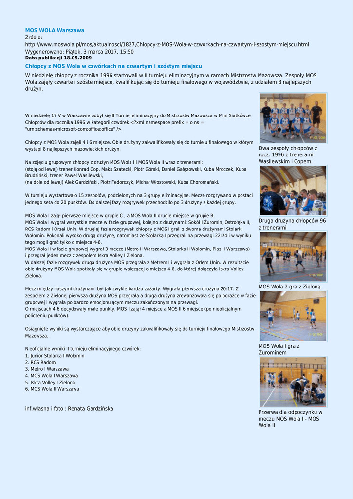 MOS WOLA Warszawa Źródło: http://www.moswola.pl/mos/aktualnosci/1827,Chlopcy-z-MOS-Wola-w-czworkach-na-czwartym-i-szostym-miejscu.html Wygenerowano: Piątek, 3 marca 2017, 15:50 Data publikacji 18.05.2009 Chłopcy z MOS Wola w czwórkach na czwartym i szóstym miejscu W niedzielę chłopcy z rocznika 1996 startowali w II turnieju eliminacyjnym w ramach Mistrzostw Mazowsza. Zespoły MOS Wola zajęły czwarte i szóste miejsce, kwalifikując się do turnieju finałowego w województwie, z udziałem 8 najlepszych drużyn. W niedzielę 17 V w Warszawie odbył się II Turniej eliminacyjny do Mistrzostw Mazowsza w Mini Siatkówce Chłopców dla rocznika 1996 w kategorii czwórek.<?xml:namespace prefix = o ns = "urn:schemas-microsoft-com:office:office" /> Chłopcy z MOS Wola zajęli 4 i 6 miejsce. Obie drużyny zakwalifikowały się do turnieju finałowego w którym wystąpi 8 najlepszych mazowieckich drużyn. Na zdjęciu grupowym chłopcy z drużyn MOS Wola I i MOS Wola II wraz z trenerami: (stoją od lewej) trener Konrad Cop, Maks Szatecki, Piotr Górski, Daniel Gałęzowski, Kuba Mroczek, Kuba Brudziński, trener Paweł Wasilewski, (na dole od lewej) Alek Gardziński, Piotr Fedorczyk, Michał Włostowski, Kuba Choromański. Dwa zespoły chłopców z rocz. 1996 z trenerami Wasilewskim i Copem. W turnieju wystartowało 15 zespołów, podzielonych na 3 grupy eliminacyjne. Mecze rozgrywano w postaci jednego seta do 20 punktów. Do dalszej fazy rozgrywek przechodziło po 3 drużyny z każdej grupy. MOS Wola I zajął pierwsze miejsce w grupie C , a MOS Wola II drugie miejsce w grupie B. MOS Wola I wygrał wszystkie mecze w fazie grupowej, kolejno z drużynami: Sokół I Żuromin, Ostrołęka II, RCS Radom i Orzeł Unin. W drugiej fazie rozgrywek chłopcy z MOS I grali z dwoma drużynami Stolarki Wołomin. Pokonali wysoko drugą drużynę, natomiast ze Stolarką I przegrali na przewagi 22:24 i w wyniku tego mogli grać tylko o miejsca 4-6. MOS Wola II w fazie grupowej wygrał 3 mecze (Metro II Warszawa, Stolarka II Wołomin, Plas II Warszawa) i przegrał jeden mecz z zespołem Iskra Volley I Zielona. W dalszej fazie rozgrywek druga drużyna MOS przegrała z Metrem I i wygrała z Orłem Unin. W rezultacie obie drużyny MOS Wola spotkały się w grupie walczącej o miejsca 4-6, do której dołączyła Iskra Volley Zielona. Druga drużyna chłopców 96 z trenerami MOS Wola 2 gra z Zieloną Mecz między naszymi drużynami był jak zwykle bardzo zażarty. Wygrała pierwsza drużyna 20:17. Z zespołem z Zielonej pierwsza drużyna MOS przegrała a druga drużyna zrewanżowała się po porażce w fazie grupowej i wygrała po bardzo emocjonującym meczu zakończonym na przewagi. O miejscach 4-6 decydowały małe punkty. MOS I zajął 4 miejsce a MOS II 6 miejsce (po nieoficjalnym policzeniu punktów). Osiągnięte wyniki są wystarczające aby obie drużyny zakwalifikowały się do turnieju finałowego Mistrzostw Mazowsza. Nieoficjalne wyniki II turnieju eliminacyjnego czwórek: 1. Junior Stolarka I Wołomin 2. RCS Radom 3. Metro I Warszawa 4. MOS Wola I Warszawa 5. Iskra Volley I Zielona 6. MOS Wola II Warszawa inf.własna i foto : Renata Gardzińska MOS Wola I gra z Żurominem Przerwa dla odpoczynku w meczu MOS Wola I - MOS Wola II Radość chłopców z MOS 2 w meczu z Wołominem Komentarz (0) dodaj komentarz Brak komentarzy dodaj komentarz