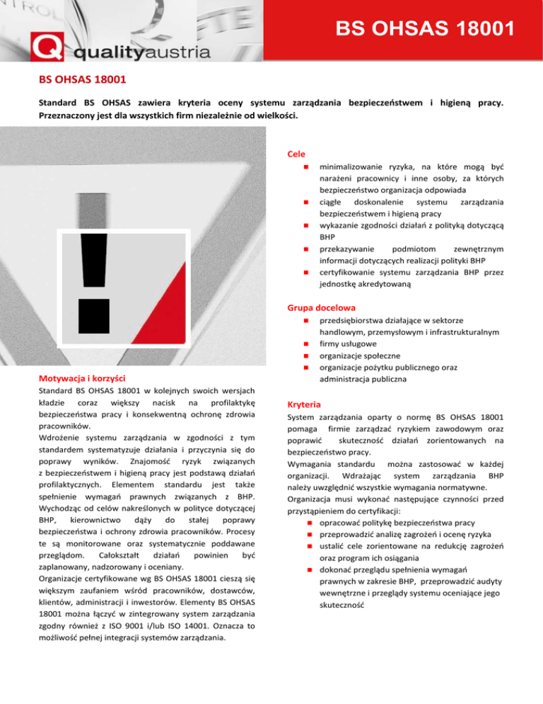 BS OHSAS 18001 BS OHSAS 18001 Standard BS OHSAS zawiera kryteria oceny systemu zarządzania bezpieczeństwem i higieną pracy. Przeznaczony jest dla wszystkich firm niezależnie od wielkości. Cele      minimalizowanie ryzyka, na które mogą być narażeni pracownicy i inne osoby, za których bezpieczeństwo organizacja odpowiada ciągłe doskonalenie systemu zarządzania bezpieczeństwem i higieną pracy wykazanie zgodności działań z polityką dotyczącą BHP przekazywanie podmiotom zewnętrznym informacji dotyczących realizacji polityki BHP certyfikowanie systemu zarządzania BHP przez jednostkę akredytowaną Grupa docelowa     Motywacja i korzyści Standard BS OHSAS 18001 w kolejnych swoich wersjach kładzie coraz większy nacisk na profilaktykę bezpieczeństwa pracy i konsekwentną ochronę zdrowia pracowników. Wdrożenie systemu zarządzania w zgodności z tym standardem systematyzuje działania i przyczynia się do poprawy wyników. Znajomość ryzyk związanych z bezpieczeństwem i higieną pracy jest podstawą działań profilaktycznych. Elementem standardu jest także spełnienie wymagań prawnych związanych z BHP. Wychodząc od celów nakreślonych w polityce dotyczącej BHP, kierownictwo dąży do stałej poprawy bezpieczeństwa i ochrony zdrowia pracowników. Procesy te są monitorowane oraz systematycznie poddawane przeglądom. Całokształt działań powinien być zaplanowany, nadzorowany i oceniany. Organizacje certyfikowane wg BS OHSAS 18001 cieszą się większym zaufaniem wśród pracowników, dostawców, klientów, administracji i inwestorów. Elementy BS OHSAS 18001 można łączyć w zintegrowany system zarządzania zgodny również z ISO 9001 i/lub ISO 14001. Oznacza to możliwość pełnej integracji systemów zarządzania. przedsiębiorstwa działające w sektorze handlowym, przemysłowym i infrastrukturalnym firmy usługowe organizacje społeczne organizacje pożytku publicznego oraz administracja publiczna Kryteria System zarządzania oparty o normę BS OHSAS 18001 pomaga firmie zarządzać ryzykiem zawodowym oraz poprawić skuteczność działań zorientowanych na bezpieczeństwo pracy. Wymagania standardu można zastosować w każdej organizacji. Wdrażając system zarządzania BHP należy uwzględnić wszystkie wymagania normatywne. Organizacja musi wykonać następujące czynności przed przystąpieniem do certyfikacji:  opracować politykę bezpieczeństwa pracy  przeprowadzić analizę zagrożeń i ocenę ryzyka  ustalić cele zorientowane na redukcję zagrożeń oraz program ich osiągania  dokonać przeglądu spełnienia wymagań prawnych w zakresie BHP, przeprowadzić audyty wewnętrzne i przeglądy systemu oceniające jego skuteczność BS OHSAS 18001 Akredytacja Kontakt Quality Austria od 22 maja 2009 roku posiada akredytację na certyfikowanie organizacji wg BS OHSAS, nadaną rozporządzeniem nr 153 Ministerstwa Gospodarki Austrii. Inne normy i standardy ISO 9001, ISO 14001, SCP, SA 8000, SQAS, SCC, EN13816 O Quality Austria Quality Austria GmbH jest Państwa kompetentnym partnerem dla zintegrowanych systemów zarządzania w zakresie jakości, środowiska, bezpieczeństwa pracy i standardów branżowych. Usługi świadczone przez Quality Austria obejmują zakres od szkoleń w zakresie międzynarodowych trendów i metod zarządzania, poprzez certyfikację systemów zarządzania na zgodność z międzynarodowymi standardami i krajowymi wymaganiami, aż po oceny w oparciu o model doskonałości EFQM. Quality Austria jest akredytowana przez BMWFJ w zakresie certyfikacji systemów zarządzania i certyfikacji personelu. Posiada również liczne, międzynarodowe dopuszczenia. Quality Austria z ponad 650 audytorami, trenerami i ekspertami technicznymi zapewnienia skuteczny transfer wiedzy, kompetencji i doświadczenia. Ścisły związek krajowego przedstawiciela z międzynarodowymi organizacjami tj. IQNet, EOQ i EFQM , a także współpraca z firmami: IPC, VDA-QMC , IATF dają niepowtarzalną szansę aktywnego uczestniczenia w wypracowywaniu wymagań standardów, które staną się powszechne w niedalekiej przyszłości. Stawia to klientów Quality Austria w niezwykle uprzywilejowanej pozycji. Ponad 12 tys. klientów w prawie 50 krajach osiąga poprzez tę współpracę wymierne korzyści, uzyskując efekt synergii. Michał Kubista Dyrektor Marketingu i Działu Szkoleń tel. 516687768 e-mail: [email protected] Quality Austria Polska Sp. z o.o. ul. Żwirki i Wigury 14 43-190 Mikołów Tel.: +48 32 226 60 07 Fax: +48 32 216 26 41 e-mail: [email protected] web: www.qualityaustria.com.pl