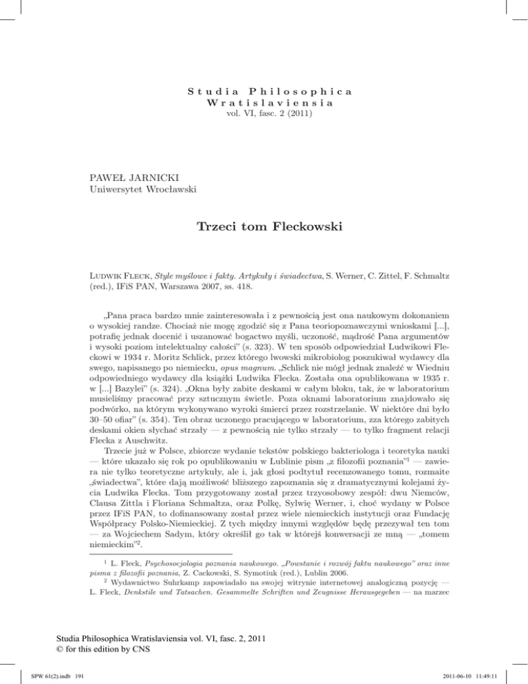 Studia Philosophica Wr a t i s l av i e n s i a vol. VI, fasc. 2 (2011) PAWEŁ JARNICKI Uniwersytet Wrocławski Trzeci tom Fleckowski LUDWIK FLECK, Style myślowe i fakty. Artykuły i świadectwa, S. Werner, C. Zittel, F. Schmaltz (red.), IFiS PAN, Warszawa 2007, ss. 418. „Pana praca bardzo mnie zainteresowała i z pewnością jest ona naukowym dokonaniem o wysokiej randze. Chociaż nie mogę zgodzić się z Pana teoriopoznawczymi wnioskami […], potrafię jednak docenić i uszanować bogactwo myśli, uczoność, mądrość Pana argumentów i wysoki poziom intelektualny całości” (s. 323). W ten sposób odpowiedział Ludwikowi Fleckowi w 1934 r. Moritz Schlick, przez którego lwowski mikrobiolog poszukiwał wydawcy dla swego, napisanego po niemiecku, opus magnum. „Schlick nie mógł jednak znaleźć w Wiedniu odpowiedniego wydawcy dla książki Ludwika Flecka. Została ona opublikowana w 1935 r. w […] Bazylei” (s. 324). „Okna były zabite deskami w całym bloku, tak, że w laboratorium musieliśmy pracować przy sztucznym świetle. Poza oknami laboratorium znajdowało się podwórko, na którym wykonywano wyroki śmierci przez rozstrzelanie. W niektóre dni było 30–50 ofiar” (s. 354). Ten obraz uczonego pracującego w laboratorium, zza którego zabitych deskami okien słychać strzały — z pewnością nie tylko strzały — to tylko fragment relacji Flecka z Auschwitz. Trzecie już w Polsce, zbiorcze wydanie tekstów polskiego bakteriologa i teoretyka nauki — które ukazało się rok po opublikowaniu w Lublinie pism „z filozofii poznania”1 — zawiera nie tylko teoretyczne artykuły, ale i, jak głosi podtytuł recenzowanego tomu, rozmaite „świadectwa”, które dają możliwość bliższego zapoznania się z dramatycznymi kolejami życia Ludwika Flecka. Tom przygotowany został przez trzyosobowy zespół: dwu Niemców, Clausa Zittla i Floriana Schmaltza, oraz Polkę, Sylwię Werner, i, choć wydany w Polsce przez IFiS PAN, to dofinansowany został przez wiele niemieckich instytucji oraz Fundację Współpracy Polsko-Niemieckiej. Z tych między innymi względów będę przezywał ten tom — za Wojciechem Sadym, który określił go tak w którejś konwersacji ze mną — „tomem niemieckim”2. 1 L. Fleck, Psychosocjologia poznania naukowego. „Powstanie i rozwój faktu naukowego” oraz inne pisma z filozofii poznania, Z. Cackowski, S. Symotiuk (red.), Lublin 2006. 2 Wydawnictwo Suhrkamp zapowiadało na swojej witrynie internetowej analogiczną pozycję — L. Fleck, Denkstile und Tatsachen. Gesammelte Schriften und Zeugnisse Herausgegeben — na marzec Studia Philosophica Wratislaviensia vol. VI, fasc. 2, 2011 © for this edition by CNS SPW 61(2).indb 191 2011-06-10 11:49:11 192 Recenzje W recenzji tomu lubelskiego3 wyróżniłem dwa przedmioty recenzji. Podobnie będzie i tutaj: 1) działania i zaniechania redaktorów oraz 2) treść tekstów składających się na tom. W pierwszej części najpierw 1a) omówię kompozycję tomu, następnie 1b) skomentuję wstęp redaktorów, by przejść do 1c) krótkiego porównania tłumaczeń i 1d) kwestii edytorskich. Charakter tego tomu nie pozwala jednak na tak ścisłe oddzielenie pierwszego od drugiego, punkt drugi będzie więc uzupełnieniem tego, co nie zostało powiedziane w trakcie omawiania pierwszego. 1a) Recenzując tom niemiecki, nie sposób nie odnosić się do tomu lubelskiego, gdyż mamy tu do czynienia z niecodzienną sytuacją, gdy w odstępie roku ukazują się dwa zbiorowe wydania jednego autora. Choć w tomie niemieckim nie przedrukowywano po raz kolejny polskiego tłumaczenia Powstania i rozwoju faktu naukowego (ambicją redaktorów nie było opracowanie „pism zebranych”), dzięki czemu znalazło się miejsce na materiały archiwalne, to jednak w obu tomach powtarza się aż dwanaście artykułów Flecka i dwa teksty polemiczne Tadeusza Bilikiewicza. Niemal 45% więc z 418 stron4 to przedruk tekstów, które ukazały się rok wcześniej w tomie lubelskim. Dziewięć z nich to przedruki tekstów polskich, trzy to artykuły przetłumaczone po raz drugi przez Sylwię Werner. Siłą rzeczy w takiej sytuacji nasuwa się pytanie: czy był sens po raz drugi drukować to samo? Czy nie należało zrezygnować z przedrukowywania tych tekstów i stworzyć tom, co prawda skromniejszy, ale dopasowany do aktualnych realiów wydawniczych w Polsce? Powstał bowiem tom, który byłby idealnym uzupełnieniem wydania Powstania i rozwoju faktu naukowego z 1986 r.5 Takie było najpewniej słuszne pierwsze zamierzenie redaktorów. Ukazał się jednak wcześniej tom lubelski. Chyba byłoby lepiej zrezygnować z dublowania tych dziewięciu polskich artykułów (poprzestać ewentualnie na zamieszczeniu tłumaczeń, jeśli już były gotowe i redaktorzy uważali je za lepsze od poprzednich), a dołożyć więcej materiałów o charakterze biograficznym i stworzyć tom w pełni oryginalny oraz, jak chcą redaktorzy we wstępie, obrazujący „kontekst kulturowy” twórczości Flecka (s. 35). Prace obu zespołów prowadzone były z pewnością równocześnie, jednak redaktorzy niemieckiego tomu zdążyli już odnotować we wstępie i bibliografii ukazanie się tomu lubelskiego. Mimo to nie zdecydowali się na zmianę kształtu wydawnictwa. Trzy części, z jakich składa się tom, opatrzone są z jednej strony Wstępem oraz kalendarium Ludwik Fleck: Życie i dzieło, z drugiej Bibliografią prac Ludwika Flecka. Kalendarium jest rzeczą niezwykle cenną, pozwoli uporządkować podstawowe informacje biograficzne6. Również przedruk bibliografii wszystkich prac (nie tylko teoretycznych) Flecka należy ocenić wysoko, gdyż ostatnia taka pozycja drukowana w Polsce liczy przeszło 70 pozycji mniej, powstała bowiem w 1978 r., gdy badania nad spuścizną Flecka dopiero się rozpoczynały7. 2010 r.; obecnie zapowiedź przesunięto na styczeń 2011 r. W tej zapowiedzi w zespole brakuje już Floriana Schmaltza. 3 Przyczyny