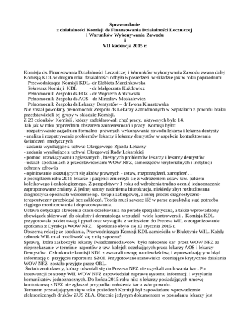 Sprawozdanie z działalności Komisji ds Finansowania Działalności Leczniczej i Warunków Wykonywania Zawodu i VII kadencja 2015 r. Komisja ds. Finansowania Działalności Leczniczej i Warunków wykonywania Zawodu zwana dalej Komisją KDL w drugim roku działalności odbyła 6 posiedzeń w składzie jak w roku poprzednim: Przewodnicząca Komisji KDL -dr Elżbieta Marcinkowska Sekretarz Komisji KDL - dr Małgorzata Kużdowicz Pełnomocnik Zespołu ds POZ - dr Wojciech Antkowiak Pełnomocnik Zespołu ds AOS - dr Mirosław Moskalewicz Pełnomocnik Zespołu ds Lekarzy Dentystów – dr Iwona Kinastowska Nie został powołany pełnomocnik Zespołu ds Lekarzy Zatrudnionych w Szpitalach z powodu braku przedstawicieli tej grupy w składzie Komisji. Z 23 członków Komisji , którzy zadeklarowali chęć pracy, aktywnych było 14. Tak jak w roku poprzednim obszarem zainteresowań i pracy Komisji było: - rozpatrywanie zagadnień formalno- prawnych wykonywania zawodu lekarza i lekarza dentysty - analiza i rozpatrywanie problemów lekarzy i lekarzy dentystów w aspekcie kontraktowania świadczeń medycznych - zadania wynikające z uchwał Okręgowego Zjazdu Lekarzy - zadania wynikające z uchwał Okręgowej Rady Lekarskiej - pomoc rozwiązywaniu zgłaszanych , bieżących problemów lekarzy i lekarzy dentystów - udział spotkaniach z przedstawicielami WOW NFZ, samorządów terytorialnych i instytucji ochrony zdrowia - opiniowanie ukazujących się aktów prawnych - ustaw, rozporządzeń, zarządzeń… z początkiem roku 2015 lekarze i pacjenci zmierzyli się z wdrożeniem ustaw tzw. pakietu kolejkowego i onkologicznego. Z perspektywy 1 roku od wdrożenia trudno ocenić jednoznacznie zaproponowane zmiany. Z jednej strony nadmierna biurokracja, niekiedy zbyt rozbudowana diagnostyka opóźniała wdrożenie np. terapii zabiegowej, z innej proces diagnostycznoterapeutyczny przebiegał bez zakłóceń. Teoria musi zawsze iść w parze z praktyką stąd potrzeba ciągłego monitorowania i dopracowywania. Ustawa dotycząca skrócenia czasu oczekiwania na poradę specjalistyczną, a także wprowadzony obowiązek skierowań do okulisty i dermatologa wzbudził wiele kontrowersji . Komisja KDL przygotowała pakiet uwag i pytań oraz wystąpiła z wnioskiem do Prezesa WIL o zorganizowanie spotkania z Dyrekcja WOW NFZ. Spotkanie obyło się 13 stycznia 2015 r. Obszerną relację ze spotkania, Przewodnicząca Komisji KDL zamieściła w Biuletynie WIL. Każdy członek WIL miał możliwość się z nią zapoznać. Sprawą, która zaskoczyła lekarzy świadczeniodawców było nałożenie kar przez WOW NFZ za nieprzekazanie w terminie raportów z tzw. kolejek oczekujących przez lekarzy AOS i lekarzy Dentystów. Członkowie komisji KDL z zwracali uwagę na niewłaściwą i wprowadzający w błąd informację o przyjęciu raportu na SZOI. Przygotowane stanowisko oceniające krytycznie działania WOW NFZ zostało przyjęte przez ORL. Świadczeniodawcy, którzy odwołali się do Prezesa NFZ nie uzyskali anulowania kar . Po interwencji ze strony WIL WOW NFZ zapowiedział naprawę systemu informacji i wysyłanie komunikatów jednoznacznych. Do końca 2015 roku nikt z lekarzy posiadających umowę kontraktową z NFZ nie zgłaszał przypadku nałożenia kar z w/w powodu. Tematem przewijającym się w toku posiedzeń Komisji był zapowiadane wprowadzenie elektronicznych druków ZUS ZLA. Obecnie jedynym dokumentem w posiadaniu lekarzy jest „Decyzja w spawie upoważnienia do wystawiania zaświadczeń lekarskich o czasowej niezdolności do pracy.” Wprowadzenie systemu elektronicznego zmienia zasady wystawiania w/w zaświadczeń. Jest to z całą pewnością system bardziej kosztowny/ sprzęt, łącze internetowe konieczne dla korzystania z konta na PUE lub podpis elektroniczny/, nie skraca w sposób zdecydowany czasu na wystawienie druku a w przypadku awarii systemu lub awarii zasilania staje się bezużyteczny. Odpowiedzialnością obarczony jest lekarz, któremu po raz kolejny zabiera się czas przeznaczony dla pacjenta. Jedynym beneficjentem systemu pozostaje urzędnik ZUS. Lekarze nie uchylają się od nowoczesnych rozwiązań, ale warunkiem przystąpienia do systemu powinna być jego niezawodność, rzeczywiste skrócenie czasu i właściwy poziom finansowania. Tu Komisja poparła pismo NRL. Wprowadzenie możliwości wystawiania recept przez pielęgniarki było tez tematem dyskusji. Miało w zamierzeniu ustawodawcy odciążyć lekarzy w wypisywaniu recept co przy ograniczeniu substancji leczniczych na receptach , do których upoważnione są pielęgniarki, jest fikcja. Ze strony środowiska pielęgniarskiego nie ma również euforii. Brak szkoleń, duża odpowiedzialność. Drugie półrocze 201 r. przyniosło zmiany na najwyższych szczeblach władzy naszego kraju, w tym na stanowisku Ministra Zdrowia. Został nim wieloletni działacz Izby Lekarskiej , były Prezes NIL. W wystosowanym piśmie do obecnego Prezesa NIL, Minister zwrócił się o przekazanie proponowanych zmian, rozwiązań. Komisja również przekazała uwagi. Ujmując krótko stoimy na stanowisko, że w ambulatoryjnej opiece zdrowotnej powinien być utrzymany system kontraktowania świadczeń medycznych. W trakcie każdego posiedzenia omawiano bieżące problemy lekarzy świadczeniodawców, rozbudowana sprawozdawczość do NFZ, zawodność systemu e-WUŚ, brak ze strony lekarzy stosowania się do tzw zasad współpracy – zawartych w warunkach ogólnych umów / Rozporządzenie Ministra Zdrowia/. Na forum dyskusyjnym środowiska lekarskiego wielokrotnie przewija się zdanie, że należy budować i promować dobry wizerunek lekarzy. Bez poprawy wzajemnych relacji, dobrej współpracy między lekarzami i okazywanego szacunku, ten proces jest niemożliwy. Elżbieta Marcinkowska Przewodnicząca Komisji ds. Finansowania Działalności Leczniczej i Warunków Wykonywania Zawodu
