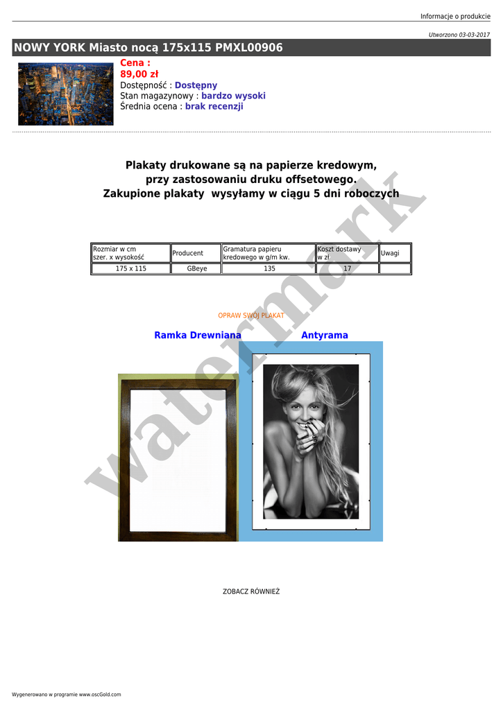 Informacje o produkcie Utworzono 03-03-2017 NOWY YORK Miasto nocą 175x115 PMXL00906 Cena : 89,00 zł Dostępność : Dostępny Stan magazynowy : bardzo wysoki Średnia ocena : brak recenzji er m ar k Plakaty drukowane są na papierze kredowym, przy zastosowaniu druku offsetowego. Zakupione plakaty wysyłamy w ciągu 5 dni roboczych Rozmiar w cm szer. x wysokość 175 x 115 Producent Gramatura papieru kredowego w g/m kw. GBeye 135 Koszt dostawy w zł 17 OPRAW SWÓJ PLAKAT w at Ramka Drewniana ZOBACZ RÓWNIEŻ Wygenerowano w programie www.oscGold.com Antyrama Uwagi RAMY DREWNIANE er m ar k ANTYRAMY w at TABLICE KORKOWE PLAKATY