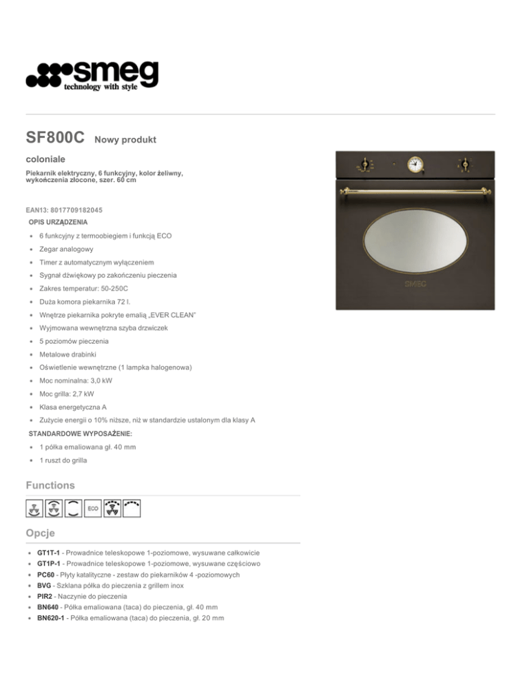 SF800C Nowy produkt coloniale Piekarnik elektryczny, 6 funkcyjny, kolor żeliwny, wykończenia złocone, szer. 60 cm EAN13: 8017709182045 OPIS URZĄDZENIA 6 funkcyjny z termoobiegiem i funkcją ECO Zegar analogowy Timer z automatycznym wyłączeniem Sygnał dźwiękowy po zakończeniu pieczenia Zakres temperatur: 50-250C Duża komora piekarnika 72 l. Wnętrze piekarnika pokryte emalią „EVER CLEAN” Wyjmowana wewnętrzna szyba drzwiczek 5 poziomów pieczenia Metalowe drabinki Oświetlenie wewnętrzne (1 lampka halogenowa) Moc nominalna: 3,0 kW Moc grilla: 2,7 kW Klasa energetyczna A Zużycie energii o 10% niższe, niż w standardzie ustalonym dla klasy A STANDARDOWE WYPOSAŻENIE: 1 półka emaliowana gł. 40 mm 1 ruszt do grilla Functions Opcje GT1T-1 - Prowadnice teleskopowe 1-poziomowe, wysuwane całkowicie GT1P-1 - Prowadnice teleskopowe 1-poziomowe, wysuwane częściowo PC60 - Płyty katalityczne - zestaw do piekarników 4 -poziomowych BVG - Szklana półka do pieczenia z grillem inox PIR2 - Naczynie do pieczenia BN640 - Półka emaliowana (taca) do pieczenia, gł. 40 mm BN620-1 - Półka emaliowana (taca) do pieczenia, gł. 20 mm BNP608T - Półka pokryta teflonem gł. 8 mm MDB - Uchwyt podwójny do wysuwania półek MAN - Uchwyt do bezpiecznego wysuwania półki PPR2 - Płyta do pieczenia pizzy PRTX - Płyta z uchwytami do pieczenia pizzy PALPZ - Łopatka do pizzy PR3845X - Listwa maskująca inox z powłoką antyśladową XSPLEND-2 - Detergent (spray) do codziennego czyszczenia Wersje SF800AVO - jasny brąz, pokrętła z mosiądzu SF800AO - antracyt, pokrętła z mosiądzu SF800PO - kremowy, pokrętła z mosiądzu SMEG S.p.A. Via Leonardo da Vinci, 4 42016 Guastalla (RE) Tel. 0522 821 1 SF800C coloniale z obiegiem powietrza 60 cm szare żeliwo klasa energochłonności A elektryczne piekarniki wielofunkcyjne WENTYLATOR, GRZAŁKA DOLNA: Dodanie dolnej grzałki do wymuszonego obiegu podnosi temperaturę w dolnej części potrawy, zapewniając jej skuteczniejsze pieczenie środka bez przypiekania powierzchni. WENTYLATOR, GRZAŁKA GÓRNA I DOLNA: Grzałki w połączeniu z wentylatorem zapewniają równomierną temperaturę w całej komorze. Jest to metoda dająca podobne efekty do pieczenia tradycyjnego. Mniej wydajna od użycia wentylatora i 3 grzalek. Najlepsza do wypieku ciast. GRZAŁKA GÓRNA I DOLNA: Włączenie tych 2 grzałek stosuje się w pieczeniu tradycyjnym, odpowiednim do przygotowanie potraw wymagających delikatnego podgrzewania, jak np. pieczenie ciasta. Piekarnik powinien zostać wstępnie nagrzany do wymaganej temperatury, a naczynie ustawione po środku. Jest to metoda , która najlepiej sprawdza się w przypadku większych, pojedynczych wypieków. ECO: Ustawienie ECO pozwala na szybkie wstępne podgrzanie piekarnika. Włączenie dolnej grzałki, grzałki grilla i wentylatora zapewnienia optymalną wydajność. Funkcja jest użyteczna w połączeniu z wybranym zasadniczym programem pieczenia. WENTYLATOR I GRZAŁKA GRILLA: Pieczenie przy uzyciu tej funkcji musi przebiegać przy zamkniętych drzwiczkach. Wentylator łagodzi silne grzanie grilla, jednocześnie zapewniając doskonałe grillowanie bez potrzeby odwracania pieczonej potrawy. Otrzymujemy potrawę doskonale przypieczoną, a zarazem soczystą. Najlepsze efekty zapewnia pieczenie na dwóch górnych półkach. Dolna część piekarnika może być w tym czasie wykorzystana do podgrzania innych potraw. GRZAŁKA GRILLA: Funkcja uzywana do szybkiego podgrzewania. Aby uzyskać najlepsze rezultaty należy małe potrawy umieścić na górnej półce, a potrawy większe - na dolnej (np. mięso, lub kiełbasę). Najlepsze efekty uzyskuje się przy zamkniętych drzwiczkach, chyba że przepis podpowiada co innego. SMEG S.p.A. Via Leonardo da Vinci, 4 42016 Guastalla (RE) Tel. 0522 821 1 SF800C coloniale z obiegiem powietrza 60 cm szare żeliwo klasa energochłonności A elektryczne piekarniki wielofunkcyjne SMEG S.p.A. Via Leonardo da Vinci, 4 42016 Guastalla (RE) Tel. 0522 821 1