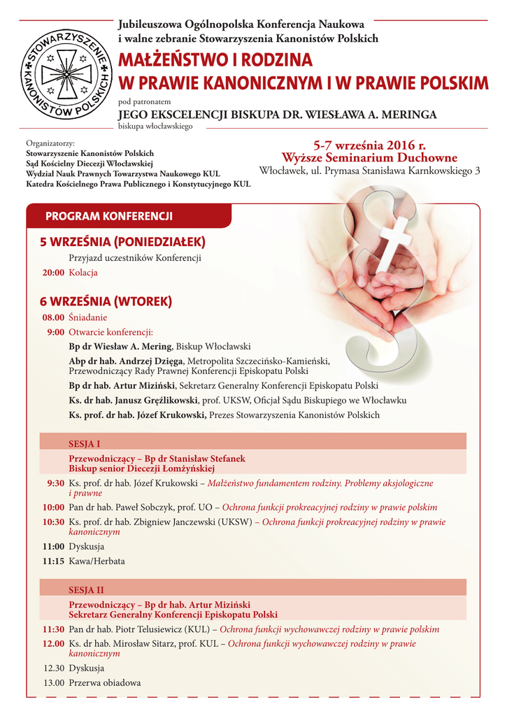 Jubileuszowa Ogólnopolska Konferencja Naukowa i walne zebranie Stowarzyszenia Kanonistów Polskich MAŁŻEŃSTWO I RODZINA W PRAWIE KANONICZNYM I W PRAWIE POLSKIM pod patronatem JEGO EKSCELENCJI BISKUPA DR. WIESŁAWA A. MERINGA biskupa włocławskiego Organizatorzy: Stowarzyszenie Kanonistów Polskich Sąd Kościelny Diecezji Włocławskiej Wydział Nauk Prawnych Towarzystwa Naukowego KUL Katedra Kościelnego Prawa Publicznego i Konstytucyjnego KUL 5-7 września 2016 r. Wyższe Seminarium Duchowne Włocławek, ul. Prymasa Stanisława Karnkowskiego 3 PROGRAM KONFERENCJI 5 WRZEŚNIA (PONIEDZIAŁEK) Przyjazd uczestników Konferencji 20:00Kolacja 6 WRZEŚNIA (WTOREK) 08.00Śniadanie 9:00 Otwarcie konferencji: Bp dr Wiesław A. Mering, Biskup Włocławski Abp dr hab. Andrzej Dzięga, Metropolita Szczecińsko-Kamieński, Przewodniczący Rady Prawnej Konferencji Episkopatu Polski Bp dr hab. Artur Miziński, Sekretarz Generalny Konferencji Episkopatu Polski Ks. dr hab. Janusz Gręźlikowski, prof. UKSW, Oficjał Sądu Biskupiego we Włocławku Ks. prof. dr hab. Józef Krukowski, Prezes Stowarzyszenia Kanonistów Polskich Sesja I Przewodniczący – Bp dr Stanisław Stefanek Biskup senior Diecezji Łomżyńskiej 9:30 Ks. prof. dr hab. Józef Krukowski – Małżeństwo fundamentem rodziny. Problemy aksjologiczne i prawne 10:00Pan dr hab. Paweł Sobczyk, prof. UO – Ochrona funkcji prokreacyjnej rodziny w prawie polskim 10:30Ks. prof. dr hab. Zbigniew Janczewski (UKSW) – Ochrona funkcji prokreacyjnej rodziny w prawie kanonicznym 11:00Dyskusja 11:15Kawa/Herbata Sesja II Przewodniczący – Bp dr hab. Artur Miziński Sekretarz Generalny Konferencji Episkopatu Polski 11:30Pan dr hab. Piotr Telusiewicz (KUL) – Ochrona funkcji wychowawczej rodziny w prawie polskim 12.00Ks. dr hab. Mirosław Sitarz, prof. KUL – Ochrona funkcji wychowawczej rodziny w prawie kanonicznym 12.30Dyskusja 13.00 Przerwa obiadowa Jubileuszowa Ogólnopolska Konferencja Naukowa i walne zebranie Stowarzyszenia Kanonistów Polskich MAŁŻEŃSTWO I RODZINA W PRAWIE KANONICZNYM I W PRAWIE POLSKIM 5-7 września 2016 r. PROGRAM KONFERENCJI – cd Sesja III Przewodniczący – Ks. dr hab. Piotr Stanisz, prof. KUL Dziekan Wydziału Prawa, Prawa Kanonicznego i Administracji KUL 14.30Ks. prof. dr hab. Wojciech Góralski (UKSW) – Problem Komunii św. katolików żyjących w małżeństwie cywilnym 15.00Dyskusja 15.30Kawa/Herbata 15.45Ks. dr hab. Leszek Adamowicz, prof. KUL – Małżeństwa katolików z prawosławnymi 16.15Ks. prof. dr hab. Ginter Dzierżon (UKSW) – Małżeństwa katolików z muzułmanami 16.45Dyskusja 18.00Msza św. koncelebrowana w Katedrze Włocławskiej 19.45Walne Zebranie Stowarzyszenia Kanonistów Polskich 20.15 Kolacja – spotkanie koleżeńskie 7 WRZEŚNIA (ŚRODA) 7.00 Msza św. koncelebrowana – Kościół seminaryjny 8.00Śniadanie Sesja IV Przewodniczący – Bp Antoni Dziemianko Biskup Diecezji Pińskiej 9.00Abp dr Stanisław Gądecki – Synod Biskupów na temat małżeństwa i rodziny 10.00Dyskusja 10.30Kawa/Herbata Sesja V – Nowa procedura orzekania nieważności małżeństwa Przewodniczący – Bp Marian Buczek Biskup senior Diecezji Charkowsko-Zaporoskiej 11.00Ks. dr hab. Piotr Majer (UPJPII) – Proces skrócony – szanse i obawy 11.30Ks. prof. dr hab. Tomasz Rozkrut (UPJPII) – Apelacja w kanonicznym procesie małżeńskim 12.00O. dr hab. Piotr Skonieczny (UPJPII) – Jedno czy wiele postępowań w sprawach małżeńskich? O jedności procesu małżeńskiego po m.p. Mitis Iudex Dominus Iesus 12.30Dyskusja 13.00 Zamknięcie konferencji 13.15Obiad 14.15Możliwość zwiedzenie Muzeum bł. ks. Jerzego Popiełuszki
