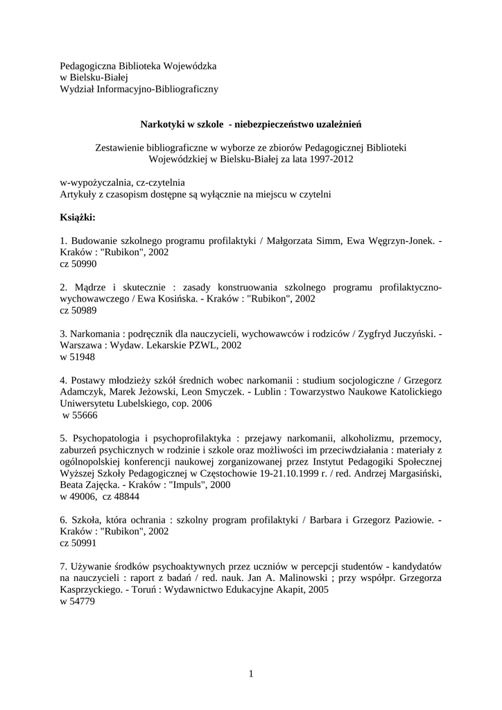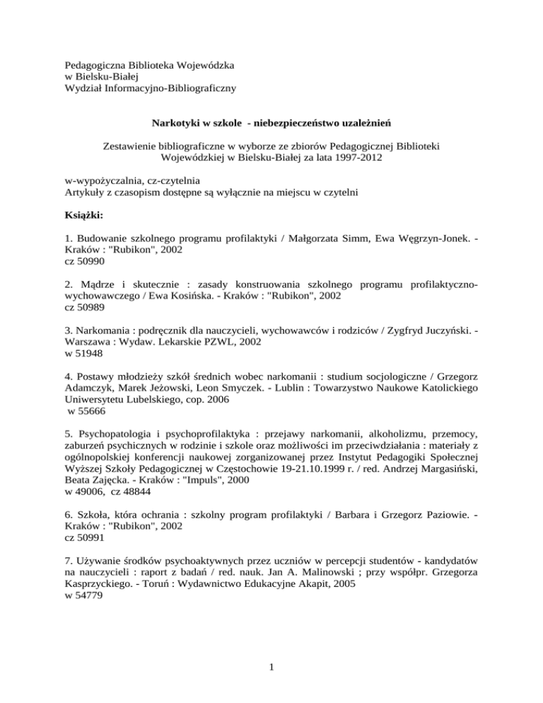 Pedagogiczna Biblioteka Wojewódzka w Bielsku-Białej Wydział Informacyjno-Bibliograficzny Narkotyki w szkole - niebezpieczeństwo uzależnień Zestawienie bibliograficzne w wyborze ze zbiorów Pedagogicznej Biblioteki Wojewódzkiej w Bielsku-Białej za lata 1997-2012 w-wypożyczalnia, cz-czytelnia Artykuły z czasopism dostępne są wyłącznie na miejscu w czytelni Książki: 1. Budowanie szkolnego programu profilaktyki / Małgorzata Simm, Ewa Węgrzyn-Jonek. Kraków : "Rubikon", 2002 cz 50990 2. Mądrze i skutecznie : zasady konstruowania szkolnego programu profilaktycznowychowawczego / Ewa Kosińska. - Kraków : "Rubikon", 2002 cz 50989 3. Narkomania : podręcznik dla nauczycieli, wychowawców i rodziców / Zygfryd Juczyński. Warszawa : Wydaw. Lekarskie PZWL, 2002 w 51948 4. Postawy młodzieży szkół średnich wobec narkomanii : studium socjologiczne / Grzegorz Adamczyk, Marek Jeżowski, Leon Smyczek. - Lublin : Towarzystwo Naukowe Katolickiego Uniwersytetu Lubelskiego, cop. 2006 w 55666 5. Psychopatologia i psychoprofilaktyka : przejawy narkomanii, alkoholizmu, przemocy, zaburzeń psychicznych w rodzinie i szkole oraz możliwości im przeciwdziałania : materiały z ogólnopolskiej konferencji naukowej zorganizowanej przez Instytut Pedagogiki Społecznej Wyższej Szkoły Pedagogicznej w Częstochowie 19-21.10.1999 r. / red. Andrzej Margasiński, Beata Zajęcka. - Kraków : "Impuls", 2000 w 49006, cz 48844 6. Szkoła, która ochrania : szkolny program profilaktyki / Barbara i Grzegorz Paziowie. Kraków : "Rubikon", 2002 cz 50991 7. Używanie środków psychoaktywnych przez uczniów w percepcji studentów - kandydatów na nauczycieli : raport z badań / red. nauk. Jan A. Malinowski ; przy współpr. Grzegorza Kasprzyckiego. - Toruń : Wydawnictwo Edukacyjne Akapit, 2005 w 54779 1 8. Wygrać życie : szkolny program profilaktyki / Krzysztof Wojcieszek. - Kraków : "Rubikon", 2002 cz 50992 Artykuły z książek: 1. Drogi przyjacielu... : scenariusz przedstawienia dotyczącego profilaktyki narkomanii / Małgorzata Sokołowska [i in.] // W: Scenariusze uroczystości szkolnych : gimnazjum i szkoły ponadgimnazjalne. Cz. 2 / pod red. Krystyny Radwan. - Kraków, 2005. - S. 142-151 cz 60862 2. Problemy narkomanii // W: Trudne tematy : propozycje godzin wychowawczych / Ewa Grzesiak, Renata Janicka-Szyszko, Magdalena Steblecka. - Gdańsk, 2005. - S. 46-50 cz 54840 Scenariusz zajęć dla szkół ponadgimnazjalnych przeznaczone na godzinę wychowawczą. 3. Projekt profilaktyki wychowania antynarkotykowego w programach nauczania I stopnia w szkołach podstawowych w Czechach i na Słowacji / Adriana Wiegerova // W: Socjologiczne i psychopedagogiczne aspekty przemocy / pod red. Joanny Wawrzyniak. - Łódź, 2007. - S. 231-237 cz 59667 4. Quo vadis homo? : przedstawienie dla gimnazjalistów na temat narkomanii // W: Czas na scenę : scenariusze przedstawień szkolnych / Hanna Szeląg. - Kraków, 2005. - S. 103-113 cz 54014 5. Uzależnienia młodzieży od substancji psychoaktywnych i przeciwdziałanie im w profilaktyce szkolnej / Śledzianowski Jan // W: Zjawiskowe formy patologii społecznych oraz profilaktyka i resocjalizacja młodzieży / red. Teresa Sołtysiak, Jolanta Sudar-Malukiewicz. Bydgoszcz, 2003. - S. 420-431 cz 51846 Artykuły z czasopism: 1. "Ja brałem, ty nie musisz" - propozycja projektu dla szkół średnich / Barbara Skrobutan // Wychowanie na co dzień. - 2005, nr 10/11, dod. s. XV-XVI 2. Dlaczego "biorą"? / Ewa Dembek // Drama. - 1999, nr 29, s. 17-19 Konspekt lekcji do wykorzystania na godzinie wychowawczej w szkole podstawowej. 3. Interwencja w szkole - strategia profilaktyki informacyjnej w przeciwdziałaniu uzależnieniom / Łukasz Kołomański // Wychowanie na co dzień. - 2008, nr 7/8, dod. s. I-VI 4. Konkurs : uzależnieniom - Nie / Irena Ochrin, Grażyna Rudnicka, Bożena Kakowska // Wszystko dla Szkoły. - 2006, nr 2, s. 12-13 5. Metodyka pracy socjalnej w kopenhaskiej "Kofoeds Skole" / Jens Aage Bjorkoe // Auxilium Sociale. - 1997 , nr 2 , dod. "Wkładka informacyjna" s. 35-41 2 6. Narkomania wśród uczniów szkół gimnazjalnych / Michał Pindera // Nauczyciel i Szkoła. 2007, nr 3/4, s. 131-135 7. Nauczyciel - realizator profilaktyki szkolnej / Dorota Macander // Serwis Informacyjny Narkomania. - 2008, nr 1, s. 38-42 8. Pierwsze symptomy zjawiska narkomanii na terenie szkoły / Aneta Skuza // Wychowanie na co dzień. - 2008, nr 10/11, s. 3-5 9. Podwórko marzeń : sztuka dla najmłodszych podejmująca problemy narkomanii / Małgorzata Kamińska-Sobczyk // Problemy Narkomanii. - 1998 , nr 2 , s. 69-99 10. Polska młodzież na tle Europy : używanie substancji psychoaktywnych w badaniach szkolnych (ESPAD) / Janusz Sierosławski // Świat Problemów. - 2002, nr 4, s. 4-6 11. Problem narkomanii w opinii uczniów : na przykładzie badań młodzieży ponadgimnazjalnej w Słupsku / Danuta Narożna // Lider. - 2008, nr 1, s. 18-21 12. Profilaktyka uzależnień w szkole / Elżbieta Rajwa // Wychowawca. - 1998 , nr 5 , s. 22-23 13. Program pracy z młodzieżą w ramach zintegrowanego modelu oddziaływań profilaktycznych w gimnazjach i szkołach ponadgimnazjalnych / Ewa Proch-Masłowska // Problemy Narkomanii. - 2003, nr 4, s. 51-54 14. Propozycja modelu oddziaływań profilaktycznych w gimnazjach i szkołach ponadpodstawowych / Ewa Proch-Masłowska // Problemy Narkomanii. - 2003, nr 3, s. 32-38 15. Rozpowszechnienie używania substancji psychoaktywnych wśród młodzieży gimnazjalnej w Iławie, 2001-2005-2010 / Krzysztof Bobrowisk. – Alkoholizm i Narkomania. – 2012, nr 1, s. 37-56 16. Scenariusz przedstawienia profilaktycznego : "Narkotykom mówimy STOP" / Bożena Kamrowska // Wszystko dla Szkoly. - 2006, nr 2, s. 16-17 17. Skala zjawisk patologicznych oraz zagrożenia w wieku szkolnym : komunikat z badania socjologicznego / Krzysztof Socha // Problemy Narkomanii. - 1998, nr 1, s. 31-38 18. Skutki zażywania narkotyków w opinii uczniów szkoły średniej / Ewa Mędr