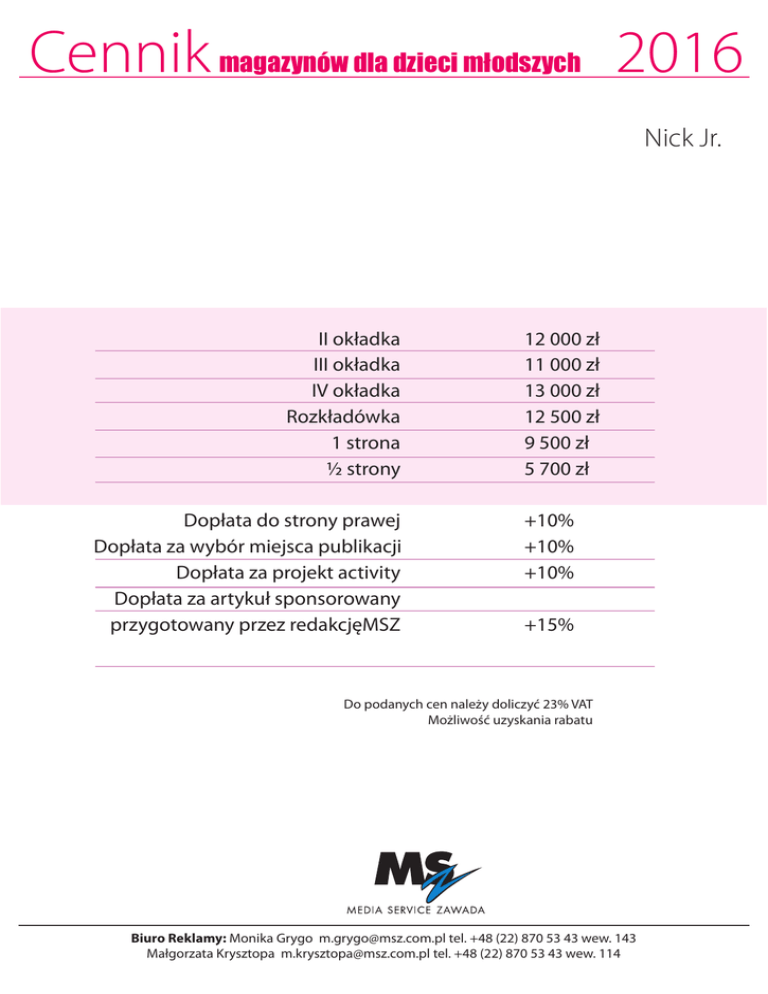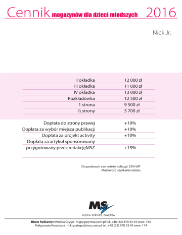 Cennik magazynów dla dzieci młodszych 2016 Nick Jr. II okładka III okładka IV okładka Rozkładówka 1 strona ½ strony Dopłata do strony prawej Dopłata za wybór miejsca publikacji Dopłata za projekt activity Dopłata za artykuł sponsorowany przygotowany przez redakcjęMSZ 12 000 zł 11 000 zł 13 000 zł 12 500 zł 9 500 zł 5 700 zł +10% +10% +10% +15% Do podanych cen należy doliczyć 23% VAT Możliwość uzyskania rabatu Biuro Reklamy: Monika Grygo [email protected] tel. +48 (22) 870 53 43 wew. 143 Małgorzata Krysztopa [email protected] tel. +48 (22) 870 53 43 wew. 114