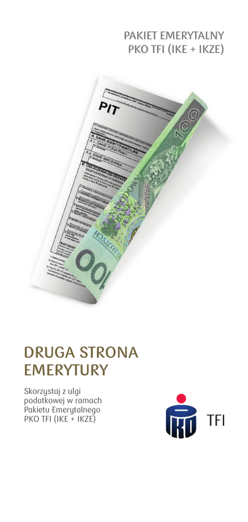 PAKIET EMERYTALNY PKO TFI (IKE + IKZE) DRUGA STRONA EMERYTURY Skorzystaj z ulgi podatkowej w ramach Pakietu Emerytalnego PKO TFI (IKE + IKZE) PAKIET EMERYTALNY PKO TFI (IKE + IKZE) Inwestycja w ramach Pakietu Emerytalnego PKO TFI (IKE + IKZE) wykorzystuje potencjał trzech produktów oszczędnościowych: • Indywidualnego Konta Zabezpieczenia Emerytalnego (IKZE) • Indywidualnego Konta Emerytalnego (IKE) • Wyspecjalizowanego Programu Inwestycyjnego (WPI) Dzięki temu otrzymujesz możliwość elastycznego gromadzenia kapitału na dodatkową emeryturę, a równocześnie zyskujesz korzyści podatkowe w ramach rozwiązań emerytalnych III filaru dostępnych na polskim rynku kapitałowym. Zalety Niższy podatek dochodowy Inwestycja w IKZE pozwala skorzystać z ulgi w podatku dochodowym w każdym roku kalendarzowym. Dodatkowo przy wypłacie środków po osiągnięciu wieku emerytalnego zapłacisz tylko 10% zryczałtowanego podatku. Brak zryczałtowanego podatku od zysków kapitałowych Jeśli wypłacasz oszczędności z IKE po osiągnięciu wieku emerytalnego, zostaniesz zwolniony z 19% podatku od dochodów kapitałowych. Brak opłat manipulacyjnych Wszystkie Twoje wpłaty są zwolnione z opłat manipulacyjnych. Niższe opłaty za zarządzanie Wynagrodzenie za zarządzanie subfunduszami wchodzącymi w skład Pakietu jest niższe niż opłaty w standardowych funduszach. Dzięki temu zwiększasz wynik inwestycyjny. Inwestycja zgodnie z wiekiem Skład portfela inwestycyjnego subfunduszy oferowanych w ramach Pakietu automatycznie dopasowuje się do Twojego wieku, tzn. im bliżej wieku emerytalnego jesteś, tym większe zaangażowanie Twoich środków w bezpieczne instrumenty finansowe. Gotowe rozwiązania inwestycyjne Nie musisz zastanawiać się nad wyborem odpowiedniej strategii. Wystarczy, że wskażesz rok swojego przejścia na emeryturę, a Program automatycznie dostosuje się do etapu Twojego życia. Zabezpieczenie najbliższych Środki gromadzone w Pakiecie Emerytalnym PKO TFI (IKE + IKZE) w razie Twojej śmierci zostaną przekazane osobom przez Ciebie wskazanym. Jak to działa? Dokonujesz wpłat na jeden rachunek, z którego środki są automatycznie lokowane pomiędzy trzy produkty oszczędnościowe: • w pierwszej kolejności jest zasilany rachunek IKZE – do wyczerpania limitu wpłat • następnie nadwyżka środków jest przenoszona na rachunek IKE • po wyczerpaniu limitu wpłat na IKZE i IKE pozostały kapitał jest deponowany na rachunku WPI Oszczędności są inwestowane w specjalnie utworzonym funduszu inwestycyjnym PKO Zabezpieczenia Emerytalnego – sfio. W skład funduszu wchodzi pięć subfunduszy przeznaczonych dla klientów w określonych grupach wiekowych. WŁASNY KAPITAŁ RACHUNEK IKZE RACHUNEK IKE RACHUNEK WPI FUNDUSZ PKO ZABEZPIECZENIA EMERYTALNEGO – SFIO Fundusz inwestycyjny PKO Zabezpieczenia Emerytalnego – sfio Grupa wiekowa Profil ryzyka* PKO Zabezpieczenia Emerytalnego – 2020 1950-1959 2 PKO Zabezpieczenia Emerytalnego – 2030 1960-1969 4 PKO Zabezpieczenia Emerytalnego – 2040 1970-1979 5 PKO Zabezpieczenia Emerytalnego – 2050 1980-1989 6 PKO Zabezpieczenia Emerytalnego – 2060 1990-2000 6 Dopasowanie optymalnego profilu inwestycyjnego do wieku oszczędzającego zwiększa szanse na osiągnięcie zadowalających stóp zwrotu i ogranicza poziom ryzyka inwestycyjnego. Dowiedz się więcej na stronie www.pakietemerytalny.pl lub w oddziałach PKO Banku Polskiego. Materiał ma charakter reklamowy, dane w nim zawarte nie stanowią oferty w rozumieniu art. 66 Kodeksu cywilnego ani usługi doradztwa inwestycyjnego oraz udzielania rekomendacji dotyczących instrumentów finansowych lub ich emitentów w rozumieniu ustawy o obrocie instrumentami finansowymi, a także nie są formą świadczenia doradztwa podatkowego ani pomocy prawnej. Fundusz PKO Zabezpieczenia Emerytalnego – sfio nie gwarantuje osiągnięcia założonego celu inwestycyjnego ani uzyskania określonego wyniku inwestycyjnego. Należy liczyć się z możliwością utraty części wpłaconych środków. Szczegółowy opis czynników ryzyka związanych z inwestowaniem w jednostki uczestnictwa Funduszu PKO Zabezpieczenia Emerytalnego – sfio znajduje się w prospekcie informacyjnym oraz w kluczowych informacjach dla inwestorów (KIID) dostępnych u dystrybutorów i na stronie internetowej www.pkotfi.pl. Lista dystrybutorów dostępna jest pod numerem infolinii 801 32 32 80. Przed dokonaniem inwestycji należy zapoznać się z treścią prospektu informacyjnego oraz KIID subfunduszy PKO Zabezpieczenia Emerytalnego – sfio. Informacje o pobieranych opłatach manipulacyjnych znajdują się w tabeli opłat dostępnej u dystrybutorów i na stronie internetowej www.pkotfi.pl. Szczegółowe zasady uczestnictwa w Wyspecjalizowanych Programach Inwestycyjnych, w tym zasady pobierania opłat manipulacyjnych, regulują Zasady Wyspecjalizowanego Programu Inwestycyjnego („Zasady”) dostępne w miejscach wskazanych powyżej. Opodatkowanie związane z inwestycją w jednostki uczestnictwa Funduszu PKO Zabezpieczenia Emerytalnego – sfio zależy od indywidualnej sytuacji klienta i może się zmienić w przyszłości. W celu ustalenia obowiązków podatkowych wskazane jest zasięgnięcie porady doradcy podatkowego lub porady prawnej. PKO TFI S.A. działa na podstawie zezwolenia Komisji Nadzoru Finansowego. *Wskazany profil ryzyka odpowiada profilowi ryzyka i zysku określonemu w KIID dla poszczególnych subfunduszy PKO Zabezpieczenia Emerytalnego – sfio aktualnemu na dzień sporządzenia tego materiału. Infolinia: 801 32 32 80 +48 22 358 56 56 opłata zgodna z taryfą operatora Informacja: www.pakietemerytalny.pl
