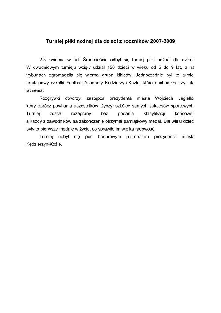 Turniej piłki nożnej dla dzieci z roczników 2007-2009 2-3 kwietnia w hali Śródmieście odbył się turniej piłki nożnej dla dzieci. W dwudniowym turnieju wzięły udział 150 dzieci w wieku od 5 do 9 lat, a na trybunach zgromadziła się wierna grupa kibiców. Jednocześnie był to turniej urodzinowy szkółki Football Academy Kędzierzyn-Koźle, która obchodziła trzy lata istnienia. Rozgrywki otworzył zastępca prezydenta miasta Wojciech Jagiełło, który oprócz powitania uczestników, życzył szkółce samych sukcesów sportowych. Turniej został rozegrany bez podania klasyfikacji końcowej, a każdy z zawodników na zakończenie otrzymał pamiątkowy medal. Dla wielu dzieci były to pierwsze medale w życiu, co sprawiło im wielka radowość. Turniej odbył Kędzierzyn-Koźle. się pod honorowym patronatem prezydenta miasta