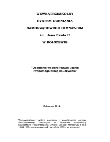 WEWNĄTRZSZKOLNY SYSTEM OCENIANIA SAMORZĄDOWEGO GIMNAZJUM im. Jana Pawła II W BOLSZEWIE "Ocenianie wspiera rozwój ucznia i wspomaga pracę nauczyciela" Bolszewo, 2014r. Wewnątrzszkolny system oceniania i klasyfikowania uczniów Samorządowego Gimnazjum w Bolszewie sporządzony na podstawie Rozporządzenia Ministra Edukacji Narodowej z dnia 19.04.1999r. obowiązujący od 1 września 1999 r. ze zmianami I ZASADY OCENIANIA I KLASYFIKOWANIA UCZNIÓW. 1. Ocenianie wewnątrzszkolne ma na celu: 1) informowanie ucznia o poziomie jego osiągnięć edukacyjnych i jego zachowaniu oraz o postępach w tym zakresie; 2) udzielenie uczniowi pomocy w samodzielnym planowaniu swojego rozwoju; 3) motywowanie ucznia do dalszych postępów w nauce i zachowaniu; 4) dostarczenie rodzicom (prawnym opiekunom) i nauczycielom informacji o postępach, trudnościach w nauce, zachowaniu oraz specjalnych uzdolnieniach ucznia; 5) umożliwienie nauczycielom doskonalenia organizacji i metod pracy dydaktycznowychowawczej. 2. Ocenianie wewnątrzszkolne obejmuje 1)formułowanie przez nauczycieli wymagań edukacyjnych niezbędnych do uzyskania poszczególnych śródrocznych i rocznych (semestralnych) ocen klasyfikacyjnych z obowiązkowych i dodatkowych zajęć edukacyjnych; 2)ustalanie kryteriów oceniania zachowania; 3)ocenianie bieżące i ustalanie śródrocznych ocen klasyfikacyjnych z obowiązkowych i dodatkowych zajęć edukacyjnych oraz śródrocznej oceny klasyfikacyjnej zachowania, według skali i w formach przyjętych w szkole; 4)przeprowadzenie egzaminów klasyfikacyjnych; 5)ustalanie rocznych (semestralnych) ocen klasyfikacyjnych z obowiązkowych i dodatkowych zajęć edukacyjnych oraz rocznej oceny klasyfikacyjnej zachowania, według skali i w formach przyjętych w szkole; 6)ustalanie warunków i trybu uzyskania wyższych niż przewidywane rocznych (semestralnych) ocen klasyfikacyjnych z obowiązkowych i dodatkowych zajęć edukacyjnych oraz rocznej oceny klasyfikacyjnej zachowania; 7)ustalanie warunków i sposobu przekazywania rodzicom (prawnym opiekunom) informacji o postępach i trudnościach ucznia w nauce 3. Klasyfikowanie uczniów odbywać się będzie dwa razy w ciągu roku szkolnego: 1) klasyfikacja śródroczna - po I semestrze /styczeń/ - ocena śródroczna ; 2) klasyfikacja roczna -po II semestrze /czerwiec/ - ocena roczna. Przed rocznym (semestralnym) klasyfikacyjnym zebraniem plenarnym rady pedagogicznej nauczyciele prowadzący poszczególne zajęcia edukacyjne oraz wychowawca klasy są obowiązani poinformować ucznia i jego rodziców (prawnych opiekunów) o przewidywanej dla niego rocznych (semestralnych) ocenach klasyfikacyjnych z zajęć edukacyjnych i przewidywanej rocznej ocenie klasyfikacyjnej zachowania, w terminie i formie określonych w statucie szkoły. 4. Oceny bieżące, śródroczne oraz roczne oceny klasyfikacyjne z zajęć edukacyjnych ustala się w stopniach według następującej skali: 1) stopień celujący - 6 2) stopień bardzo dobry - 5 3) stopień dobry - 4 4) stopień dostateczny - 3 5) stopień dopuszczający - 2 6) stopień niedostateczny - 1 Do ocen bieżących można dodawać znaki „+” lub „-” . 5. Zgodnie z § 4 pkt 1 nauczyciel na początku każdego roku szkolnego informuje uczniów oraz rodziców lub prawnych opiekunów o wymogach, zasadach oceniania oraz sposobach sprawdzania osiągnięć edukacyjnych uczniów. Nauczyciele poszczególnych przedmiotów są zobowiązani dołączyć do WSO sformułowane i ujednolicone wymagania edukacyjne niezbędne do uzyskania poszczególnych śródrocznych i rocznych ocen klasyfikacyjnych z zajęć edukacyjnych na poszczególne oceny, wynikające z realizowanego programu nauczania. 6. Zgodnie z § 4 pkt 2 wychowawca klasy na początku każdego roku szkolnego informuje uczniów oraz ich rodziców (prawnych opiekunów) o warunkach i sposobie oraz kryteriach oceniania zachowania, warunkach i trybie uzyskania wyższej niż przewidywana rocznej oceny klasyfikacyjnej zachowania oraz o skutkach ustalenia uczniowi nagannej rocznej oceny klasyfikacyjnej zachowania. 7. Zgodnie z § 5 pkt 1 i 2 oceny są jawne zarówno dla ucznia, jak i jego rodziców. 8. Nauczyciele wychowania fizycznego stosują punktowy system oceniania w ramach Przedmiotowego Systemu Oceniania ucznia. 9. Uczeń oceniany jest za: stopień opanowania wiedzy i umiejętności przedmiotowych prace pisemne wypowiedzi ustne, prowadzenie zeszytu przedmiotowego, ćwiczeń za zaangażowanie we własny rozwój dodatkowe formy aktywności /tzn. działania praktyczne/. 10. Przy ocenianiu pracy ucznia brana jest pod uwagę i oceniana forma jego aktywności, jaką jest przygotowanie do lekcji, tzn. posiadanie i staranne prowadzenie zeszytu przedmiotowego, posiadanie i wypełnianie zeszytu ćwiczeń, posiadanie podręcznika, odrabianie pracy domowej, znajomość aktualnie realizowanego materiału – brak lub niezrealizowanie któregokolwiek z powyższych elementów jest jednoznaczne z nieprzygotowaniem się do lekcji. Zaistniałe braki należy uzupełnić na następne zajęcia. 11. Brak pracy domowej, zeszytu, podręcznika lub zeszytu ćwiczeń skutkuje minusem. Minusy - symbole przyjmują postać oceny w trybie i sposobie ustalonym przez nauczyciela i zamieszczone w PSO 12. W ciągu jednego dnia nie może odbyć się więcej niż jedna praca klasowa lub sprawdzian, zapowiedziany i odnotowany w dzienniku z tygodniowym wyprzedzeniem. 13. Po uzgodnieniu z nauczycielem klasa ma możliwość przełożenia pracy klasowej a inny termin. W takim przypadku w ciągu dnia mogą odbyć się dwa sprawdziany lub prace klasowe. 14. Termin zwrotu ocenionych prac pisemnych nie może być dłuższy niż 10 dni roboczych. 15. Ocenione pisemne prace kontrolne uczeń i jego rodzice lub prawni opiekunowie otrzymują do wglądu na zasadach określonych przez nauczycieli. Na prośbę ucznia lub jego rodziców nauczyciel ustalający ocenę powinien ją uzasadnić na najbliższych konsultacjach od mome