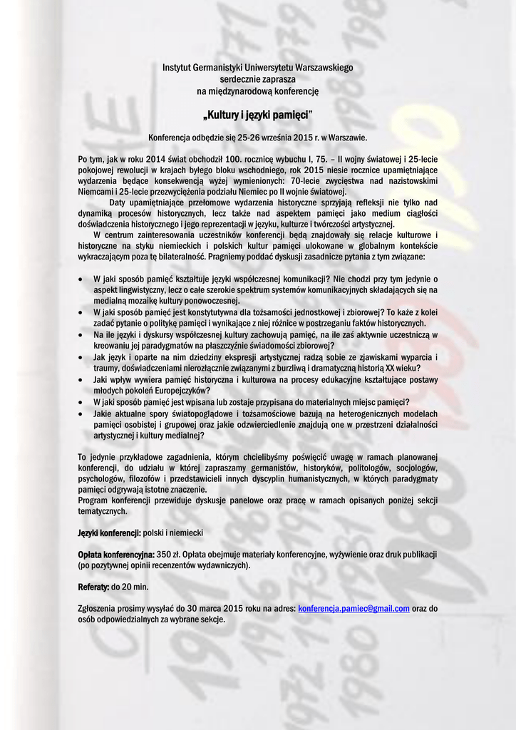 Instytut Germanistyki Uniwersytetu Warszawskiego serdecznie zaprasza na międzynarodową konferencję „Kultury i języki pamięci” Konferencja odbędzie się 25-26 września 2015 r. w Warszawie. Po tym, jak w roku 2014 świat obchodził 100. rocznicę wybuchu I, 75. – II wojny światowej i 25-lecie pokojowej rewolucji w krajach byłego bloku wschodniego, rok 2015 niesie rocznice upamiętniające wydarzenia będące konsekwencją wyżej wymienionych: 70-lecie zwycięstwa nad nazistowskimi Niemcami i 25-lecie przezwyciężenia podziału Niemiec po II wojnie światowej. Daty upamiętniające przełomowe wydarzenia historyczne sprzyjają refleksji nie tylko nad dynamiką procesów historycznych, lecz także nad aspektem pamięci jako medium ciągłości doświadczenia historycznego i jego reprezentacji w języku, kulturze i twórczości artystycznej. W centrum zainteresowania uczestników konferencji będą znajdowały się relacje kulturowe i historyczne na styku niemieckich i polskich kultur pamięci ulokowane w globalnym kontekście wykraczającym poza tę bilateralność. Pragniemy poddać dyskusji zasadnicze pytania z tym związane: W jaki sposób pamięć kształtuje języki współczesnej komunikacji? Nie chodzi przy tym jedynie o aspekt lingwistyczny, lecz o całe szerokie spektrum systemów komunikacyjnych składających się na medialną mozaikę kultury ponowoczesnej. W jaki sposób pamięć jest konstytutywna dla tożsamości jednostkowej i zbiorowej? To każe z kolei zadać pytanie o politykę pamięci i wynikające z niej różnice w postrzeganiu faktów historycznych. Na ile języki i dyskursy współczesnej kultury zachowują pamięć, na ile zaś aktywnie uczestniczą w kreowaniu jej paradygmatów na płaszczyźnie świadomości zbiorowej? Jak język i oparte na nim dziedziny ekspresji artystycznej radzą sobie ze zjawiskami wyparcia i traumy, doświadczeniami nierozłącznie związanymi z burzliwą i dramatyczną historią XX wieku? Jaki wpływ wywiera pamięć historyczna i kulturowa na procesy edukacyjne kształtujące postawy młodych pokoleń Europejczyków? W jaki sposób pamięć jest wpisana lub zostaje przypisana do materialnych miejsc pamięci? Jakie aktualne spory światopoglądowe i tożsamościowe bazują na heterogenicznych modelach pamięci osobistej i grupowej oraz jakie odzwierciedlenie znajdują one w przestrzeni działalności artystycznej i kultury medialnej? To jedynie przykładowe zagadnienia, którym chcielibyśmy poświęcić uwagę w ramach planowanej konferencji, do udziału w której zapraszamy germanistów, historyków, politologów, socjologów, psychologów, filozofów i przedstawicieli innych dyscyplin humanistycznych, w których paradygmaty pamięci odgrywają istotne znaczenie. Program konferencji przewiduje dyskusje panelowe oraz pracę w ramach opisanych poniżej sekcji tematycznych. Języki konferencji: polski i niemiecki Opłata konferencyjna: 350 zł. Opłata obejmuje materiały konferencyjne, wyżywienie oraz druk publikacji (po pozytywnej opinii recenzentów wydawniczych). Referaty: do 20 min. Zgłoszenia prosimy wysyłać do 30 marca 2015 roku na adres: [email protected] oraz do osób odpowiedzialnych za wybrane sekcje. 1. Relacje polsko-niemieckie w prywatnych narracjach i pamięci zbiorowej prof. dr hab. Tomasz Pszczółkowski dr hab. Anna Warakomska Stosunki polsko-niemieckie są przedmiotem zainteresowania naukowców i publicystów zajmujących się Polską i Niemcami przede wszystkim na podstawie źródeł naukowych i publicystycznych. Tymczasem relacje te są przedmiotem refleksji i narracji również tzw. zwykłych ludzi. Ich wypowiedzi dotyczące doświadczeń z drugim krajem i jego mieszkańcami różnią się nieraz od oficjalnych narracji, ale także od narracji literackich bądź artystycznych. [email protected] W ramach sekcji będą dyskutowane: 1. narracje pisemne i ustne, jak wspomnienia, np. dzienniki i pamiętniki świadków wydarzeń, korespondencje, wywiady radiowe i telewizyjne, 2. narracje filmowe, przede wszystkim dokumentalne. Do udziału w sekcji zapraszamy m.in. literaturoznawców zajmujących się literaturą faktu, historyków, politologów, socjologów, psychologów, a także autorów i redaktorów publikacji związanych z omawianą tematyką. 2. Pamięć polska i niemiecka czy polsko-niemiecka? dr Justyna Górny Polsko-niemieckie miejsca pamięci to koncepcja wypracowana w ramach projektu Centrum Badań Historycznych PAN w Berlinie, którego efektem jest obszerna publikacja zawierająca zarówno teksty teoretyczne, jak i opracowania konkretnych przykładów (por. Polsko-niemieckie miejsca pamięci, t.1-4. red. R. Traba, H.H. Hahn, współpraca K. Kończal, M. Górny). Panel jest zainspirowany koncepcją miejsca pamięci, które rozumiane jest nie tyle jako przestrzeń dająca się określić topograficznie, co jako fenomen historyczny kształtujący tożsamość danej grupy. Tak ujętym miejscem pamięci jest zarówno miasto Gdańsk, jak i (w polskiej pamięci zbiorowej) powieści Sienkiewicza. Celem panelu jest czytanie tekstów kultury w kontekście koncepcji miejsc pamięci i krytyczna refleksja nad jej przydatnością nie tylko dla historyków czy socjologów, ale także dla literaturoznawców, kulturoznawców, językoznawców czy metodyków nauczania języka niemieckiego. [email protected] Przykładowe zagadnienia: 1. miasta ważne w kontekście polsko-niemieckim, np. Zgorzelec/Görlitz, Berlin w literaturze polskiej, Łódź, 2. pisarze, ich twórczość i jej recepcja, np. Stanisław Przybyszewski, Alfred Döblin, Gerhart Hauptmann, Andrzej Szczypiorski, Tadeusz Różewicz, Siegfried Lenz, 3. regiony, np. Górny Śląsk/Oberschlesien, Wielkopolska, 4. migracja, mniejszości. 3. Szwajcarskie tożsamości? Przeszłość, teraźniejszość, przyszłość Gdy na przełomie lat osiemdziesiątych i dziewięćdziesiątych XX wieku świętowano w Europie przeobrażenia polityczne, społeczne oraz kul