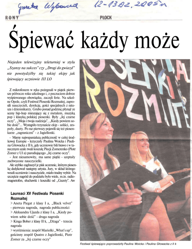 Śpiewać każdy może Niejeden telewizyjny teleturniej w stylu „Szansy na sukces" czy „Drogi do gwiazd" nie powstydziłby się takiej ekipy jak śpiewający uczniowie III LO Z mikrofonem w ręku pożegnali w piątek pierw sze półrocze roku szkolnego i, z poczuciem dobrze wyśpiewanego obowiązku, zaczęli ferie. Na szkol ne Opole, czyli Festiwal Piosenki Rozmaitej, zapro sili nauczycieli, dyrekcję, gości specjalnych z ratu sza i dziennikarzy. Grubo ponad godzinę płynął ze sceny hip-hop mieszający się z metalem, muzyką pop i klasyką polskiej piosenki. Były „Jej czarne oczy", „Moja i twoja nadzieja", „Kiedy powiem so bie dość"... Wystąpiło trzynaście ekip - soliści, zes poły, duety. Po raz pierwszy pojawili się też piosen karze „zagraniczni" - z Jagiellonki. - Mamy najwspanialszą publiczność w całej środ kowej Europie - krzyczały Paulina Woicka i Pauli na Głowacka z II k, gdy uczniowie bili brawo i w ta necznym szale rwali koszulę Piecji Zomerenko (Piotr Zomer z Ul a) parodiującego „Jej czarne oczy". - Jest niesamowity, ma same piątki - szeptały zachwycone nauczycielki. Ale szybko zagłuszył je pisk uczennic, którym piosen kę dedykował następny artysta. Jury, w skład którego weszli uczniowie i nauczyciele, miało trudny wybór. Na szczęście nagród do podziału było wiele, m.in. radio magnetofon, słuchawki i koszulki od „Gazety". Aw Laureaci XV Festiwalu Piosenki Rozmaitej > Aneta Piegat z klasy I a, „Black velvet" - pierwsza nagroda, nagroda publiczności > Aleksandra Ujazda z klasy I a, „Kiedy po wiem sobie dość" - druga nagroda > Kinga Bober z klasy II k, „Dżaga" - trzecia nagroda > wyróżnienia: zespół Mariolki „What's up", gościnny zespół Quatro z Jagiellonki, Piotr Zomer za „Jej czarne oczy" Festiwal śpiewająco poprowadziły Paulina Woicka i Paulina Głowacka z II k