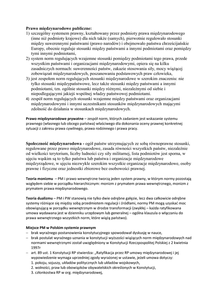 Prawo międzynarodowe publiczne: 1) szczególny systemem prawny, kształtowany przez podmioty prawa międzynarodowego (inne niż podmioty krajowe) dla nich także (samych), pierwotnie regulowało stosunki między suwerennymi państwami (prawo narodów) i obejmowało państwa chrześcijańskie Europy, obecnie reguluje stosunki między państwami a innymi podmiotami oraz pomiędzy tymi innymi podmiotami, 2) system norm regulujących wzajemne stosunki pomiędzy podmiotami tego prawa, przede wszystkim państwami i organizacjami międzynarodowymi, opiera się na kilku zasadniczych normach: suwerenności państw, zakazie stosowania siły, mocy wiążącej zobowiązań międzynarodowych, poszanowaniu podstawowych praw człowieka, 3) jest zespołem norm regulujących stosunki międzynarodowe w szerokim znaczeniu: nie tylko stosunki międzypaństwowe, lecz także stosunki między państwami a innymi podmiotami, tzn. ogólnie stosunki między różnymi, niezależnymi od siebie i niepodlegającymi jakiejś wspólnej władzy państwowej podmiotami. 4) zespół norm regulujących stosunki wzajemne między państwami oraz organizacjami międzynarodowymi i innymi uczestnikami stosunków międzynarodowych mającymi zdolność do działania w stosunkach międzynarodowych. Prawo międzynarodowe prywatne – zespół norm, których zadaniem jest wskazanie systemu prawnego (własnego lub obcego państwa) właściwego dla dokonania oceny prawnej konkretnej sytuacji z zakresu prawa cywilnego, prawa rodzinnego i prawa pracy. Społeczność międzynarodowa - ogół państw utrzymujących ze sobą równoprawne stosunki, regulowane przez prawo międzynarodowe, zasada równości wszystkich państw, niezależnie od wielkości terytorium, liczby ludności czy siły militarnej, lista podmiotów jest sporna, w ujęciu wąskim są to tylko państwa lub państwa i organizacje międzynarodowe międzyrządowe, w ujęciu niezwykle szerokim wszystkie organizacje międzynarodowe, osoby prawne i fizyczne oraz jednostki zbiorowe bez osobowości prawnej. Teoria monizmu – PM i prawo wewnętrzne tworzą jeden system prawny, w którym normy pozostają względem siebie w porządku hierarchicznym: monizm z prymatem prawa wewnętrznego, monizm z prymatem prawa międzynarodowego. Teoria dualizmu – PM i PW stanowią nie tylko dwie odrębne gałęzie, lecz dwa całkowicie odrębne systemy różniące się między sobą przedmiotem regulacji i źródłami, normy PM mogą uzyskać moc obowiązującą w porządku wewnętrznym w drodze transformacji (zwykłej – każda ratyfikowana umowa wydawana jest w dzienniku urzędowym lub generalnej – ogólna klauzula o włączaniu do prawa wewnętrznego wszystkich norm, które wiążą państwo). Miejsce PM w Polskim systemie prawnym brak wyraźnego postanowienia konstytucyjnego spowodował dyskusję w nauce, brak postulat wyraźnego uznania w konstytucji wyższości wiążących norm międzynarodowych nad normami wewnętrznymi został uwzględniony w Konstytucji Rzeczpospolitej Polskiej z 2 kwietnia 1997r art. 89 ust. 1 Konstytucji RP stwierdza: „Ratyfikacja przez RP umowy międzynarodowej i jej wypowiedzenie wymaga uprzedniej zgody wyrażonej w ustawie, jeżeli umowa dotyczy: 1. pokoju, sojuszy, układów politycznych lub układów wojskowych, 2. wolności, praw lub obowiązków obywatelskich określonych w Konstytucji, 3. członkostwa RP w org. międzynarodowej, 4. znacznego obciążenia państwa pod względem finansowym, 5. spraw uregulowanych w ustawie lub w których Konstytucja wymaga ustawy. art. 9 Konstytucji „Rzeczpospolita Polska przestrzega wiążącego ją prawa międzynarodowego” art. 90 Konstytucji: 1. Rzeczpospolita Polska może na podstawie umowy międzynarodowej przekazać organizacji międzynarodowej lub organowi międzynarodowemu kompetencje organów władzy państwowej w niektórych sprawach. 2. Ustawa, wyrażająca zgodę na ratyfikację umowy międzynarodowej, o której mowa w ust. 1, jest uchwalana przez Sejm większością 2/3 głosów w obecności co najmniej połowy ustawowej liczby posłów oraz przez Senat większością 2/3 głosów w obecności co najmniej połowy ustawowej liczby senatorów. 3. Wyrażenie zgody na ratyfikację takiej umowy może być uchwalone w referendum ogólnokrajowym zgodnie z przepisem art. 125. 4. Uchwałę w sprawie wyboru trybu wyrażenia zgody na ratyfikację podejmuje Sejm bezwzględną większością głosów w obecności co najmniej połowy ustawowej liczby posłów. art. 91 Konstytucji 1. Ratyfikowana umowa międzynarodowa, po jej ogłoszeniu w Dzienniku Ustaw Rzeczypospolitej Polskiej, stanowi część krajowego porządku prawnego i jest bezpośrednio stosowana, chyba że jej stosowanie jest uzależnione od wydania ustawy. 2. Umowa międzynarodowa ratyfikowana za uprzednią zgodą wyrażoną w ustawie ma pierwszeństwo przed ustawą, jeżeli ustawy tej nie da się pogodzić z umową. 3. Jeżeli wynika to z ratyfikowanej przez Rzeczpospolitą Polską umowy konstytuującej organizację międzynarodową, prawo przez nią stanowione jest stosowane bezpośrednio, mając pierwszeństwo w przypadku kolizji z ustawami. Źródła prawa międzynarodowego –obejmują źródła materialne, formalne i poznawcze. Źródła materialne - wszystkie przyczyny wpływające na kształtowanie się prawa międzynarodowego oraz nadające mu moc obowiązującą (prawo naturalne - nakazy rozumu, pozytywiści - wola państw) Źródła formalne - są wyrazem procesu, który doprowadził do powstania normy prawnej: - umowa międzynarodowa - źródło samodzielne, a jej moc prawna wiąże się z zasadą pacta sunt servanda - zwyczaj międzynarodowy - zgodna praktyka państw tworząca prawo - ogólne zasady prawa, orzecznictwo sądów międzynarodowych, doktryny prawne oraz uchwały organów organizacji międzynarodowych, Ustawodawstwo państw, Akty jednostronne, Notyfikacja, Uznanie, Protest, Zrzeczenie się, Ogólne zasady prawa międzynarodowego źró