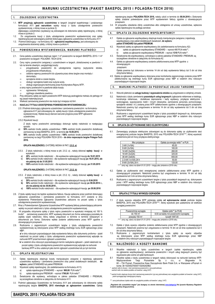 WA R UN KI U CZ E ST NI CT W A ( P AK I ET BA K E POL 20 1 5 i P OL AG RA- T E C H 2 016 ) 1. ZGŁOSZENIE UCZESTNICTWA 1.1. MTP przyjmują zgłoszenie uczestnictwa w targach (oryginał wypełnionego i podpisanego formularza A1/1 pod warunkiem wpłaty kaucji z tytułu udostępnienie powierzchni wystawienniczej, o której mowa w punkcie 2). Zgłaszający uczestnictwo (wystawcy) są zobowiązani do dokonania opłaty rejestracyjnej, o której mowa w punkcie 3. 1.2. Do uregulowania kaucji z tytułu udostępnienia powierzchni wystawienniczej oraz opłaty rejestracyjnej jest zobowiązany podmiot dokonujący zgłoszenia uczestnictwa na formu;arzu A1/1 1.3. Podmiot dokonujący – na formularzu A2 – zgłoszenia współwystawcy, jest zobowiązany do uregulowania stosownej opłaty, o której mowa w punkcie 4. rejestarcyjną targów POLAGRA-TECH 2016, należy uiścić w terminie do 08.04.2016 r. Dokonanie opłaty zostanie potwierdzone przez MTP wystawieniem faktury zgodnie z obowiazujacymi przepisami. 3.4. W przypadku odwołania oferty uczestnictwa albo odstąpienia od umowy uczestnictwa, wpłacona opłata rejestracyjna nie podlega zwrotowi. 4. OPŁATA ZA ZGŁOSZENIE WSPÓŁWYSTAWCY 4.1 4.2. 2. POWIERZCHNIA WYSTAWIENNICZA, WARUNKI PŁATNOŚCI 2.1. Cena pakietu uczestnictwa obejmuje najem 1 m² powierzchni na targach BAKEPOL 2015 i 1 m² powierzchni na targach POLAGRA -TECH 2016. 4.3. 2.2. Ceny najmu powierzchni związanej z uczestnictwem w targach, zlokalizowanej w pawilonie i / lub na terenie otwartym, uwzględniają koszty: • przygotowania powierzchni do udostępnienia najemcy (wytyczenie stoiska, przygotowanie infrastruktury), • oddania najemcy powierzchni do używania przez okres targów oraz montażu i demontażu; • sprzątania stoisk w czasie targów, • obsługi i sprzątania toalet oraz zużycia wody, • obsługi organizacyjno-technicznej przez Koordynatora Rejonu MTP, a ceny najmu powierzchni w pawilonie także koszty: • ogrzewania / klimatyzacji, • ogólnego oświetlenia pawilonu. Przy obliczaniu opłaty za najem powierzchni MTP dokonują zaokrąglenia metrażu do pełnego m2 wg zasad matematycznych. Wielkość zamówionej powierzchni nie może być mniejsza niż 6m2. 4.4. 2.3. 2.4. 2.5. 4.5. 5. 5.1. Warunki płatności za usługę budowy i wyposażenia stoiska są uregulowane w odrębnej umowie. Należności z tytułu zamówienia pozostałych usług targowych (ogłoszenie reklamowe w katalogu, konstrukcja reklamowa, dodatkowe zaproszenia i karty wystawcy, przyłącza elektryczne i wodociągowe, wypożyczenie mebli i innych rekwizytów, zamówienie personelu pomocniczego, sprzątanie stoiska i in.) zostaną przez MTP zafakturowane zgodnie z obowiązującymi przepisami. Należności powinny być uregulowane w terminie 14 dni od daty wystawienia lub 5 dni od dnia otrzymania faktury. 5.3. Rozliczenia z zagranicznymi uczestnikami targów z tytułu pozostałych targowych są dokonywane przez MTP według średniego kursu EUR ogłoszonego przez NBP w ostatnim dniu roboczym poprzedzającym rozpoczęcie targów. 2.5.2. Wysokość kaucji: Z tytułu najmu powierzchni zamawiający dokonuje wpłaty należności w następujący sposób: 50% wartości brutto pakietu uczestnictwa i 100% wartości brutto powierzchni dodatkowej zamówionej na targi BAKEPOL 2015 - w terminie do 10.09.2015. 50% wartości brutto pakietu uczestnictwa i 100% wartości brutto powierzchni dodatkowej zamówionej na targi POLAGRA-TECH 2016 – do dnia rozpoczęcia targów Polagra-Tech 2016. a) b) 6. 6.1. a) b) c) Z tytułu należności, o której mowa w pkt. 2.5.2. a) , należy dokonać wpłaty kaucji w wysokości: 20% wartości brutto należności - dla wystawców wpłacających kaucję do 16.01.2015 50% wartości brutto należności - dla wystawców wpłacających kaucję po 16.01.2015, ale nie później niż do 31.05.2015 100% wartości brutto należności - dla wystawców wpłacających kaucję po 31.05.2015 OPŁATA NALEZNOŚCI, O KTÓREJ MOWA W PKT. 2.5.2. b) 2.5.3. Z tytułu należności, o której mowa w pkt. 2.5.2. b) , należy dokonać wpłaty kaucji w wysokości: a) 20% wartości brutto należności – dla wystawców wpłacajacych kaucję do 8.04.2016 b) 50% wartości brutto należności - dla wystawców wpłacających kaucję po 08.04.2014 r., ale nie później niż do 30.06.2016 , c) 100% wartości brutto należności - dla wystawców wpłacających kaucję po 30.06.2016 2.6. Z tytułu wpłaty kaucji nie będzie wystawiona faktura. Kaucja wpłacona przez podmiot dokonujący zgłoszenia uczestnictwa i zamówienia powierzchni na formularzu A1/1 zostanie w dniu wystawienia Potwierdzenia Zgłoszenia Uczestnictwa zaliczona na poczet opłaty z tytułu udostępnienia powierzchni wystawienniczej. 2.7. Wraz z Potwierdzeniem Zgłoszenia Uczestnictwa MTP wystawią fakturę potwierdzającą zaliczenie wpłaty na poczet należności z tytułu udostępnienia powierzchni wystawienniczej. 2.8. W przypadku otrzymania opłaty z tytułu najmu powierzchni w wysokości mniejszej niż 100 % brutto* zamówionej powierzchni, MTP wystawią dokument pro forma wskazującą pozostalą do zapłaty część należności, którą należy uregulować w terminie w terminie wskazanym w dokumencie pro forma. Dokonana wpłata zostanie zafakturowana przez MTP zgodnie z obowiązującymi przepisami. 2.9. Rozliczenia z zagranicznymi uczestnikami targów z tytułu udostępnienia powierzchni wystawienniczej są dokonywane przez MTP według średniego kursu EUR ogłoszonego przez NBP: a/ w dniu roboczym poprzedzającym datę wystawienia faktury albo dokumentu proforma – jeżeli należność na poczet opłaty z tytułu udostępnienia powierzchni wystawienniczej wpłynęła na rachunek MTP przed terminem zgłoszeń uczestnictwa b/ w ostatnim dniu roboczym poprzedzającym termin nadsyłania zgłoszeń – jeżeli należność na poczet opłaty z tytułu udostępnienia powierzchni wystawienniczej wpłynęła na rachunek bankowy MTP w dniu ustalonym j