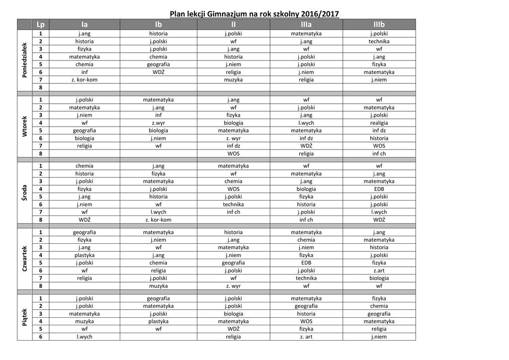 Plan lekcji Gimnazjum na rok szkolny 2016/2017 Lp Ia Ib II IIIa IIIb