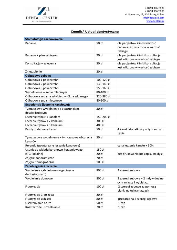 + 48 94 306 78 80 + 48 94 306 78 88 ul. Pomorska, 1B, Kołobrzeg, Polska [email protected] www.dentaz3.pl Cennik/ Usługi dentystyczne Stomatologia zachowawcza: Badanie 50 zł Badanie + plan zabiegów 90 zł Konsultacja + zalecenia 50 zł Znieczulenie Odbudowa zębów: Odbudowa 1 powierzchni Odbudowa 2 powierzchni Odbudowa 3 powierzchni Wypełnienie w zebie mlecznym Odbudowa zęba na sztyfcie z włókna szklanego Odbudowa zęba mlecznego Endodoncja (leczenie kanałowe): Tymczasowe wypełnienie z opatrunkiem dewitalizującym Leczenie zęba z 1 kanałem Leczenie zębów z 2 kanałami Leczenie zębów z 3 kanałami Każdy dodatkowy kanał 20 zł Tymczasowe wypełnienie + tymczasowa obturacja kanałów Re-endo (powtarzane leczenie kanałowe) Usunięcie wkładu koronowo-korzeniowego RTG (lokalne) Zdjęcie panoramiczne Zdjęcie tomograficzne Zapobieganie i leczenie: Wybielanie gabinetowe (w gabinecie dentystycznym) Wybielanie domowe 50 zł Fluoryzacja 100 zł Fluoryzacja 1-go zęba Fluoryzacja u dzieci Uszczelnianie bruzd Rozszerzone uszczelnianie 20 zł 80 zł 50 zł 70 zł dla pacjentów kliniki wartość badania jest wliczona w wartość zabiegu dla pacjentów kliniki konsultacja jest wliczona w wartość zabiegu dla pacjentów kliniki konsultacja jest wliczona w wartość zabiegu 100-120 zł 130-140 zł 150-160 zł 80-100 zł 320-380 zł 80-100 zł 80 zł 150-200 zł 300 zł 400 zł 50 zł 4 kanał i dodatkowy w tym samym zębie cena leczenia kanału + 50% 150 zł 20 zł 70 zł 100 zł bez drukowania lub zapisu na dysk 800 zł 2 szeregi zębowe 800 zł 2 szeregi zębowe + 2 indywidualne ochraniacze i wybielacz 2 szeregi zębowe za pomocą pianki na ochraniaczach preparat na 2 szeregi zębowe 1 ząb 1 ząb + 48 94 306 78 80 + 48 94 306 78 88 ul. Pomorska, 1B, Kołobrzeg, Polska [email protected] www.dentaz3.pl Periodontologia: Usuwanie kamienia nad- i poddziąsłowego (scaling) Usuwanie nalotu za pomocą Air Flow Usuwanie kamienia + Air Flow Kiretaż zamknięty Kiretaż otwarty Chirurgia stomatologiczna: Usuwanie zęba stałego 100-150 zł 100-150 zł 150-200 zł 150 zł 300 zł 80-150 zł Usuwanie zęba mlecznego Usuwanie 8 zęba Usuwanie przemieszczonego, retenowanego 8 zęba Plastyka połączenia ustno-zatokowego Resekcja wierzchołka korzenia Resekcja wierzchołka korzenia (zęby trzonowe, przedtrzonowe) Hemisekcja Wydłużenie korony klinicznej zęba Nakładanie szwów Opatrunek chirurgiczny Implanty: Implant z koroną 70 zł 180-250 zł 250-450 zł Augmentacja wyrostka zębodołowego Sinus lift Protetyka: Diagnostyka zgryzu z łukiem twarzowym Korona - ceramiczna Brzeg pełnoceramiczny w koronie Korona ceramiczna lub na podstawie tlenku cyrkonu (CAD/CAM) Licówka ceramiczna Korona tymczasowa Korona tymczasowa Inlay, onlay, overlay ceramiczne (wkłady koronowe) Inlay, onlay, overlay kompozytowe (wkłady koronowe) Proteza klamrowa na metalu Zdejmowana proteza akrylowa Proteza mocowana na zaczepach belkowych Proteza na koronach teleskopowych Wkład koronowo-korzeniowy (chrom-kobalt) Naprawa protezy Wstawianie sztucznego zęba do protezy 1500-2500 zł 2500-4000 zł w zależności od zakresu zabiegu ćwierć bez ceny biomateriału (cena nie obejmuje znieczulenia, szwów, opatrunku) 200-250 zł 200 zł 250-350 zł 400 zł 150 zł 50 zł 50 zł 3500-5000 zł 500 zł 700 zł 80 zł 1400-1600 zł 1250 zł 50 zł 100 zł 900 zł w zależności od systemu i rodzaju korony chrom-kobalt (w gabinecie) (laboratorium) 550 zł 1100-1200 zł 600-800 zł cena szacowana w gabinecie cena szacowana w gabinecie 200-250 zł 100 zł 60 zł 1 szt