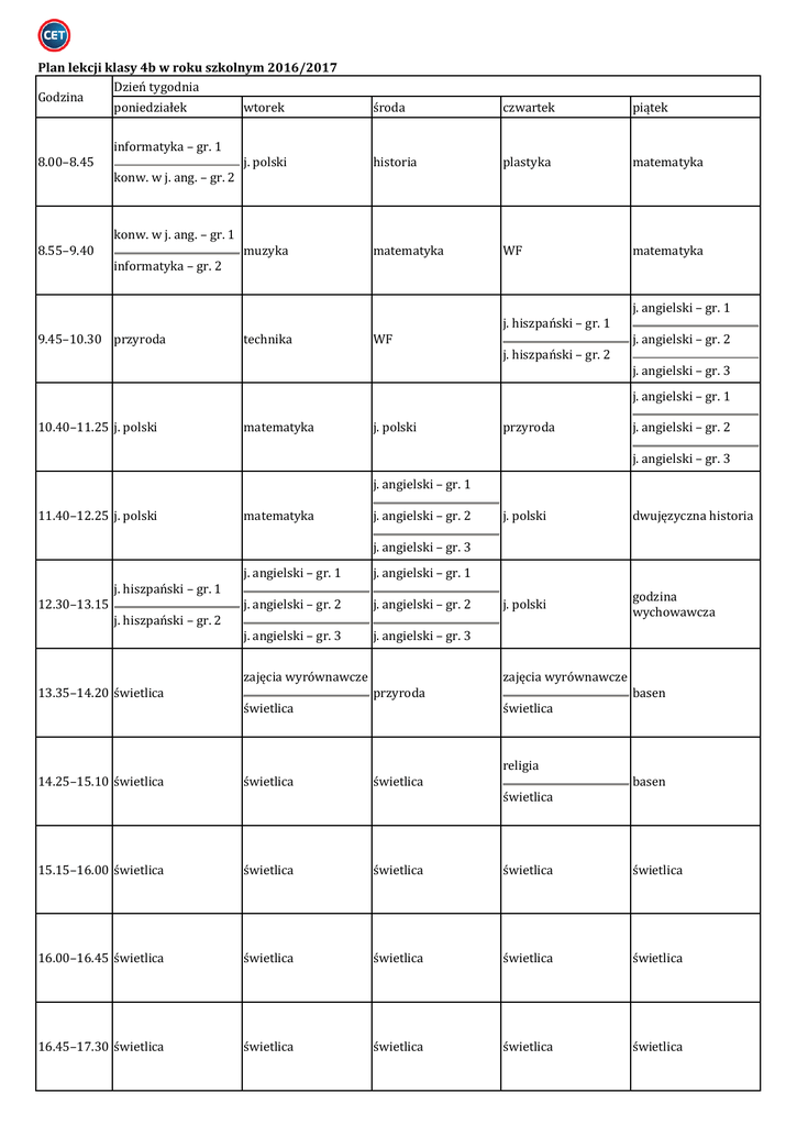 Plan lekcji klasy 4b w roku szkolnym 2016/2017 Dzień tygodnia Godzina poniedziałek wtorek środa czwartek piątek j. polski historia plastyka matematyka muzyka matematyka WF matematyka informatyka – gr. 1 8.00–8.45 konw. w j. ang. – gr. 2 konw. w j. ang. – gr. 1 8.55–9.40 informatyka – gr. 2 j. hiszpański – gr. 1 9.45–10.30 przyroda technika WF j. angielski – gr. 1 j. angielski – gr. 2 j. hiszpański – gr. 2 j. angielski – gr. 3 j. angielski – gr. 1 10.40–11.25 j. polski matematyka j. polski przyroda j. angielski – gr. 2 j. angielski – gr. 3 j. angielski – gr. 1 11.40–12.25 j. polski matematyka j. angielski – gr. 2 j. polski dwujęzyczna historia j. polski godzina wychowawcza j. angielski – gr. 3 j. angielski – gr. 1 j. angielski – gr. 1 j. angielski – gr. 2 j. angielski – gr. 2 j. angielski – gr. 3 j. angielski – gr. 3 j. hiszpański – gr. 1 12.30–13.15 j. hiszpański – gr. 2 zajęcia wyrównawcze 13.35–14.20 świetlica zajęcia wyrównawcze przyroda świetlica 14.25–15.10 świetlica świetlica basen świetlica świetlica religia basen świetlica 15.15–16.00 świetlica świetlica świetlica świetlica świetlica 16.00–16.45 świetlica świetlica świetlica świetlica świetlica 16.45–17.30 świetlica świetlica świetlica świetlica świetlica