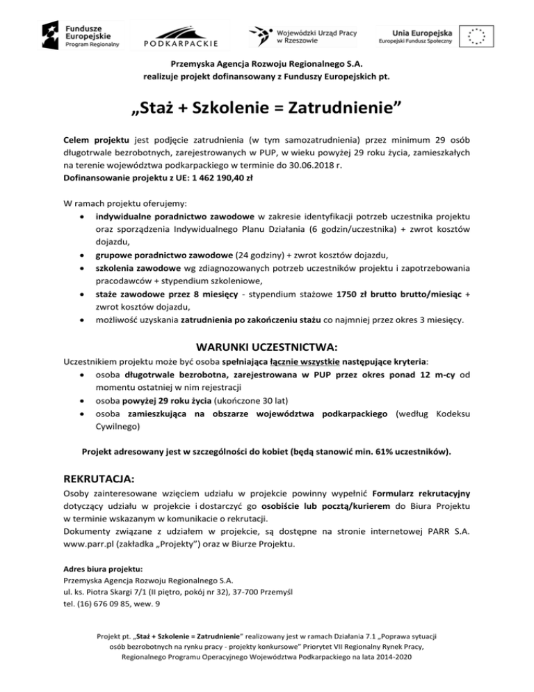 Przemyska Agencja Rozwoju Regionalnego S.A. realizuje projekt dofinansowany z Funduszy Europejskich pt. „Staż + Szkolenie = Zatrudnienie” Celem projektu jest podjęcie zatrudnienia (w tym samozatrudnienia) przez minimum 29 osób długotrwale bezrobotnych, zarejestrowanych w PUP, w wieku powyżej 29 roku życia, zamieszkałych na terenie województwa podkarpackiego w terminie do 30.06.2018 r. Dofinansowanie projektu z UE: 1 462 190,40 zł W ramach projektu oferujemy:  indywidualne poradnictwo zawodowe w zakresie identyfikacji potrzeb uczestnika projektu oraz sporządzenia Indywidualnego Planu Działania (6 godzin/uczestnika) + zwrot kosztów dojazdu,  grupowe poradnictwo zawodowe (24 godziny) + zwrot kosztów dojazdu,  szkolenia zawodowe wg zdiagnozowanych potrzeb uczestników projektu i zapotrzebowania pracodawców + stypendium szkoleniowe,  staże zawodowe przez 8 miesięcy - stypendium stażowe 1750 zł brutto brutto/miesiąc + zwrot kosztów dojazdu,  możliwość uzyskania zatrudnienia po zakończeniu stażu co najmniej przez okres 3 miesięcy. WARUNKI UCZESTNICTWA: Uczestnikiem projektu może być osoba spełniająca łącznie wszystkie następujące kryteria:  osoba długotrwale bezrobotna, zarejestrowana w PUP przez okres ponad 12 m-cy od momentu ostatniej w nim rejestracji  osoba powyżej 29 roku życia (ukończone 30 lat)  osoba zamieszkująca na obszarze województwa podkarpackiego (według Kodeksu Cywilnego) Projekt adresowany jest w szczególności do kobiet (będą stanowić min. 61% uczestników). REKRUTACJA: Osoby zainteresowane wzięciem udziału w projekcie powinny wypełnić Formularz rekrutacyjny dotyczący udziału w projekcie i dostarczyć go osobiście lub pocztą/kurierem do Biura Projektu w terminie wskazanym w komunikacie o rekrutacji. Dokumenty związane z udziałem w projekcie, są dostępne na stronie internetowej PARR S.A. www.parr.pl (zakładka „Projekty”) oraz w Biurze Projektu. Adres biura projektu: Przemyska Agencja Rozwoju Regionalnego S.A. ul. ks. Piotra Skargi 7/1 (II piętro, pokój nr 32), 37-700 Przemyśl tel. (16) 676 09 85, wew. 9 Projekt pt. „Staż + Szkolenie = Zatrudnienie” realizowany jest w ramach Działania 7.1 „Poprawa sytuacji osób bezrobotnych na rynku pracy - projekty konkursowe” Priorytet VII Regionalny Rynek Pracy, Regionalnego Programu Operacyjnego Województwa Podkarpackiego na lata 2014-2020