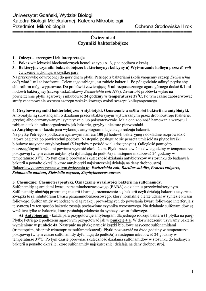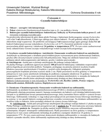 Uniwersytet Gdański, Wydział Biologii Katedra Biologii Molekularnej, Katedra Mikrobiologii Przedmiot: Mikrobiologia Ochrona Środowiska II rok ================================================================= Ćwiczenie 4 Czynniki bakteriobójcze 1. Odczyt - szeregów i ich interpretacja 2. Pokaz właściwości biochemicznych hemoliza typu na podłożu z krwią. 3. Bakteryjne czynniki bakteriobójcze: bakteriocyny: kolicyny a) Wytwarzanie kolicyn przez E. coli ćwiczenie wykonują wszystkie pary Na przykrywkę odwróconej do góry dnem płytki Petriego z bakteriami (kolicynogenny szczep Escherichia coli) wlać 1 ml chloroformu. Celem tego zabiegu jest zabicie bakterii.. Po pół godzinie odkryć płytkę aby chloroform mógł wyparować. Do probówki zawierającej 3 ml rozpuszczonego agaru górnego dodać 0.1 ml hodowli bakteryjnej (szczep wskaźnikowy Escherichia coli A77). Zawartość probówki wylać na powierzchnię płytki agarowej i inkubować 24 godziny w temperaturze 37oC. Po tym czasie zaobserwować strefy zahamowania wzrostu szczepu wskaźnikowego wokół szczepu kolicynogennego. 4. Grzybowe czynniki bakteriobójcze: Antybiotyki. Oznaczanie wrażliwości bakterii na antybiotyki. Antybiotyki są substancjami o działaniu przeciwbakteryjnym wytwarzanymi przez drobnoustroje (bakterie, grzyby) albo otrzymywanymi syntetycznie lub półsyntetycznie. Mają one zdolność hamowania wzrostu i zabijania takich mikroorganizmów jak bakterie, grzyby i niektóre pierwotniaki. a) Antybiogram - każda para wykonuje antybiogram dla jednego rodzaju bakterii. Na płytkę Petriego z podłożem agarowym nanieść 100 µl hodowli bakteryjnej i dokładnie rozprowadzić jałową bagietką po powierzchni podłoża. Następnie, posługując się pensetą umieścić na płytce krążki bibułowe nasycone antybiotykami (5 krążków z pośród wielu dostępnych). Odległość pomiędzy poszczególnymi krążkami powinna wynosić około 2 cm. Płytki pozostawić na dwie godziny w temperaturze pokojowej (w tym czasie antybiotyki dyfundują do podłoża) a następnie inkubować 24 godziny w temperaturze 37oC. Po tym czasie porównać skuteczność działania antybiotyków w stosunku do badanych bakterii a ponadto określić,które antybiotyki najskuteczniej działają na dany drobnoustrój. Bakterie wykorzystywane w tym ćwiczeniu to: Escherichia coli, Bacillus subtilis, Proteus vulgaris, Salmonella anatum, Klebsiella oxytoca, Staphylococcus aureus. 5. Chemiczne: Chemioterapeutyki. Oznaczanie wrażliwości bakterii na sulfonamidy. Sulfonamidy są amidami kwasu paraaminobenzoesowego (PABA) o działaniu przeciwbakteryjnym. Sulfonamidy obniżają przemianę materii i hamują rozmnażanie się bakterii czyli działają bakteriostatycznie. Związki te są inhibitorami kwasu paraaminobenzoesowego, który normalnie bierze udział w syntezie kwasu foliowego. Sulfonamidy wchodząc w ciąg reakcji prowadzących do powstania kwasu foliowego interferują z tą syntezą i w ten sposób bakterie zostają pozbawione czynnika wzrostowego. Na działanie sulfonamidów są wrażliwe tylko te bakterie, które posiadają zdolność do syntezy kwasu foliowego. A) Antybiogram - każda para przygotowuje antybiogram dla jednego rodzaju bakterii (1 płytka na parę). Płytkę Petriego z podłożem agarowym przygotować jak w punkcie 4 a. W doświadczeniu używamy bakterie wymienione w punkcie 4a. Następnie na płytkę nanieść krążki bibułowe nasycone sulfonamidami (trimetoprim, biseptol: trimetoprim+sulfametaksozol). Płytki pozostawić na dwie godziny w temperaturze pokojowej (w tym czasie sulfonamidy dyfundują do podłoża) a następnie inkubować 24 godziny w temperaturze 37oC. Po tym czasie porównać skuteczność działania sulfonamidów w stosunku do badanych bakterii a ponadto określić, które sulfonamidy najskuteczniej działają na dany drobnoustrój. 1 6. Oznaczanie wrażliwości bakterii na fitoncydy - 1 płytka na parę Fitoncydy są substancjami o działaniu bakterio-, grzybo- i pierwotniakobójczym. Wytwarzane są przez rośliny wyższe. Ze względu na działanie toksyczne (w wysokim stężeniu) na komórki ssaków nie znalazły zastosowania w lecznictwie. Fitoncydy w dużych ilościach występują w cebuli, czosnku, chrzanie i koprze. Płytkę Petriego z podłożem agarowym przygotować jak w punkcie 4a (w ćwiczeniu wykorzystujemy bakterie wymienione w punkcie 4a). W środku płytki wyciąć krążek agaru, w powstałej w ten sposób studzience umieścić posiekany czosnek lub cebulę. Płytki inkubować 24 godziny w temperaturze 37oC. Określić wrażliwość badanych bakterii na fitoncydy. 7. Omówienie skuteczności działania wybranych środków dezynfekcyjnych. 8. Przygotowanie jałowo płytek z pożywką LA. 2