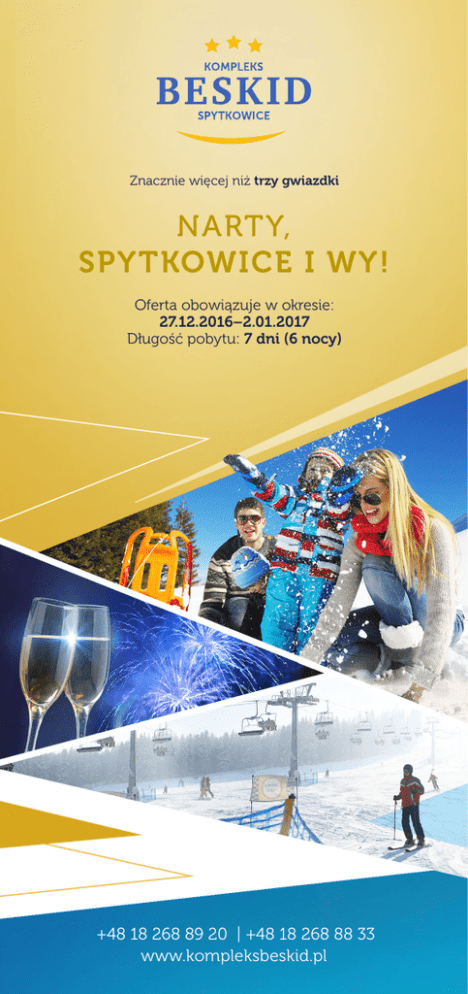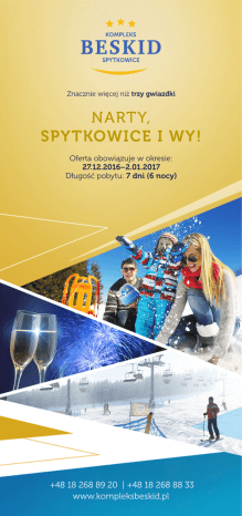 Znacznie więcej niż trzy gwiazdki NARTY, SPYTKOWICE I WY! Oferta obowiązuje w okresie: 27.12.2016–2.01.2017 Długość pobytu: 7 dni (6 nocy) +48 18 268 89 20 | +48 18 268 88 33 www.kompleksbeskid.pl NARTY, SPYTKOWICE I WY! CENA PAKIETU: Osoba dorosła: Pokój comfort z widokiem na stok – 2699 zł. Pokój standard – 1990 zł. Pokój economy – 1790 zł. Dziecko: Dostawka do pokoju dla dziecka (w wieku od 3 do 12 lat) – 1490 zł. Dziecko do lat 3, będące pod opieką 2 osób dorosłych - GRATIS! PAKIET OBEJMUJE: Noclegi w przytulnych pokojach. Wyśmienite śniadania i obiadokolacje w formie szwedzkiego stołu. Skipass na cały okres pobytu. Sylwestrowy karnet narciarski do godziny 1:00. Przechowywanie sprzętu narciarskiego – nart, desek snowboardowych i butów. Nieograniczony dostęp do basenu, jacuzzi i siłowni. Wieczorne seanse w saunie od 17:00 do 22:00. Bezpłatny parking. Bezprzewodowy internet na terenie całego ośrodka. ATRAKCJE W CENIE PAKIETU: Wielki bal sylwestrowy z wybornym jedzeniem, napojami i alkoholami oraz zabawą przy najlepszych tanecznych hitach. Bajkowy Sylwester dla dzieci – pełne atrakcji przyjęcie noworoczne dla najmłodszych. W programie m.in.: uroczysta kolacja, konkurs na Króla i Królową balu oraz dyskoteka połączona z konkursami tanecznymi. Niewykorzystanie któregokolwiek elementu wchodzącego w skład pakietu nie wpływa na zmianę jego wartości. Istnieje możliwość rozszerzenia pakietu o dodatkowe atrakcje.