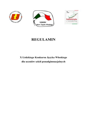 REGULAMIN X Łódzkiego Konkursu Języka Włoskiego dla uczniów szkół ponadgimnazjalnych I. ORGANIZATOR Organizatorem Konkursu jest Zakład Italianistyki Katedry Filologii Romańskiej Uniwersytetu Łódzkiego. Patronat honorowy nad Konkursem obejmuje Włoski Instytut Kultury w Warszawie i w Krakowie. II. ADRESACI KONKURSU Konkurs kierowany jest do uczniów szkół ponadgimnazjalnych z terenu całej Polski. Nie mogą w nim wziąć udziału: laureaci poprzednich edycji Konkursu, uczniowie, których choćby jeden rodzic jest Włochem, osoby, które mieszkały we Włoszech co najmniej 6 miesięcy. Organizator zastrzega sobie prawo do wykluczenia z Konkursu uczestnika, który podał niezgodne z prawdą dane lub w inny sposób naruszył postanowienia niniejszego Regulaminu. III. CELE KONKURSU Niniejszy Konkurs ma na celu: Zainteresowanie uczniów językiem włoskim. Motywowanie nauczycieli do popularyzacji języka włoskiego i kultury włoskiej w Polsce. Przybliżenie uczniom kultury Włoch. Rozpowszechnianie języka i kultury Włoch w Polsce. IV. PRZEDMIOT OCENY KONKURSOWEJ Komisja będzie oceniać zakres wiedzy i umiejętności według standardowego programu nauczania języka włoskiego w klasach I – III szkoły ponadgimnazjalnej. V. ZALECANA LITERATURA Zaleca się treści zawarte w ogólnie dostępnych podręcznikach dla szkół ponadgimnazjalnych oraz materiały uzupełniające do nauki języka włoskiego, np.: AA.VV, L’italiano? Sì, grazie, Eli Galasso S., Trama G., Italiano in cinque minuti - Alma Edizioni Marin T., Il Nuovo Progetto italiano 1, 2, Edilingua Martina G., Pagliarulo A., In Italia, Chancerel Mezzardi Marco, Rete! 1,2, Guerra Edizioni Nocchi Susanna, Grammatica pratica della lingua italiana, Alma Edizioni Trifone Maurizio, Affresco italiano 1,2, Le Monnier VI. STRUKTURA I PRZEBIEG KONKURSU Konkurs obejmuje trzy etapy: etap I (poziom A1+ - A2 wgESOKJ) etap II (poziom A2+ - B1+) etap III (poziom B1+) Etap I składa się wyłącznie z części pisemnej, obejmującej: – rozumienie tekstu pisanego, – test gramatyczno – leksykalny, – krótką pisemną wypowiedź na zadany temat. Etap II składa się również wyłącznie z części pisemnej, obejmującej: – rozumienie tekstu nagranego/czytanego, – test gramatyczno – leksykalny. Etap III składa się wyłącznie z części ustnej –tj. rozmowy z członkami Komisji Konkursowej na wylosowany temat. Możliwe zakresy tematyczne to: rodzina człowiek szkoła praca wakacje/podróże zdrowie czas wolny sport życie codzienne moda jedzenie życie w mieście/ życie na wsi zwyczaje świąteczne Kryteria ogólne oceniania wypowiedzi ustnej w III etapie Konkursu: 1 zrozumienie polecenia i tematu 2 p. 2 umiejętność przedstawienia tematu 4 p. 3 poprawność reagowania w sytuacjach komunikacyjnych 3 p. 4 poprawność fonologiczna 3 p. 5 poprawność morfosyntaktyczna 3 p. 6 różnorodność leksyki 3 p. 7 oryginalność wypowiedzi 2 p. RAZEM 20p. Czas trwania poszczególnych etapów: czas trwania etapu I i II nie przekroczy 90 minut, czas trwania etapu III – przygotowanie do wypowiedzi na wylosowany temat do 5 minut, wypowiedź do 10 minut. Uwaga! Polecenia w testach etapu I, II są podane wyłącznie w języku polskim. Polecenie w części ustnej podane jest wyłącznie w języku włoskim. Etap I Konkursu Za przeprowadzenie tego etapu i sprawdzenie testów odpowiedzialni są nauczyciele powołani do Szkolnej Komisji Konkursowej przez dyrektora szkoły. Ta część eliminacji przeprowadzana jest na terenie placówki, której uczniowie biorą udział w Konkursie. Sprawdzone prace zostają przekazane organizatorom Konkursu w terminie do 10 dni roboczych od dnia przeprowadzenia I etapu Konkursu. Po zebraniu wyników wszystkich testów, organizatorzy tworzą listę osób, które przechodzą do II etapu. Może być to maksymalnie 50% uczestników z najlepszymi wynikami z testu etapu I, jednak nie więcej niż 100 osób. Niedotrzymanie wyznaczonych w regulaminie terminów jest równoznaczne z rezygnacją z udziału w Konkursie. Uwaga! Komisja Konkursowa nie będzie brała pod uwagę testów, które z różnych powodów nie zostały sprawdzone zgodnie z postanowieniami niniejszego regulaminu oraz z (załączonymi do zestawów testowych) wytycznymi dla nauczycieli, odpowiedzialnych za przeprowadzenie I etapu Konkursu w poszczególnych szkołach. Etap II Konkursu Za przeprowadzenie oraz sprawdzenie testów odpowiedzialna jest Komisja Konkursowa złożona z pracowników Zakładu Italianistyki UŁ. Każda praca konkursowa jest sprawdzana przez dwóch członków Komisji. W przypadku jakichkolwiek wątpliwości praca jest sprawdzana przez trzecią osobę, wchodzącą w skład jury Konkursu i jej decyzja jest ostateczna. Osoby, które nie są członkami Komisji, nie mają możliwości wglądu do testów etapu II. Do etapu III przechodzi dziesięciu uczestników, którzy uzyskali najlepszy wynik w drugim etapie Konkursu.. Pod uwagę bierze się WYŁĄCZNIE punktację z II etapu. Etap III Konkursu Za przeprowadzenie tego etapu oraz opracowanie wyników końcowych odpowiedzialna jest Komisja Konkursowa złożona z pracowników Zakładu Italianistyki UŁ. Ostateczny wynik Konkursu jest sumą punktów uzyskanych w II i III etapie. VII. TERMINARZ KONKURSU Zgłoszenie uczniów do konkursu – do 20.12.2015r. I etap – 15.01.2016 godz. 12.00 II etap – 11.03.2016 godz. 12.00 III etap – 08.04.2016 godz. 12.00 VIII. ZGŁOSZENIE UCZNIÓW DO KONKURSU KARTĘ ZGŁOSZENIA UCZESTNICTWA W KONKURSIE (załącznik 1) oraz oświadczenia uczniów (załącznik 2) należy przesłać na adres: [email protected] oraz pocztą tradycyjną do Sekretariatu Katedry Filologii Romańskiej, ul. Pomorska 171/173, 90-236 Łódź (pokój nr 4.46). Prosimy o zamieszczenie na kopercie ze zgłoszeniem dopisku: ŁÓDZKI KONKURS JĘZYKA WŁOSKIEGO. IX. MIEJSCE PRZEPROWADZENIA KONKURSU Etap I – na terenie danej szkoły Etap II – UŁ, filologia włoska, ul. Pomorska 