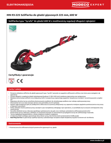 ELEKTRONARZĘDZIA MN-93-225 Szlifierka do gładzi gipsowych 225 mm, 600 W Szlifierka typu "żyrafa" do gładzi 600 W z możliwością regulacji długości rękojeści Certyfikaty i gwarancje: Cechy i zalety • Poręczna składana szlifierka do gładzi gipsowych typu "żyrafa" pozwala na wygodne szlifowanie sufitów oraz ścian poza zasięgiem rąk operatora • Zmiana długości urządzenia dzięki teleskopowej budowe (1100-1650 mm) zwiększa ergonomię oraz zasięg pracy • Składana konstrukcja szlifierki oraz dołączony kufer transportowy zapewniają wygodny i bezpieczny transport i przechowywanie urządze nia • Regulacja obrotów tarczy umożliwia dostosowanie prędkości do obrabianego podłoża oraz rodzaju wykonywanej pracy • Mocowanie tarcz na rzep znacząco skraca czas potrzebny na ich wymianę • System odprowadzania pyłu po podłączeniu odkurzacza za pomocą dołączonej rury zapewnia mniejsze zapylenie pomieszczenia oraz pracę w lepszych warunkach • Dolną rękojeść można podczas pracy zaczepić o pas narzędziowy odciążając ręce operatora, co przekłada się na znaczne zmniejszenie zmę czenia pracą • Szczotka dookoła tarczy roboczej zapobiega wydostawaniu się pyłu oraz redukuje uszkodzenia szlifowanej powierzchni • Konstrukcja tarczy roboczej z silnikiem na zawiasach pozwala na równomierne przyleganie tarczy do szlifowanego materiału • Tarcza napędzana bezpośrednio z silnika zwiększa trwałość urządzenia • 4-metrowy kabel zasilający gwarantuje duży obszar pracy, bez konieczności przenoszenia źródła prądu • Red Plug Service to gwarancja szybkiej naprawy uszkodzonego narzędzia dzięki bezpłatnej wysyłce kurierem od i do klienta Zastosowanie • Przeznaczona do szlifowania dużych powierzchni gipsowych np. gładzi www.modeco.pl ELEKTRONARZĘDZIA Wyposażenie • Zestaw papierów ściernych (różna gradacja) • Wąż ssący do odkurzacza z redukcjami • Klucz • Kufer transportowy Użytkownicy • Gipsiarze • Malarze • Majsterkowicze Produkty powiązane • MN-68-80 Papiery ścierne do szlifierek do gipsu –MN-68-801 • MN-68-80 Papiery ścierne do szlifierek do gipsu Dane techniczne Indeks MN-93-225 Moc Opakowanie jed nostkowe Opakowanie zbiorcze Waga opakowa nia jednostkowe go Waga opakowa nia zbiorczego [W] [szt] [szt] [kg] [kg] 600 1 2 10.3 20.7 moc 600 W średnica tarczy obroty długość przewodu 215 - 225 mm 600 - 1500 obr/min 4m EAN 5906675076911 Ostrzeżenia • • • • • • Przeczytaj instrukcję obsługi Zawsze używaj ochrony oczu (okulary, gogle lub przyłbice ochronne) Zawsze używaj ochrony słuchu (nauszniki, zatyczki do uszu) Zawsze używaj ochrony rąk (rękawice) Zawsze używaj ochrony dróg oddechowych (maski) INSTRUKCJA OBSŁUGI. Zawsze przestrzegaj wskazówek dotyczących bezpieczeństwa zawartych w instrukcji obsługi i obowiązujących przepisów BHP. Nie przestrzeganie zawartych w niej ostrzeżeń i zaleceń może być przyczyną porażenia prądem, pożaru, a także poważne go uszkodzenia ciała, a nawet śmierci. Należy dokładnie przeczytać i zrozumieć instrukcję obsługi, a także zachować ją do późniejszego wglądu www.modeco.pl