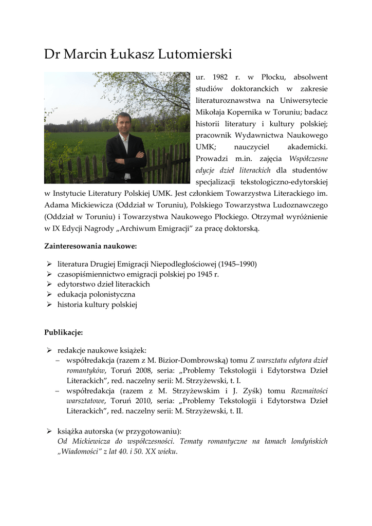 Dr Marcin Łukasz Lutomierski ur. 1982 studiów r. w Płocku, doktoranckich absolwent w zakresie literaturoznawstwa na Uniwersytecie Mikołaja Kopernika w Toruniu; badacz historii literatury i kultury polskiej; pracownik Wydawnictwa Naukowego UMK; nauczyciel akademicki. Prowadzi m.in. zajęcia Współczesne edycje dzieł literackich dla studentów specjalizacji tekstologiczno-edytorskiej w Instytucie Literatury Polskiej UMK. Jest członkiem Towarzystwa Literackiego im. Adama Mickiewicza (Oddział w Toruniu), Polskiego Towarzystwa Ludoznawczego (Oddział w Toruniu) i Towarzystwa Naukowego Płockiego. Otrzymał wyróżnienie w IX Edycji Nagrody „Archiwum Emigracji” za pracę doktorską. Zainteresowania naukowe: literatura Drugiej Emigracji Niepodległościowej (1945–1990) czasopiśmiennictwo emigracji polskiej po 1945 r. edytorstwo dzieł literackich edukacja polonistyczna historia kultury polskiej Publikacje: redakcje naukowe książek: − współredakcja (razem z M. Bizior-Dombrowską) tomu Z warsztatu edytora dzieł romantyków, Toruń 2008, seria: „Problemy Tekstologii i Edytorstwa Dzieł Literackich”, red. naczelny serii: M. Strzyżewski, t. I. − współredakcja (razem z M. Strzyżewskim i J. Zyśk) tomu Rozmaitości warsztatowe, Toruń 2010, seria: „Problemy Tekstologii i Edytorstwa Dzieł Literackich”, red. naczelny serii: M. Strzyżewski, t. II. książka autorska (w przygotowaniu): Od Mickiewicza do współczesności. Tematy romantyczne na łamach londyńskich „Wiadomości” z lat 40. i 50. XX wieku. artykuły naukowe − opublikowane: 1) Nasz(?) Mickiewicz, czyli Mickiewicz wśród studentów polonistyki, w: Mój Mickiewicz, red. E. Dryglas i in., Toruń 2006. 2) Norwid żywy, czyli recepcja poety na łamach londyńskich „Wiadomości” z lat 1946– 1966, w: Norwid – polskość, europejskość, uniwersalizm, red. D. Dąbrowska, Szczecin 2006. 3) Poszukiwanie prawdy i dobra w opowiadaniach Jana Józefa Szczepańskiego z tomu „Rozłogi”, w: Polska proza i poezja po 1989 roku wobec tradycji, red. A. Główczewski, M. Wróblewski, Toruń 2007. 4) O poetyce listu do redakcji na przykładzie emigracyjnego tygodnika „Wiadomości” z lat 1955–1958, w: Proza polska na obczyźnie. Problemy – dyskursy – uzupełnienia, red. Z. Andres, J. Pasterski, A. Wal, t. I, Rzeszów 2007. 5) O funkcjonowaniu literatury emigracyjnej wśród dzisiejszych czytelników, „Kultura i Edukacja” (Toruń) 2007, nr 3. 6) O powojennych edycjach dzieł romantyków polskich w Wielkiej Brytanii (lata 40. i 50. XX w.), w: „Problemy tekstologii i edytorstwa dzieł literackich”, red. naczelny serii M. Strzyżewski, t. I: Z warsztatu edytora dzieł romantyków, red. M. BiziorDombrowska, M. Lutomierski, Toruń 2008. 7) „Czasy wojny” Ferdynanda Goetla. Próba lektury, „Archiwum Emigracji. Studia – Szkice – Dokumenty” (Toruń) 2009, z. 2 (XI). 8) Uwagi o tęsknocie polskich emigrantów na przykładzie środowiska londyńskiego z lat 1945–1956, w: Tęsknota: społeczno-kulturowe mechanizmy kreowania emocji, red. B. Płonka-Syroka, J. Radziszewska, Wrocław 2010. 9) Lektura z opracowaniem jako nowa forma książki. Zarys problemu, w: „Problemy tekstologii i edytorstwa dzieł literackich”, red. naczelny serii M. Strzyżewski, t. II: Z warsztatu edytora dzieł romantyków, red. M. Strzyżewski, M. Lutomierski, J. Zyśk, Toruń 2010. 10) Londyńskie „Wiadomości” (1946–1981) jako źródło do dziejów emigracyjnego szkolnictwa, oświaty i edukacji, w: Czasopiśmiennictwo drugiej połowy XX wieku jako źródło do historii edukacji, red. I. Michalska, G. Michalski, Łódź 2010. 11) Edukacyjno-wychowawcze aspekty książek rocznicowych na temat Adama Mickiewicza. Przykłady z piśmiennictwa emigracyjnego, w: Słowa, obrazy, dźwięki w wychowaniu, red. S. Kawalla, E. Lewandowska-Tarasiuk, J. W. Sienkiewicz, Warszawa 2011. − przyjęte do druku 1) Przystanek Toruń. O wędrownym muzyku indiańskim (współautorstwo razem z N. Lutomierską; tom monograficzny Polskiego Towarzystwa Ludoznawczego, Oddział w Toruniu). 2) Recepcja romantyzmu w kręgu londyńskich „Wiadomości” z lat 40. i 50. XX wieku. Próba syntezy (tom monograficzny Uniwersytetu Warszawskiego). 3) Kozarynowa i Mickiewicz. Glosy do biografii twórczej pisarki („Pamiętnik Literacki”, Londyn). Ponadto: 21 artykułów popularnych, notatek, recenzji i sprawozdań – opublikowanych w „Głosie Uczelni” (Toruń), „Frazie” (Rzeszów), „Pamiętniku Literackim” (Londyn) i „Forum Książki” (Lublin). kontakt: [email protected] [email protected]