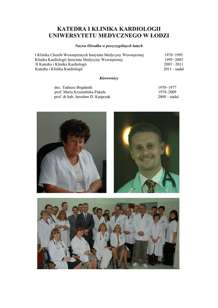 KATEDRA I KLINIKA KARDIOLOGII UNIWERSYTETU MEDYCZNEGO W ŁODZI Nazwa Ośrodka w poszczególnych latach I Klinika Chorób Wewnętrznych Instytutu Medycyny Wewnętrznej Klinika Kardiologii Instytutu Medycyny Wewnętrznej II Katedra i Klinika Kardiologii Katedra i Klinika Kardiologii 1970−1995 1995−2003 2003 −2011 2011 - nadal Kierownicy doc. Tadeusz Bogdanik prof. Maria Krzemińska-Pakuła prof. dr hab. Jarosław D. Kasprzak 1970−1977 1978–2009 2009 – nadal Pracownicy Stanisław Ciechowicz 1970 − 1978 Włodzimierz Geraga 1970 − 1982 Egida Tydelska 1970 − 1973 Zofia Czechowicz 1970 − 1976 Ewa Kowalewska 1970 − 1973 Alina Sosin 1970 − 1975 Jan Zambrzycki 1970 − 1991 Halina Maciaszek-Kryczka 1974 − 1983 Ireneusz Tyszkiewicz 1974 − 1975 Małgorzata Marszal-Marciniak* 1974 − 1998 Irena Binikowska-Gietka 1976 − 1980 Małgorzata Chmielnicka-Pruszczyńska 1976 − 1982 Marek Demczuk 1976 − 1990 Joanna Kinastowska-Hantz 1977 − 1983 Maria Krzemińska-Pakuła* 1978 – 2009 Andrzej Żebrowski 1979 − 1987 Krystyna Rafalska 1979 − 1998 Anna Adamek-Kośmider 1979 − 1987 Małgorzata Wraga 1981 − nadal Konrad Wąsikowski* 1982 − 1987 Mirosława Pietrzak 1982 − 1986 Waldemar Rogowski 1982 − nadal Elżbieta Figas-Powajbo 1982 − 1995 Elżbieta Łazarczyk-Kędzia Barbara Bieńkiewicz Tomasz Waszyrowski Małgorzata Kurpesa Zbigniew Binikowski Zbigniew Bednarkiewicz Jan Zbigniew Peruga Włodzimierz Musiał Wojciech Religa Jarosław Drożdż Reanta Jencek Jarosław D. Kasprzak Piotr Prelich Ewa Mrozowska* Michał Plewka Michał Żebrowski Michał Kidawa Tomasz Rechciński Karina Wierzbowska-Drabik Łukasz Chrzanowski Piotr Lipiec Tomasz Jeżewski Tomasz Rudziński 1982 − 1995 1982 − 1989 1984 − 1997 1985 − nadal 1985 − 1991 1986 – nadal 1986 − nadal 1986 − 1995 1988 − 2005 1989 − 2009 1989 − 1998 1989 − nadal 1989 − 1991 1994 − 2003 1994 − nadal 1996 − 2006 1996 − 2011 1998 − nadal 2002 – nadal 2005 - nadal 2006 – nadal 2007 - nadal 2007 - nadal * Pracownicy nadal zatrudnieni poza etatami akademickimi Kliniki Pracownicy techniczni i laboratoryjni Pławska Danuta Ignar Bogusława Jung Joanna Granosik Sylwester Bzowski Tomasz Pietryk Alicja Polk Jadwiga 1971−1978 1976−1983 1985−1985 1986-1986 1987 − nadal 1988−1991 1988−1997 Pracownicy Sekretariatu Matuszczak Wanda Stala Alicja Andrzejak Krystyna Abramczyk Grażyna Kiryszewska Izabella* 1970−1973 1974−1976, 1977−1983, 1984 − nadal, 1991−2004 Pracownia Echokardiografii /Zakład Szybkiej Diagnostyki Kardiologicznej Kierownicy: Małgorzata Marszal-Marciniak Waldemar Rogowski Jarosław D. Kasprzak Piotr Lipiec 1985 − 1997 1997 − 2001 2001 – 2009 2009 - 2011 Pracownia Elektrokardiologii Nieinwazyjnej (Holtera i Prób Wysiłkowych) Kierownicy: Marek Demczuk Elżbieta Łazarczyk-Kędzia Małgorzata Kurpesa 1985−1991 1991−1995 1995 − nadal Pracownia Biochemii i Immunologii Klinicznej (Immunologii Kardiologicznej i Transplantacyjnej Kierownicy: Andrzej Żebrowski Małgorzata Wraga 1976−1995 1995- nadal Pracownia Kardiologii Interwencyjnej (Pracownia Hemodynamiki) Kierownik: Jan Zbigniew Peruga 1998 – nadal Pracownia Elektrostymulacji i Elektroterapii( Pracownia Implantacji Stymulatorów) Kierownik: dr n. med. Zbigniew Bednarkiewicz 2001 – nadal Rys historyczny Kardiologiczne dzieje obecnej Katedry Kardiologii Uniwersytetu Medycznego w Łodzi datują się od 1 października 1978 roku, kiedy kierownictwo I Kliniki Chorób Wewnętrznych Instytutu Medycyny Wewnętrznej, mieszczącą się na terenie miejskiego Szpitala im. dr Karola Jonschera w Łodzi objęła pani doc. dr hab. n. med. Maria Krzemińska-Pakuła. W raz z nią do kliniki przyszedł i objął funkcję zastępcy dr n. med. Andrzej Żebrowski. W skład Kliniki wchodziło trzech adiunktów – oprócz dr Żebrowskiego, dr Włodzimierz Gieraga i Jan Zambrzycki oraz siedmiu asystentów. Działalność Kliniki w ówczesnym okresie obejmowała pełne spektrum medycyny chorób wewnętrznych, niemniej w krótkim okresie czasu wykrystalizowało się szczególne zainteresowanie kardiologią jako wiodącą dziedziną, zarówno w aspekcie naukowym jak i profilu leczonych w klinice chorych. W latach 1978-1980 klinika pozyskała m.in. echokardiograf Smith and Kline EKOLINE, nowoczesny na owe czasy ergometr rowerowy umożliwiający wykonywanie prób wysiłkowych, kardiostymulatory zewnętrzne umożliwiające czasową stymulację serca oraz rozpoczęto tworzenie pododdziału Intensywnego Nadzoru Kardiologicznego. Zakupiono m.in. kardiomonitory i centralę do nadzoru nad chorymi. Równocześnie pracownicy kliniki rozpoczęli intensywną pracę naukową, owocującą licznymi doniesieniami i pracami naukowymi prezentowanymi na krajowych i zagranicznych zjazdach oraz w specjalistycznych pismach. W kolejnych latach Klinika wzbogaciła się o kolejne aparaty służące diagnostyce kardiologicznej – telemetr f-my DATASPIR, umożliwiający ocenę EKG na odległość, przyłóżkowy aparat rentgenowski oraz ultradźwiękowy detektor przepływu UDP-30, na którym zapoczątkowano badania naukowe związane z oceną funkcji serca. W październiku 1984 roku miała miejsce nominacja profesorska Kierownika Kliniki doc. Marii Krzemińskiej- Pakuły. W tym samym roku Klinika pozyskała nowoczesny aparat echokardiograficzny IREX III B, umożliwiający innowacyjnych wówczas dwuwymiarowych i doplerowskich badań USG serca, mingograf Siemens-Elema do badań polikardiograficznych oraz jeden z pierwszych w kraju aparat do 24-godzinnego monitorowania EKG metodą Holtera Oxford Medical System. 11 października 1984 roku wykonano pierwszy w Klinice zabieg implantacji stymulatora serca. Pierwszy zabieg wykonany został przez dr A. Żebrowskiego i lek. Z. Bednarkiewicza, a od tamtego dnia w Klinice wykonano ponad 5000 tych zabiegów. W 1986 roku został zakupiony nowy, najwyższej klasy aparat ultrasonograficzny IREX Meridia