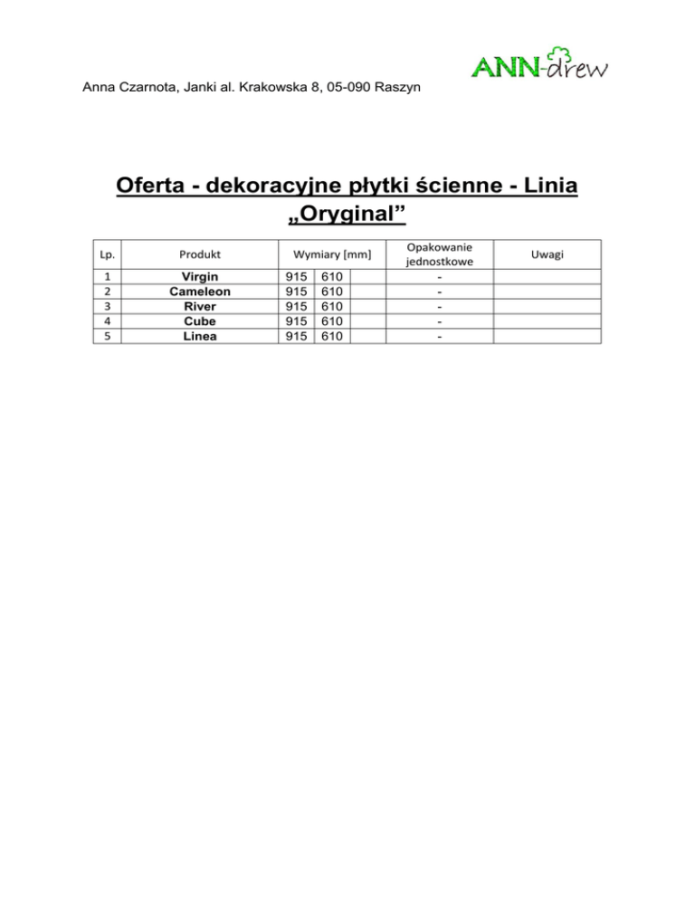 Anna Czarnota, Janki al. Krakowska 8, 05-090 Raszyn Oferta - dekoracyjne płytki ścienne - Linia „Oryginal” Lp. Produkt 1 2 3 4 5 Virgin Cameleon River Cube Linea Wymiary [mm] 915 915 915 915 915 610 610 610 610 610 Opakowanie jednostkowe - Uwagi