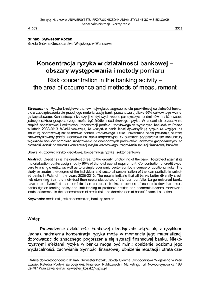 Zeszyty Naukowe UNIWERSYTETU PRZYRODNICZO-HUMANISTYCZNEGO w SIEDLCACH Seria: Administracja i Zarządzanie Nr 108 2016 dr hab. Sylwester Kozak1 Szkoła Główna Gospodarstwa Wiejskiego w Warszawie Koncentracja ryzyka w działalności bankowej – obszary występowania i metody pomiaru Risk concentration in the banking activity – the area of occurrence and methods of measurement Streszczenie: Ryzyko kredytowe stanowi największe zagrożenie dla prawidłowej działalności banku, a dla zabezpieczenia się przed jego materializacją banki przeznaczają blisko 90% całkowitego wymogu kapitałowego. Koncentracja ekspozycji kredytowych wobec pojedynczych podmiotów, a także wobec jednego sektora gospodarczego może być źródłem dodatkowego ryzyka. W badaniach oszacowano stopień podmiotowej i sektorowej koncentracji portfela kredytowego w wybranych bankach w Polsce w latach 2008-2013. Wyniki wskazują, że wszystkie banki lepiej dywersyfikują ryzyko ze względu na strukturę podmiotową niż sektorową portfela kredytowego. Duże uniwersalne banki posiadają bardziej zdywersyfikowany portfel kredytowy niż banki korporacyjne. W okresach pogorszenia się koniunktury większość banków ogranicza kredytowanie do dochodowych podmiotów i sektorów gospodarczych, co prowadzi jednak do wzrostu koncentracji ryzyka kredytowego i zagrożenia sytuacji finansowej banków. Słowa kluczowe: ryzyko kredytowe, koncentracja ryzyka, sektor bankowy Abstract: Credit risk is the greatest threat to the orderly functioning of the bank. To protect against its materialization banks assign nearly 90% of the total capital requirement. Concentration of credit exposure to a single entity, as well as to a single economic sector can be a source of additional risks. The study estimates the degree of the individual and sectorial concentration of the loan portfolio in selected banks in Poland in the years 2008-2013. The results indicate that all banks better diversify credit risk stemming from the individual than sectorialstructure of the loan portfolio. Large universal banks have more diversified loan portfolio than corporate banks. In periods of economic downturn, most banks tighten lending policy and limit lending to profitable entities and economic sectors. However it leads to increase in the concentration of credit risk and deterioration of banks' financial situation. Keywords: credit risk, risk concentration, banking sector Wstęp Prowadzenie działalności bankowej nieodłącznie wiąże się z ryzykiem. Jednak nadmierna koncentracja ryzyka może w momencie jego materializacji doprowadzić do znacznego pogorszenia się sytuacji finansowej banku. Niekorzystnymi efektami ryzyka w banku mogą być m.in.: obniżenie poziomu jego wypłacalności, zachwianie płynności finansowej, obniżenie reputacji i utrata częAdres do korespondencji: dr hab. Sylwester Kozak, Szkoła Główna Gospodarstwa Wiejskiego w Warszawie, Katedra Polityki Europejskiej, Finansów Publicznych i Marketingu, ul. Nowoursynowska 166, 02-787 Warszawa, e-mail: [email protected] 1 76 S. Kozak ści klientów. Ponadto koncentracja ryzyka może całkowicie uniemożliwić funkcjonowanie przedsiębiorstwa i doprowadzić do jego upadłości. W działalności bankowej najważniejszym rodzajem ryzyka jest ryzyko kredytowe związane z możliwością niewypłacalności kredytobiorców, wśród nich głównie przedsiębiorstw i osób prywatnych. Podstawową formą zabezpieczenia się banków przed negatywnymi skutkami ryzyka jest zgromadzenie odpowiedniej wielkości kapitałów własnych. Ich wartość powinna być większa od wartości tzw. wymogu kapitałowego, będącego funkcją prawdopodobieństwa zmaterializowania się ryzyka, na jakie bank jest narażony. Ze względu na możliwość wywołania najwyższych strat w działalności banku, ryzyko kredytowe wymaga przyporządkowania mu największej części wymogu kapitałowego. Udział kapitału przeznaczonego na zabezpieczenie ryzyka kredytowego dochodzi nawet do 90% całkowitego wymogu kapitałowego2. Należy jednak zwrócić uwagę, że złożoność prowadzonej przez banki działalności sprawia, że ich sytuacja finansowa w istotnym stopniu zależy od sposobu identyfikowania i kontrolowania ryzyka kredytowego oraz innych jego rodzajów, m.in. ryzyka operacyjnego, ryzyka płynności czy ryzyka rynkowego. Dlatego też struktura ryzyka w każdym banku jest wypadkową jego oferty produktowej, geograficznego obszaru działania, poziomu agresywności polityki kredytowej czy struktury organizacyjnej3. Koncentracja ryzyka jest istotna dla funkcjonowania gospodarki. Nadmierny wzrost ryzyka bankowego może osłabić tempo wzrostu gospodarczego. Straty poniesione przez banki z tytułu materializacji ryzyka kredytowego skoncentrowanego w obrębie jednego sektora gospodarczego mogą podnieść ogólny poziom awersji na ryzyko w polityce kredytowej. W takich sytuacjach banki zazwyczaj zacieśniają politykę kredytową i ograniczają kredytowanie osób prywatnych, a także przedsiębiorstw ze wszystkich sektorów gospodarki4. Z kolei aktywizacja ryzyka płynności i wypłacalności w dowolnym banku może stać się źródłem niepokojów społecznych, a nawet paniki wśród klientów. Zaburzenia w działalności nawet niewielkiej liczby banków mogą prowadzić do obniżenia zaufania społecznego do całego sektora bankowego. Pomimo ustawowej gwarancji wypłaty depozytów5 niestandardowe zachowanie władz Islandii w sytuacji upadłości dużych banków islandzkich w latach 2007-2008 mogą usprawiedliwiać nadmierną wrażliwość klientów co do ryzyka nieodzyskania depozytów6. W latach 2011-2014 wymóg kapitałowy z tytułu ryzyka kredytowego stanowił od 86,5 do 88,9% całkowitego wymogu kapitałowego sektora bankowego w Polsce; zob. dane do wykresu 3.47 w: Raport o stabilności systemu finansowego, lipiec 2014 r., NBP, Warszawa, http://www.nbp.pl/systemfinansowy/rsf072014.pdf [2015.02.20]. 3 L. Laeven, R. Levi