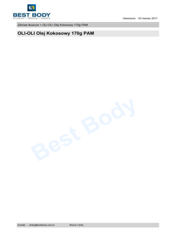 Utworzono : 03 marzec 2017 Zdrowe tłuszcze > OLI-OLI Olej Kokosowy 170g PAM OLI-OLI Olej Kokosowy 170g PAM t s e B kontakt : - [email protected] Strona 1/{nb} o B y d Utworzono : 03 marzec 2017 Zdrowe tłuszcze > OLI-OLI Olej Kokosowy 170g PAM OLI-OLI Olej Kokosowy 170g PAM Model : OLI-OLI Olej Kokosowy 170g PAM Producent : OLI-OLI Olej Kokosowy w sprayu - to nowość pośród uniwersalnych pamów do smażenia bez zawartości tłuszczu. Wyróżnia się rewelacyjnym aromatem i możliwością zastosowania nawet na najbardziej restrykcyjnych dietach. Nowy rodzaj aromatu z pewnością przypadnie do gustu wszystkim, którzy cenią sobie specyficzny zapach kokosu. � Wysoka wydajność � Brak kalorii i tłuszczu � Łatwy w codziennym stosowaniu � Nie zmienia smaku naszych ulubionych dań � Doskonale komponuje się z każdym rodzajem potraw � Niezbędnik podczas diety redukcyjnej y d Oli Oli Olej Kokosowy to kolejny spośród wyjątkowo cenionej grupy niskokalorycznych pomocników podczas codziennego smażenia. Potrawy gotowane potrafią być bardzo smaczne, jednak należy pamiętać, że nawet nasze ulubione smaki z czasem mogą stać się monotonne. Wybór produktów z serii Oli Oli jest na tyle duży, że każdy bez najmniejszego kłopotu wybierze coś dla Siebie i będzie mógł cieszyć się pysznymi potrawami niezależnie od stosowanej diety. t s e B o B Smak kokosowy Oli-Oli Olej Kokosowy doskonale komponuje się między innymi z wszelkiego rodzaju chudym mięsem oraz wieloma źródłami węglowodanów o niskim indeksie glikemicznym. Zapewnia to Jego uniwersalne zastosowanie zarówno przez kulturystów jak i osoby ceniące zdrowy styl życia i racjonalne odżywianie. Skład: rafinowany organiczny olej kokosowy*, lecytyna, naturalne aromaty, gaz wypychający. * jest źródłem niewielkiej ilości tłuszczu na jednostkę spożycia. kontakt : - [email protected] Strona 2/{nb} Utworzono : 03 marzec 2017 Zdrowe tłuszcze > OLI-OLI Olej Kokosowy 170g PAM OLI-OLI Olej Kokosowy 170g PAM Zawiera soję. Wielkość porcji: 0,25g Ilość porcji w opakowaniu: 462 Dawkowanie i sposób użycia: Wstrząsnąć przed użyciem, skierować aplikator zgodnie ze strzałką i nacisnąć. Przekręcić puszkę o 45 stopni od pionu i rozpylać z odległości 15-30 cm od powierzchni. Dla lepszego efektu, lekko podgrzać naczynie przed dodaniem produktu przeznaczonego do smażenia. Naciskając przez 1/3 sekundy zużywa się około 0.25 g. Produkt nie może być stosowany jako substytut zróżnicowanej diety. Nie należy stosować w przypadku jakichkolwiek problemów fizjologicznych lub psychologicznych, a także podczas stosowania niektórych leków. W razie wątpliwości należy skonsultować się z lekarzem. Nie należy przekraczać zalecanej przez producenta dziennej porcji do spożycia. Przechowywać w miejscu niedostępnym dla dzieci. o B y d UWAGA - kopiowanie oraz rozpowrzechnianie opisów jest zabronione przez BEST BODY © 2016. Ustawa z dnia 4 lutego 1994 r. o prawie autorskim i prawach pokrewnych (Dz. U. z 2006 r. Nr 90, poz. 631 z późn. zm.). Ochrona autorskich praw osobistych: Twórca, którego autorskie prawa osobiste zostały zagrożone cudzym działaniem, może żądać zaniechania tego działania. W razie dokonanego naruszenia może także żądać, aby osoba, która dopuściła się naruszenia, dopełniła czynności potrzebnych do usunięcia jego skutków, w szczególności, aby złożyła publiczne oświadczenie o odpowiedniej treści i formie. Jeżeli naruszenie było zawinione, sąd może przyznać twórcy odpowiednią sumę pieniężną tytułem zadośćuczynienia za doznaną krzywdę albo - na żądanie twórcy - zobowiązać sprawcę, aby uiścił odpowiednią sumę pieniężną na wskazany przez twórcę cel społeczny. t s e B Cena : 24,00 zł Brutto ( 22,43 zł Netto) Dostępność: Produkt dostępny w naszym sklepie od 04 grudzień 2016 kontakt : - [email protected] Strona 3/{nb}
