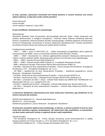 a) imię, nazwisko, zajmowane stanowisko lub funkcje pełnione w ramach emitenta oraz termin upływu kadencji, na jaką dana osoba została powołana Cezary Nowosad Prezes Zarządu Termin upływu II kadencji: 1 lipca 2016 b) opis kwalifikacji i doświadczenia zawodowego Wykształcenie: Absolwent Wydziału Fizyki Uniwersytetu Warszawskiego (kierunki: fizyka i fizyka medyczna) oraz studiów doktoranckich w Kolegium Zarządzania i Finansów Szkoły Głównej Handlowej (kierunki: finanse i zarządzanie). Ukończył Studium doradcy inwestycyjnego i analityka papierów wartościowych (Centrum Prywatyzacji). Uczestniczył w licznych szkoleniach specjalistycznych. Posiada uprawnienia do pełnienia funkcji członka rad nadzorczych spółek Skarbu Państwa. Przebieg kariery zawodowej: - 1997 r. – 2004 r. praca w MTS-CeTO S.A. – spółce prowadzącej pozagiełdowy obrót papierami wartościowymi (od 2000 r. praca na stanowisku Dyrektora Działu Rozwoju i Analiz) - 2000 r. – 2003 r. Koordynator ds. realizacji ogólnopolskiej kampanii edukacyjnej skierowanej do małych i średniej wielkości spółek, dotyczącej wykorzystania instrumentów rynku kapitałowego, - 2004 r. – 2005 r. Doradca Prezesa Nafty Polskiej S.A. - 2005 r. – 2006 r. Członek Zarządu Nafty Polskiej S.A., a następnie Wiceprezes Zarządu - 2006 r. Wiceprezes Zarządu Towarzystwo Obrotu Nieruchomościami AGRO S.A. - Od 2006 r. (sierpień) do dnia zatwierdzenia Prospektu - Prezes Zarządu IPO Doradztwo Strategiczne SA (dawniej „I.P.O. – Doradztwo Strategiczne” Sp. z o.o.) - Od 2006 r. (październik) do dnia zatwierdzenia Prospektu – działalność gospodarcza „Cezary Nowosad – Zarządzanie i Doradztwo” - Od 2010 r. (kwiecień) do dnia zatwierdzenia Prospektu – Prezes Zarządu INVISTA S.A. - Od 2010 r. (kwiecień) do 2012 r. (listopad) Prezes Zarządu INVISTA Dom Maklerski S.A. - Od 2012 r. (czerwiec) do 2013 r. (luty) – Członek Rady Nadzorczej GREEN ECO TECHNOLOGY S.A. (dawniej jako Anti Sp. z o.o. następnie Anti S.A.) - Od 2012 r. (październik) do 2012 r. (listopada) - Członek Rady Nadzorczej Nicolas Games S.A. - Od 2012 r. (listopad) do dnia zatwierdzenia Prospektu – Członek Rady Nadzorczej INVISTA Dom Maklerski S.A. c) wskazanie działalności wykonywanej przez daną osobę poza emitentem, gdy działalność ta ma istotne znaczenie dla emitenta INVISTA Dom Maklerski S.A. - Członek Rady Nadzorczej INVISTA S.A. - Prezes Zarządu Działalność gospodarcza „Cezary Nowosad – Zarządzanie i Doradztwo” d) wskazanie wszystkich spółek prawa handlowego, w których, w okresie ostatnich trzech lat, dana osoba była członkiem organów zarządzających lub nadzorczych albo wspólnikiem, ze wskazaniem, czy dana osoba nadal pełni funkcje w organach lub jest nadal wspólnikiem Członek Zarządu: - IPO Doradztwo Strategiczne SA - Prezes Zarządu (wcześniej, przed przekształceniem w spółkę akcyjną wspólnik oraz Prezes Zarządu w „I.P.O. Doradztwo Strategiczne” Sp. z o.o.) - INVISTA Dom Maklerski S.A. – Prezes Zarządu (do listopada 2012 roku) - INVISTA S.A. – Prezes Zarządu Członek Rady Nadzorczej: - INVISTA Dom Maklerski S.A. – Członek Rady Nadzorczej - GREEN ECO TECHNOLOGY S.A. (wcześniej jako Anti Sp. z o.o. następnie Anti S.A.) - Członek Rady Nadzorczej - Nicolas Games S.A. – Członek Rady Nadzorczej Wspólnik: - Grand Cru Sp. z. o.o. (na dzień zatwierdzenia Prospektu Grand Cru S.A.) - wspólnik (po przekształceniu spółki - akcjonariusz) - Pan Cezary Nowosad posiada bezpośrednio 400.000 akcji stanowiących 1,94% kapitału zakładowego oraz dających 1,94% głosów na Walnym Zgromadzeniu Spółki - Polish Sport Agency Sp. z o.o. – wspólnik, Pan Cezary Nowosad posiadał 500 udziałów dających 5% głosów na Walnym Zgromadzeniu Spółki - Domenomania Sp. z o.o. – wspólnik, po przekształceniu w spółkę akcyjną –akcjonariusz (Domenomania S.A. - spółka publiczna), posiada akcje w ilości poniżej 5% głosów na WZA - Kinomaniak Sp. z o.o. (Kinomaniak S.A., Concepto S.A. obecnie Immofund S.A.) – wspólnik, po przekształceniu w spółkę akcyjną - akcjonariusz - (Immofunf S.A. -spółka publiczna), posiada akcje w ilości poniżej 5% głosów na WZA - Velto Sp. z o.o.– wspólnik, po przekształceniu w spółkę akcyjną - akcjonariusz (Velto S.A. - spółka publiczna), posiada akcje w ilości poniżej 5% głosów na WZA - Macro Games Sp. z o.o. – wspólnik, po przekształceniu w spółkę akcyjną - akcjonariusz) - (Macro Games S.A. - spółka publiczna), posiada akcje w ilości poniżej 5% głosów na WZA e) informacje na temat prawomocnych wyroków, na mocy których dana osoba została skazana za przestępstwa oszustwa w okresie co najmniej ostatnich pięciu lat oraz wskazanie, czy w okresie co najmniej ostatnich pięciu lat osoba taka otrzymała sądowy zakaz działania jako członek organów zarządzających lub nadzorczych w spółkach prawa handlowego Brak f) szczegóły wszystkich przypadków upadłości, zarządu komisarycznego lub likwidacji, w okresie co najmniej ostatnich pięciu lat, w odniesieniu do podmiotów, w których dana osoba pełniła funkcje członka organu zarządzającego lub nadzorczego Brak g) informację, czy dana osoba prowadzi działalność, która jest konkurencyjna w stosunku do działalności emitenta, oraz czy jest wspólnikiem konkurencyjnej spółki cywilnej lub osobowej albo członkiem organu spółki kapitałowej lub członkiem organu jakiejkolwiek konkurencyjnej osoby prawnej Pan Cezary Nowosad posiada zgodę organów Spółki na wykonywanie działalności konkurencyjnej. Działalność wykonywana poza przedsiębiorstwem Emitenta, może być konkurencyjna w stosunku do IPO Doradztwo Strategiczne S.A., przy czym IPO Doradztwo Strategiczne S.A. jest akcjonariuszem INVISTA SA. h) informację, czy dana osoba figuruje w rejestrze dłużników niewypłacalnych, prowadzonym na podstawie ustawy z dnia 20 sierpnia 1997 r. o 