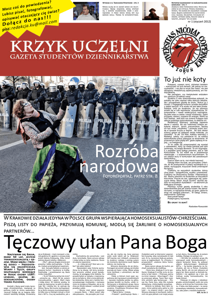ze n i a ? d e i w o ś do p ać, M a s z c o ć , fo t o g ra fo w isa świat? Lubisz p taczający cię ać o o p i sy w nas!!! Wywiad z o. Tadeuszem Rydzykiem - str. 3 Reportaż nagrodzony w ogólnopolskim konkursie - str. 7. Zgwałcił mnie pierwszego dnia. Rzucił na łóżko w ich sypialni. Powoli rozebrał i patrzył. Ten wzrok był najgorszy. Leżałam naga. Błądził wzrokiem po całym moim ciele. Głaskał. Delikatnie. Chciałam wydrapać, wyrwać skórę. Kolejny krok w naszym „związku” był za nami. Media służą mi w jakimś sensie do multiplikacji. Będąc księdzem, mogę spotkać się z jednym człowiekiem, może z dziesięcioma. A przez media mogę być dla bardzo wielu. Trzeba to wykorzystywać. do z com c . l i ą a ł m o @ D . ku e d a kc j a nr 1 (styczeń 2012) pisz: r To już nie koty Rozróba narodowa Fotoreportaż, patrz str. 8 fot. Tytus Szabelski Pokąsani, czasem ranni, zdziwieni światem – wykrzyczeli na tych łamach, jak patrzą na rzeczywistość. I nie jest to krzyk bez treści, nie jest obciążony młodzieńczą zapalczywością, ani niedojrzałością. Nie pamiętam, czy kiedykolwiek widziałem tylu zdolnych 20-latków naraz. Studenci II roku dziennikarstwa pokazali, że potrafią nie tylko napisać kilka dobrych tekstów, ale i przygotować gazetę do druku. Wykuć ją z nicości, z migającego kursora i przede wszystkim z siebie samych. A to wcale nie jest takie proste. Solidnie, choć po studencku, po raz pierwszy wcielili się w role reporterów, wywiadowców, fotoreporterów i nawet redakcyjnych ważniaków. Są pełni wiary w siebie i swoje możliwości. Żądni przygody, otwarci, rozpiera ich energia. Warto na nich stawiać. Jeśli ktoś ma zmienić kulejące dziś oblicze polskiego dziennikarstwa, to właśnie oni. Redaktorzy Ważniacy zacierają zapewne dłonie z radości. Bo oto nadchodzi kolejne pokolenie dobrych, tanich pracowników. Nazwą ich być może „narybkiem” i pozwolą zrobić sondę w sprawie krzyża w Sejmie... Bo dziś młodzi autorzy gotowi są oddawać swoje materiały „za nazwisko”. To złe. Od Was, koledzy ważniacy z Redakcji, zależy, czy pokażecie im, że solidna dziennikarska praca zasługuje na docenienie. W przeciwnym razie pójdą tam, gdzie zapłacą im lepiej – za inteligencję. To im udało się przeprowadzić się wywiad z człowiekiem, który na media bardziej jest dziś zamknięty, niż ksiądz Boniecki. To oni wygrzebali z popiołów żonę byłego premiera, asa w Talii Komunistów. To oni wzbili się w przestworza niedościgłe – z szybowcowym arcymistrzem. To oni zdobyli laury w konkursach dla zawodowych dziennikarzy... Szacun Wam za to, moi młodzi kamraci! Odwagi Wam nie brak, ani pomysłów. Chłońcie, aż do przesycenia! A potem wyciskajcie to z siebie, wyrzygujcie, krzyczcie! Świat zmieniajcie! Na lepszy... Czekamy na wszystkich studentów, którzy chcą pisać – fotograficznie, szybko i prawdziwie. Czekamy na Okazywaczy Świata. I Naprawiaczy też. Stoimy otworem na studentów ze wszystkich kierunków. Piszcie do nas, zgłaszajcie się, pokazujcie teksty. Niech „Krzyk Uczelni” słychać będzie na wszystkich wydziałach – od ekonomii po kiełkującą sinologię. Pierwszy numer gazety studentów II roku dziennikarstwa jest jak szarża husarii. Na złamanie karku, w najcięższe tematy, po grani, gdzie Im drogi nie zastąpią pokonani... W nałogi, śmierć, zapomnienie i dylematy. Ktoś potrafi lepiej? Podejmujemy wyzwanie. Bo grunt to bunt! Radosław Rzeszotek W Krakowie działa jedyna w Polsce grupa wspierająca homoseksualistów-chrześcijan. Piszą listy do papieża, przyjmują komunię, modlą się żarliwie o homoseksualnych partnerów... Tęczowy ułan Pana Boga Nazywam się Basia, mam 50 lat, jestem transseksualistą i gejem. Mam męża i trójkę dzieci – przedstawia się założycielka Wiary i Tęczy, grupy skupiającej wierzące w Boga osoby LGBT: lesbijki, gejów, biseksualistów, osoby trans płciowe. Kontakt z Basią spod znaku tęczowego chrześcijaństwa, nawiązuję za pomocą maila ze strony www.wiara-tecza.pl Podaję się za targaną dylematami katolicką lesbijkę. Umawiamy się w Krakowie – mam nocować u niej. Jest godzina 22, zgodnie z umową stoję przed Galerią Krakowską. Kilka minut później dzwoni telefon. Odbieram. – Olu? – głos po drugiej stronie jest powolny i lekko zachrypnięty. – Tu Basia. Czekam przed głównym wejściem. Jest. Szczupła kobieta w jasnej pikowanej kurtce i kaszkiecie w kratkę. Podchodzę i przedstawiam się. Basia ściska moją dłoń. – To co? Możemy jechać do mnie? - uśmiecha się. - Mam 50 lat, jestem transseksualistą i gejem. Mam męża i trójkę dzieci. W rodzinie wiedzą, że czuję się mężczyzną i w pełni to akceptują. No i wiedzą też, że zajmuję się Wiarą i Tęczą. Nie musisz się krępować, bo w domu wszyscy są przyzwyczajeni, że kilka razy w miesiącu nocuje u mnie ktoś z WiT-u. Czuj się swobodnie, jak u siebie. Dochodzimy do samochodu – jest duży, terenówka. Basia wrzuca zakupy i moją torbę na tylne siedzenia. Rzuca mi uważne spojrzenie: - A z tobą jak jest? Ktoś wie o tobie? Jak sobie radzisz? Opowiadam więc historię wymyśloną na tę okazję: rok temu przestałam wreszcie uciekać przed świadomością, że pociągają mnie kobiety. Co prawda byłam w związku z mężczyzną, ale to nie było to. Wie o mnie jedna dobra koleżanka, która jest z bardzo konserwatywnego środowiska i namawia mnie na terapię w Odwadze, ale ja nie chcę już dłużej udawać i uciekać przed prawdą o sobie. – Musisz mieć jakieś wsparcie – zauważa Basia. – Skoro jesteś taka zdecydowana... Na początku jest trud- no, ale nie martw się, teraz poznasz wiele osób takich jak ty. Większość WiT-owców jest młodych, przeważnie to studenci, czekają z coming outem do momentu skończenia nauki. Będzie dobrze, nie martw się. Wreszcie docieramy do jej domu. Pomagam jej wnie