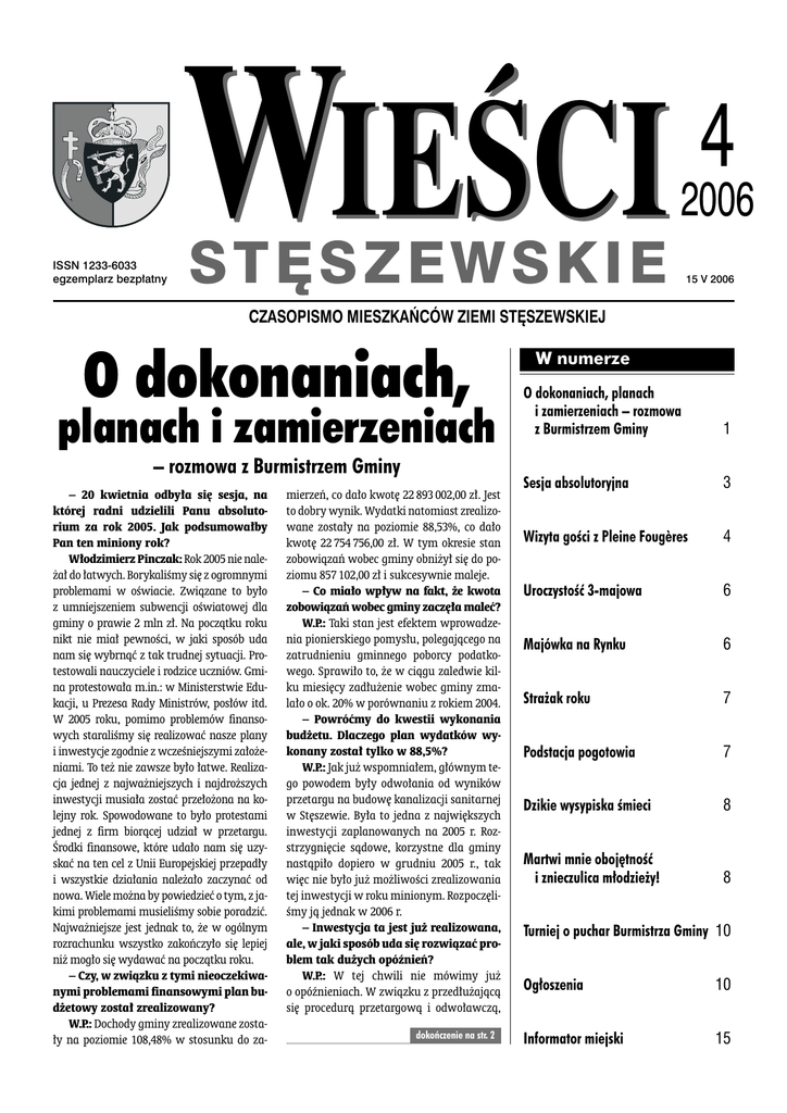 ISSN 1233-6033 egzemplarz bezp∏atny WIEÂCI 4 2006 ST¢SZEWSKIE 15 V 2006 CZASOPISMO MIESZKA¡CÓW ZIEMI ST¢SZEWSKIEJ O dokonaniach, planach i zamierzeniach – rozmowa z Burmistrzem Gminy – 20 kwietnia odby∏a si´ sesja, na której radni udzielili Panu absolutorium za rok 2005. Jak podsumowa∏by Pan ten miniony rok? W∏odzimierz Pinczak: Rok 2005 nie nale˝a∏ do ∏atwych. BorykaliÊmy si´ z ogromnymi problemami w oÊwiacie. Zwiàzane to by∏o z umniejszeniem subwencji oÊwiatowej dla gminy o prawie 2 mln z∏. Na poczàtku roku nikt nie mia∏ pewnoÊci, w jaki sposób uda nam si´ wybrnàç z tak trudnej sytuacji. Protestowali nauczyciele i rodzice uczniów. Gmina protestowa∏a m.in.: w Ministerstwie Edukacji, u Prezesa Rady Ministrów, pos∏ów itd. W 2005 roku, pomimo problemów finansowych staraliÊmy si´ realizowaç nasze plany i inwestycje zgodnie z wczeÊniejszymi za∏o˝eniami. To te˝ nie zawsze by∏o ∏atwe. Realizacja jednej z najwa˝niejszych i najdro˝szych inwestycji musia∏a zostaç prze∏o˝ona na kolejny rok. Spowodowane to by∏o protestami jednej z firm bioràcej udzia∏ w przetargu. Ârodki finansowe, które uda∏o nam si´ uzyskaç na ten cel z Unii Europejskiej przepad∏y i wszystkie dzia∏ania nale˝a∏o zaczynaç od nowa. Wiele mo˝na by powiedzieç o tym, z jakimi problemami musieliÊmy sobie poradziç. Najwa˝niejsze jest jednak to, ˝e w ogólnym rozrachunku wszystko zakoƒczy∏o si´ lepiej ni˝ mog∏o si´ wydawaç na poczàtku roku. – Czy, w zwiàzku z tymi nieoczekiwanymi problemami finansowymi plan bud˝etowy zosta∏ zrealizowany? W.P.: Dochody gminy zrealizowane zosta∏y na poziomie 108,48% w stosunku do za- mierzeƒ, co da∏o kwot´ 22 893 002,00 z∏. Jest to dobry wynik. Wydatki natomiast zrealizowane zosta∏y na poziomie 88,53%, co da∏o kwot´ 22 754 756,00 z∏. W tym okresie stan zobowiàzaƒ wobec gminy obni˝y∏ si´ do poziomu 857 102,00 z∏ i sukcesywnie maleje. – Co mia∏o wp∏yw na fakt, ˝e kwota zobowiàzaƒ wobec gminy zacz´∏a maleç? W.P.: Taki stan jest efektem wprowadzenia pionierskiego pomys∏u, polegajàcego na zatrudnieniu gminnego poborcy podatkowego. Sprawi∏o to, ˝e w ciàgu zaledwie kilku miesi´cy zad∏u˝enie wobec gminy zmala∏o o ok. 20% w porównaniu z rokiem 2004. – Powróçmy do kwestii wykonania bud˝etu. Dlaczego plan wydatków wykonany zosta∏ tylko w 88,5%? W.P.: Jak ju˝ wspomnia∏em, g∏ównym tego powodem by∏y odwo∏ania od wyników przetargu na budow´ kanalizacji sanitarnej w St´szewie. By∏a to jedna z najwi´kszych inwestycji zaplanowanych na 2005 r. Rozstrzygni´cie sàdowe, korzystne dla gminy nastàpi∏o dopiero w grudniu 2005 r., tak wi´c nie by∏o ju˝ mo˝liwoÊci zrealizowania tej inwestycji w roku minionym. Rozpocz´liÊmy jà jednak w 2006 r. – Inwestycja ta jest ju˝ realizowana, ale, w jaki sposób uda si´ rozwiàzaç problem tak du˝ych opóênieƒ? W.P.: W tej chwili nie mówimy ju˝ o opóênieniach. W zwiàzku z przed∏u˝ajàcà si´ procedurà przetargowà i odwo∏awczà, dokoƒczenie na str. 2 W numerze O dokonaniach, planach i zamierzeniach – rozmowa z Burmistrzem Gminy 1 Sesja absolutoryjna 3 Wizyta goÊci z Pleine Foug¯res 4 UroczystoÊç 3-majowa 6 Majówka na Rynku 6 Stra˝ak roku 7 Podstacja pogotowia 7 Dzikie wysypiska Êmieci 8 Martwi mnie oboj´tnoÊç i znieczulica m∏odzie˝y! 8 Turniej o puchar Burmistrza Gminy 10 Og∏oszenia 10 Informator miejski 15 2 WIEÂCI 4/2006 ST¢SZEWSKIE dokoƒczenie ze str. 1 ca∏e prace oraz ich harmonogram musia∏y zostaç zaplanowane od nowa. Inwestycja ta jest realizowana w obecnym roku i jak na razie – zgodnie z planem. B´dzie ona wykonywana stopniowo i potrwa to d∏u˝ej. Nie mo˝na jednak dopuÊciç do tego, aby dosz∏o do „parali˝u” komunikacyjnego w mieÊcie. – A co z pozosta∏ymi inwestycjami, które planowane by∏y na 2005 r.? W.P.: Wi´kszoÊç z nich wykonana zosta∏a zgodnie z planem. W wyniku przetargów uda∏o si´ je nawet zrealizowaç za kwoty ni˝sze ni˝ stanowi∏y o tym kosztorysy i plany bud˝etowe. Uda∏o si´ wybudowaç sieç wodociàgowà do Antonina oraz zrealizowaç remont sieci wodociàgowej na terenie gminy. Przedsi´wzi´cie to kosztowa∏o 1 530 000,00 z∏, z czego, z Êrodków gminnych wydaliÊmy ponad 800 000,00 z∏. Reszt´ uda∏o si´ uzyskaç z Êrodków unijnych. WybudowaliÊmy te˝: drog´ do Twardowa za blisko 400 000,00 z∏, wodociàg w Skrzynkach za 158 000,00 z∏. Zakoƒczono te˝ budow´ kanalizacji sanitarnej w Modrzu – za kwot´ 1 422 000,00 z∏ oraz kanalizacji w D´bienku i cz´Êci St´szewa – za kwot´ 181 350,00 z∏. W minionym roku poczyniliÊmy te˝ przygotowania do rozpocz´cia budowy oczyszczalni Êcieków w Witoblu i kanalizacji w St´szewie. Przytoczone tu inwestycje to tylko cz´Êç z tych, które uda∏o si´ nam zrealizowaç. Wspomnieç nale˝y, ˝e ∏àczna kwota wydatków inwestycyjnych gminy wynios∏a 3,8 mln z∏. – To ca∏kiem dobry wynik, bioràc pod uwag´ problemy finansowe, jakie spowodowa∏o umniejszenie subwencji oÊwiatowej. W.P.: RzeczywiÊcie, okaza∏o si´, ˝e ca∏kiem dobrze wybrn´liÊmy z kryzysu spowodowanego odebraniem nam prawie 2 mln z∏. Subwencja wynios∏a ostatecznie 6 648 000,00 z∏, natomiast koszty oÊwiaty w ubieg∏ym roku utrzymane by∏y na poziomie 8 726 000,00 z∏, z czego gmina do∏o˝y∏a ok. 2 080 000,00 z∏. Uda∏o si´ to przy za∏o˝eniu, ˝e wi´kszoÊç Êrodków finansowych, które wp∏yn´∏y do gminy np.: ze zwrotów, przekazana b´dzie na szkolnictwo. Mimo poczàtkowych trudnoÊci uda∏o si´ zrealizowaç wiele zadaƒ, zarówno edukacyjnych jak i tych o charakterze inwestycyjno-remontowym. W Szkole Podstawowej w St´szewie wykonano m.in.: konserwacj´ parkietów oraz przygotowano pomieszczenie dla pracowni komputerowej. Dla Zespo∏u Szkó∏ Specjalnych zakupiono stoliki i krzes∏a, kserokopiark´ i drukark´, naprawiono piec 
