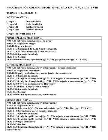 PROGRAM PÓŁKOLONII SPORTOWEJ DLA GRUP: V, VI, VII i VIII TURNUS II: 26-30.01.2015 r. WYCHOWAWCY: Grupa V Grupa VI Grupa VII Grupa VIII Ola Sowińska Ania Sowińska Kaśka Nawacka Marcel Wencel Grupy VII i VIII klasy 4-6 PONIEDZIAŁEK (26.01.2015 r.) 7.00-8.00 zebranie dzieci, podział na grupy 8.00-9.00 wyjście na kręgle 9.00-10.00 gra w kręgle 10.00-11.20 przejazd do Kina Nowe Horyzonty 11.20 - 13.20 film: Niesforny Bram, warsztaty 13.20-14.00 powrót do szkoły 14.00-14.30 obiad 14.30-16.00 warsztaty rękodzieła (gr. V, VI), gry planszowe (gr. VII i VIII) WTOREK (27.01.2015 r.) 7.00-8.00 zebranie dzieci, zabawy integracyjne, drugie śniadanie 8.00-9.00 wyjście na lodowisko 9.00-10.00 pobyt na lodowisku, nauka jazdy z instruktorami 10.00-11.00 powrót do szkoły 11.00-11.45 zajęcia z koszykówki (gr. V i VI), zajęcia z samoobrony (gr. VII i VIII) 11.45-12.30 zajęcia z koszykówki (gr. VII i VIII), zajęcia z samoobrony (gr. V i VI) 12.30-13.00 wyjście do Kina Nowe Horyzonty 13.00- 14.30 film: Kłopoty Pana Patyka 14.30-15.00 powrót do szkoły 15.00-15.30 obiad 15.30-16.00 zabawy rekreacyjne, odbiór dzieci ŚRODA (28.01.2015 r.) 7.00-8.20 zebranie dzieci, zabawy integracyjne 8.20-9.00 wyjście do ZOO 9.00-10.00 lekcja w ZOO: Na końcach świata (gr. V i VI) i Płazy (gr. VII i VIII) 10.00-11.00 zwiedzanie ZOO, drugie śniadanie 11.00-11.30 powrót do szkoły 11.30-12.30 zajęcia z piłki nożnej (gr. V i VI), zajęcia z samoobrony (gr. VII i VIII) 12.30-13.30 zajęcia z piłki nożnej (gr. VII i VIII), zajęcia z samoobrony (gr. V i VI) 13.30-14.00 gry planszowe 14.00-14.30 obiad 14.30-16.00 zajęcia z koszykówki (gr. V i VI), zajęcia z samoobrony (gr. VII i VIII), odbiór dzieci CZWARTEK ( 29.01.2015 r.) 7.00-8.00 zebranie dzieci, zabawy integracyjne, drugie śniadanie 8.00-9.30 warsztaty rękodzieła (gr. V i VI)/trening piłki nożnej (gr. VII i VIII) 9.30-11.00 warsztaty rękodzieła (gr. VII i VIII)/ trening piłki nożnej (gr. V i VI) 11.00-11.50 wyjście do Centrum Poznawczego w Hali Stulecia 11.50-13.20 warsztaty w CP: Projektujemy Ogród (gr. V i VI) 12.05-13.35 warsztaty w CP: Zrób to sam (gr. VII i VIII) 13.20/13.35-14.00 powrót do szkoły 14.00-14.30 obiad 14.30-15.30 zajęcia z koszykówki (gr. VII i VIII), zajęcia z samoobrony (gr. V i VI) PIĄTEK( 30.01.2015 r.) 7.00-8.00 zebranie dzieci, zabawy integracyjne, drugie śniadanie 8.00-9.00 wyjście na lodowisko 9.00-10.00 pobyt na lodowisku, nauka i doskonalenie jazdy z instruktorami 10.00-11.00 dojazd na warsztaty (Gimnazjum nr 15) 11.00-13.00 warsztaty na ergometrach wioślarskich 13.00-14.00 powrót do szkoły 14.00-14.30 obiad 14.30-15.30 gry planszowe 15.30-16.00 zabawy rekreacyjne, odbiór dzieci UWAGA RODZICE! 1. Dzieci pierwszego dnia półkolonii będą podzielone na grupy pod względem wieku i ewentualnych przyjaźni, proszę by dzieci/rodzeństwa, które chcą być w jednej grupie zgłaszały to podczas podziału. Listy podziału zostaną wywieszane na tablicach przy klasach. 2. Proszę, aby przyprowadzali Państwo dzieci do godz. 8.00, jeśli są wycieczki i mamy umówione warsztaty, wychowawcy zbierają grupy i wychodzą o umówionej godzinie. 3. Podczas półkolonii będą odbywały się zajęcia sportowe-proszę zaopatrzyć dzieci codziennie w strój sportowy (świeża koszulka, spodenki i skarpety), buty zmienne, gumkę do długich włosów! 4. Proszę zaopatrzyć dzieci w bidony/butelki, woda do picia jest na miejscu. 5. Proszę, aby każde dziecko miało ze sobą mały plecak na prowiant i wodę, kiedy wychodzimy na wycieczki 6. Proszę ubierać dzieci odpowiednio do panujących warunków atmosferycznych, 7. Bardzo proszę nie odbierać dzieci w trakcie powrotu z wycieczek, tylko dopiero po powrocie do szkoły. Odbieranie dzieci z grupy przechodzącej po pasach nie jest bezpieczne, a wychowawcy muszą pamiętać, kogo i komu oddają. 8. Na każdych zajęciach i warsztatach są instruktorzy, więc proszę się nie obawiać, że dziecko nie umie jeździć na łyżwach… 9. Na lodowisku wypożyczamy cały sprzęt, nic Państwo nie dopłacają. 10. Proszę by dzieci znały rozmiar buta żeby podać w wypożyczalni na lodowisku i w kręgielni. 11. Proszę nie dawać dzieciom telefonów i gier, bez tego będzie dobra zabawa .