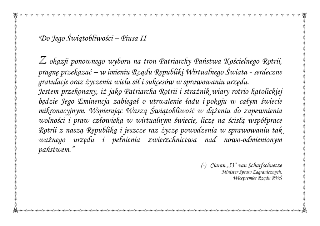 "Do Jego Świątobliwości – Piusa II Z okazji ponownego wyboru na tron Patriarchy Państwa Kościelnego Rotrii, pragnę przekazać – w imieniu Rządu Republiki Wirtualnego Świata - serdeczne gratulacje oraz Ŝyczenia wielu sił i sukcesów w sprawowaniu urzędu. Jestem przekonany, iŜ jako Patriarcha Rotrii i straŜnik wiary rotrio-katolickiej będzie Jego Eminencja zabiegał o utrwalenie ładu i pokoju w całym świecie mikronacyjnym. Wspierając Waszą Świątobliwość w dąŜeniu do zapewnienia wolności i praw człowieka w wirtualnym świecie, liczę na ścisłą współpracę Rotrii z naszą Republiką i jeszcze raz Ŝyczę powodzenia w sprawowaniu tak waŜnego urzędu i pełnienia zwierzchnictwa nad nowo-odmienionym państwem.” (-) Ciaran „53” van Scharfschuetze Minister Spraw Zagranicznych, Wicepremier Rządu RWŚ